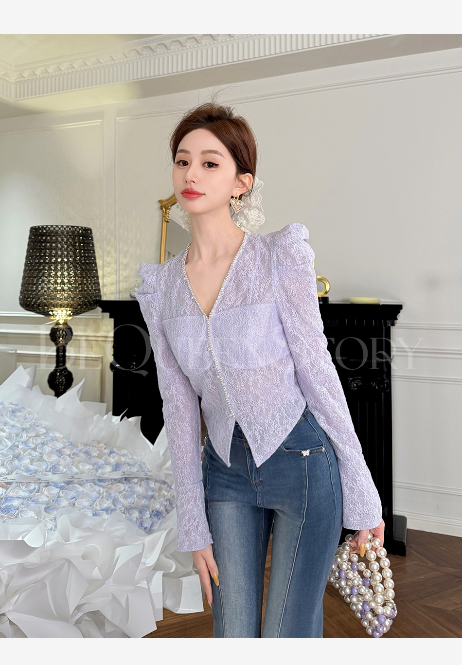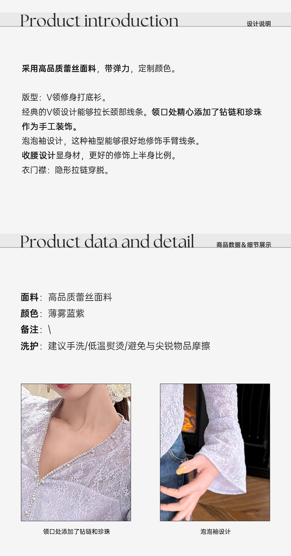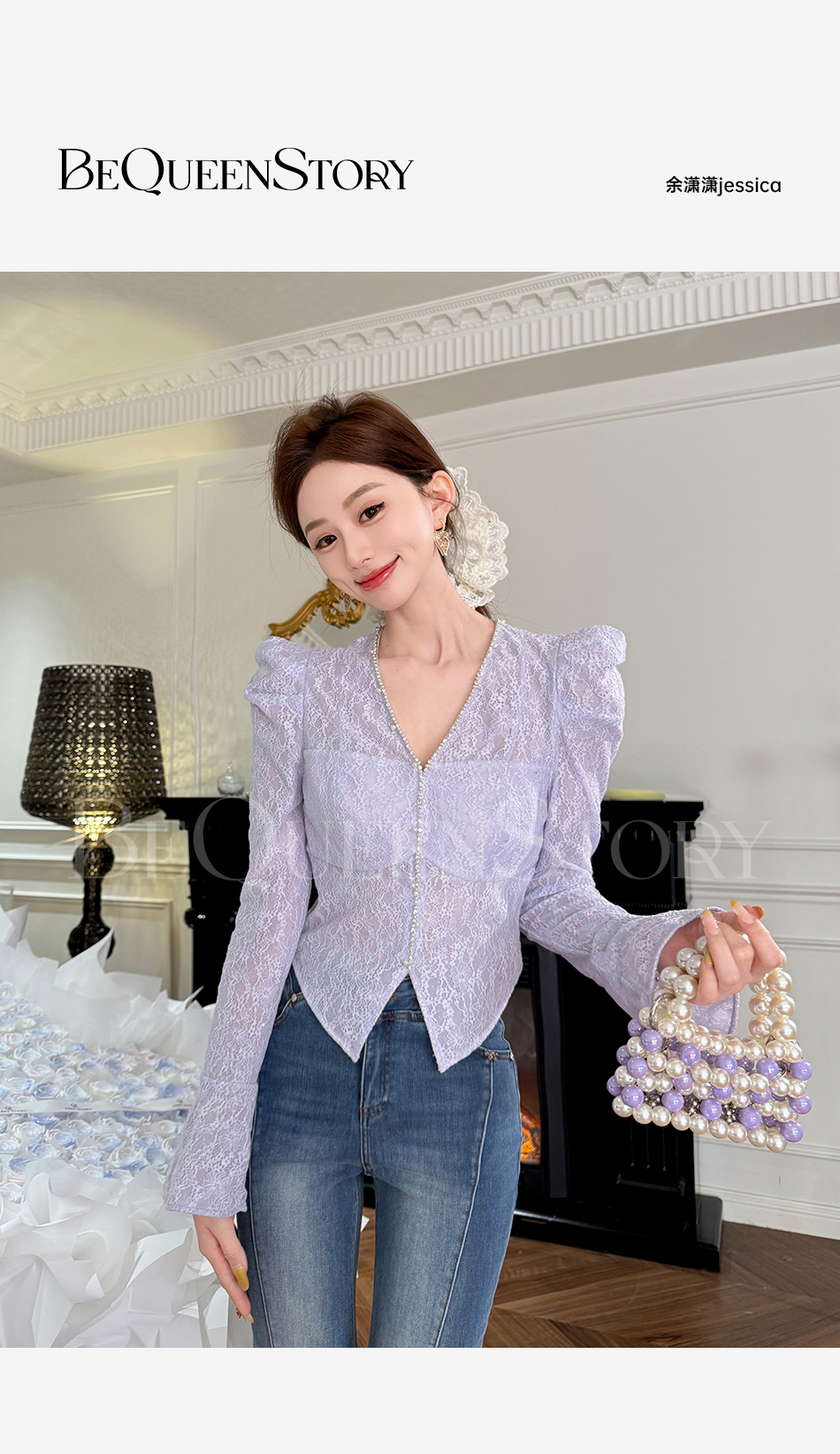 余潇潇【千颂物语】显瘦气质新品弹力蕾丝钻链珍珠V领修身打底衫