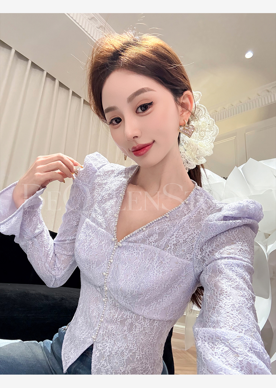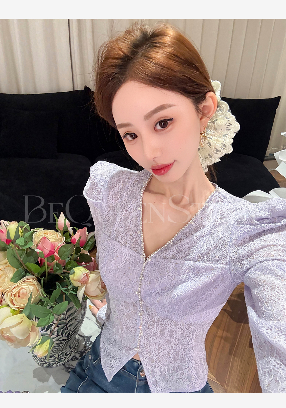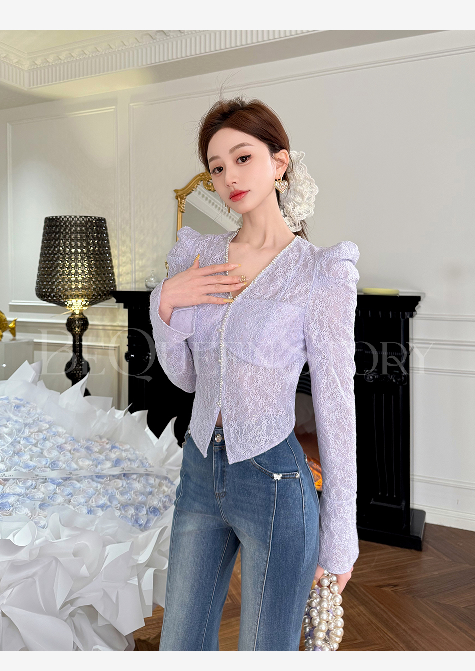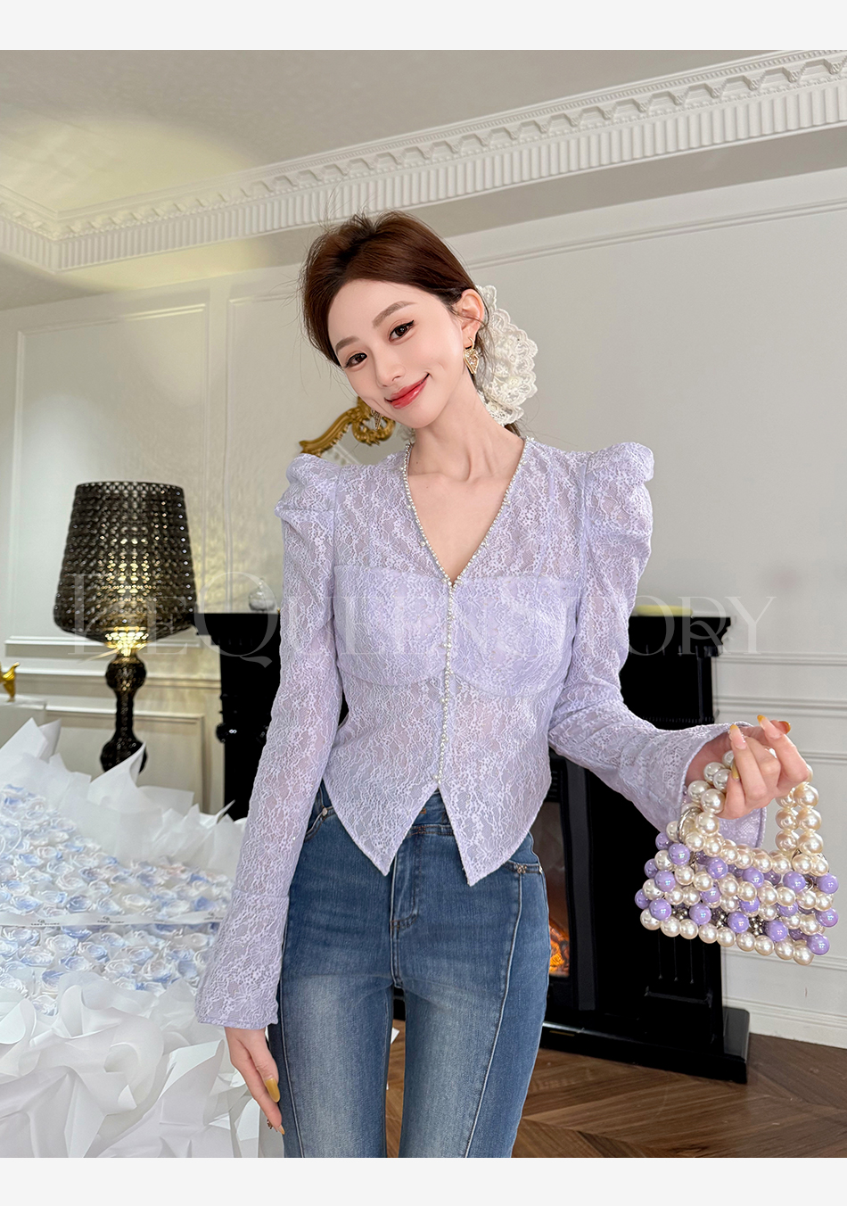 余潇潇【千颂物语】显瘦气质新品弹力蕾丝钻链珍珠V领修身打底衫