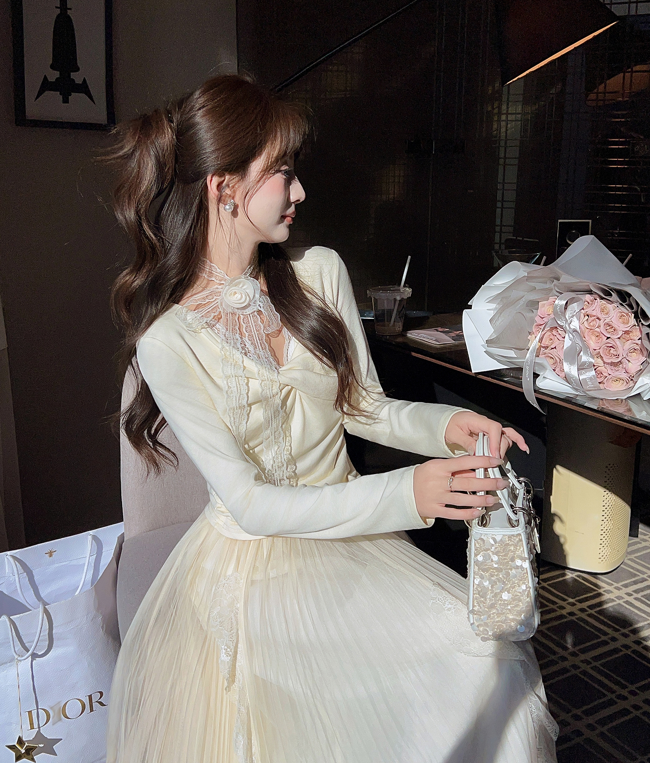张心子【瑰丽酒会】名媛风方领波浪拼接纱裙连衣裙 U2504031