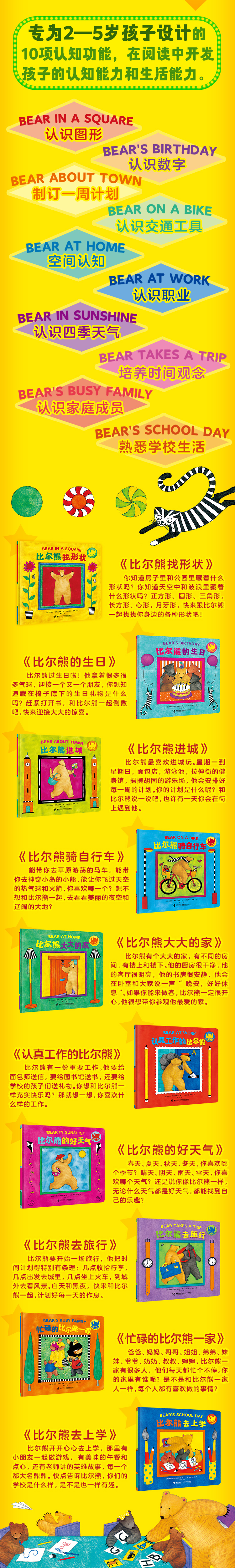 《比尔熊幼儿认知双语故事》引进于英国非常知名的出版社barefoot,由英国*擅用色彩的童书画家黛比哈特为低龄的小宝宝们量身定做,是风靡欧洲的畅销童书。大大的比尔熊形象、憨态可掬的动作得到很多小朋友的喜爱。 在该套系10个简短有趣的故事里,比尔熊带领小朋友们认识自己的家、认识四季和天气、认识形状、认识家庭成员、认识交通工具、认识形状、认识场所和星期等等,增长知识的同时开发宝宝语言潜能。而亮丽的颜色也是本套书吸引孩子眼球的地方,作者的用心加上其多年的配色经验,让孩子们能够可以直接感受到五彩斑斓的色彩世界。总之 ,这套小熊比尔系列有着重复简单的语言,类别多样的常用单词,郎朗上口的韵律,再加上附赠原汁原味的英文音频,以及儿童文学家常立老师流畅的译文 ,是2-5岁孩子家庭双语启蒙强有力的辅助读物。