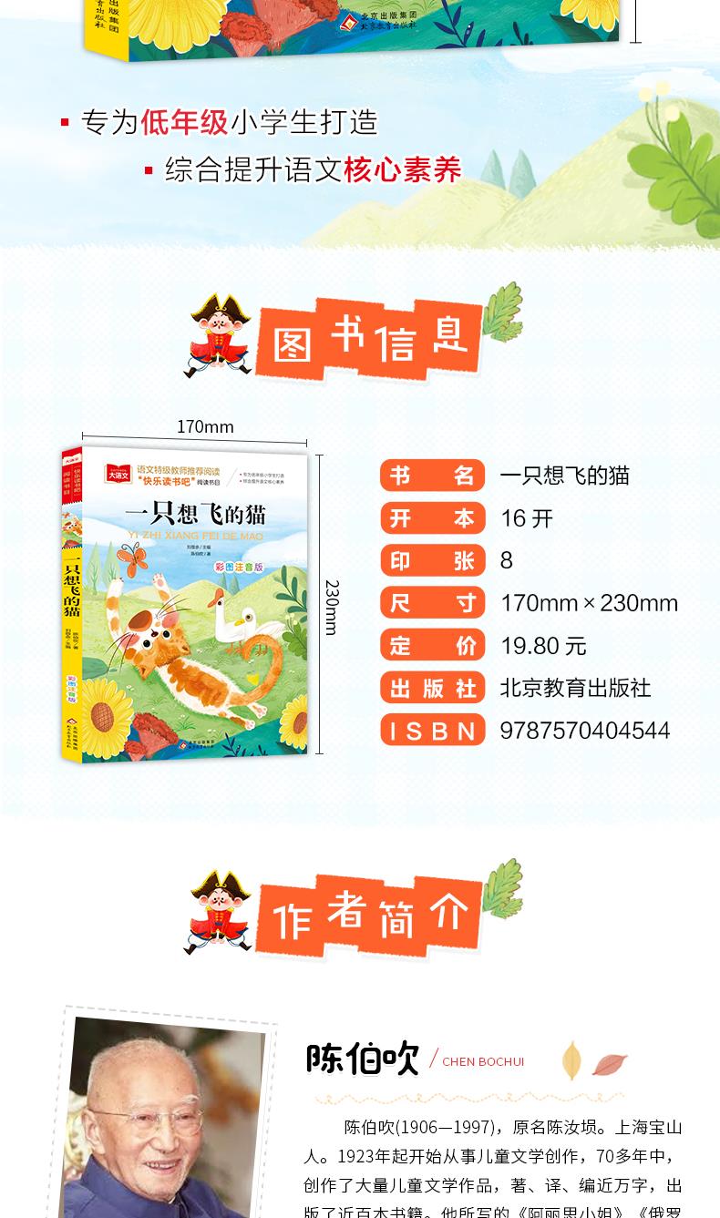 《一只想飞的猫》收录了著名儿童文学作家陈伯吹的几篇作品,其中《一只想飞的猫》非常有名。该篇发表于1955年,是一篇针对建国初期某些娇生惯养的儿童骄傲自大、好逸恶劳等缺点所写的讽刺故事。作品叙述了一只喜欢自吹自擂的猫厌恶劳动、顽皮无礼,不切实际地一心想飞而终于摔了跟头的故事,充满了轻松幽默的喜剧色彩。作者将幻想和现实和谐地结合起来,在这只顽皮的猫身上非常巧妙地表现了淘气儿童的性格。由于作者熟悉儿童,作品中的许多细节准确细致地表现了儿童在特定状态下的微妙心理。