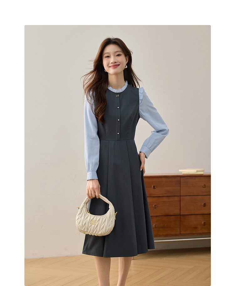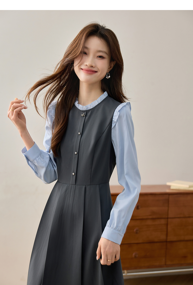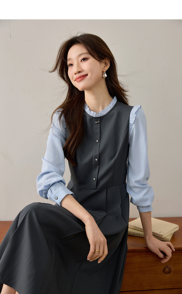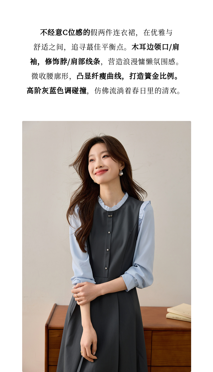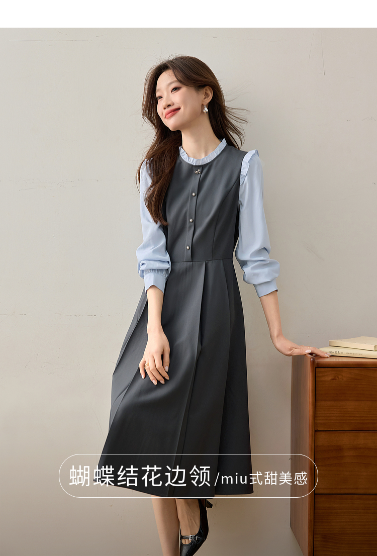 【1件75折】熙世界假两件木耳边长袖连衣裙女2025春新款通勤上班气质显瘦裙子