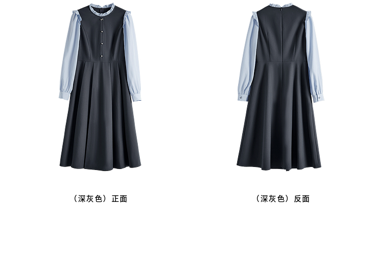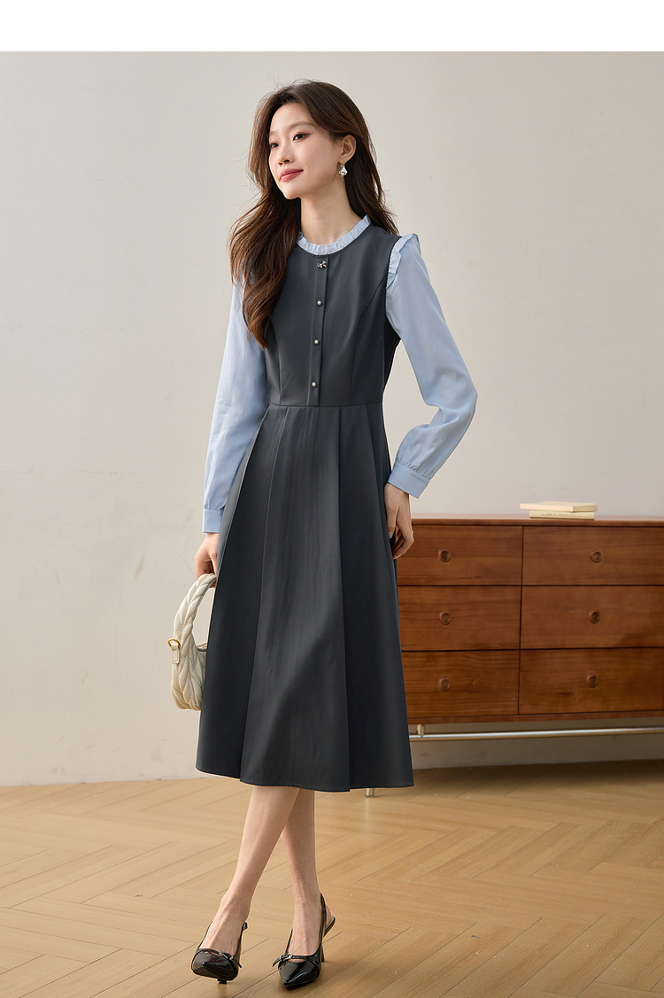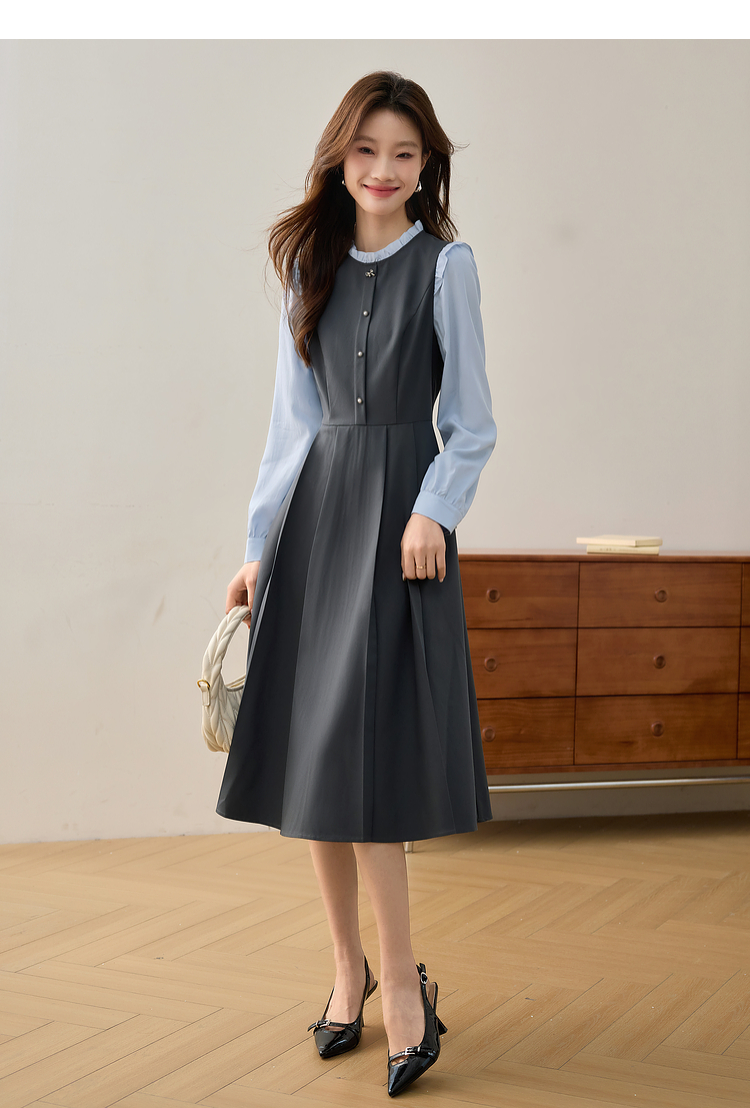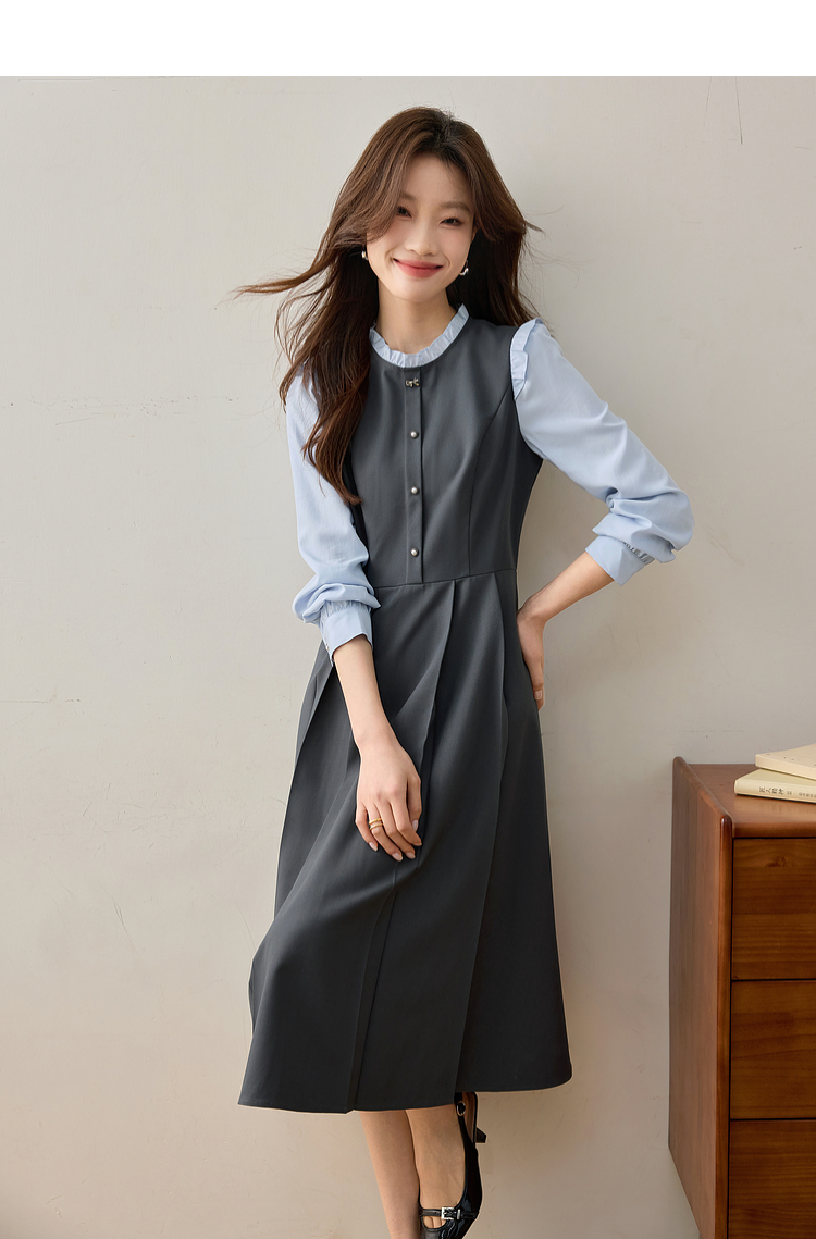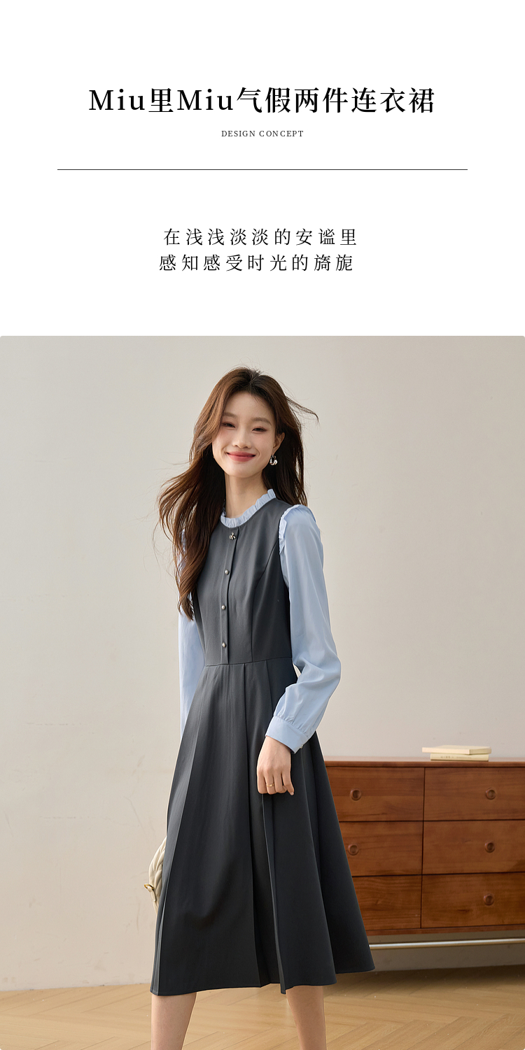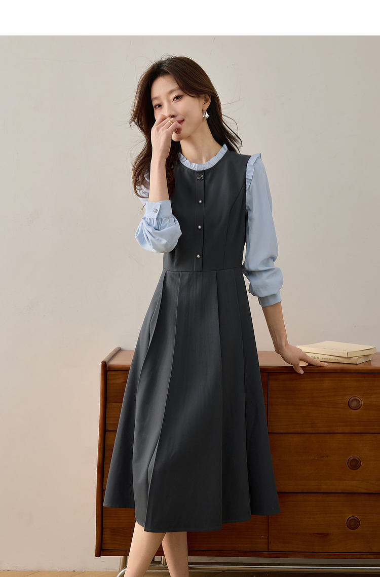【1件75折】熙世界假两件木耳边长袖连衣裙女2025春新款通勤上班气质显瘦裙子
