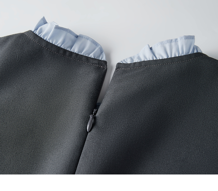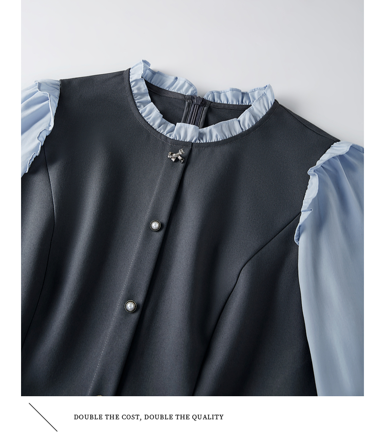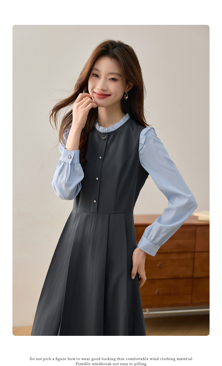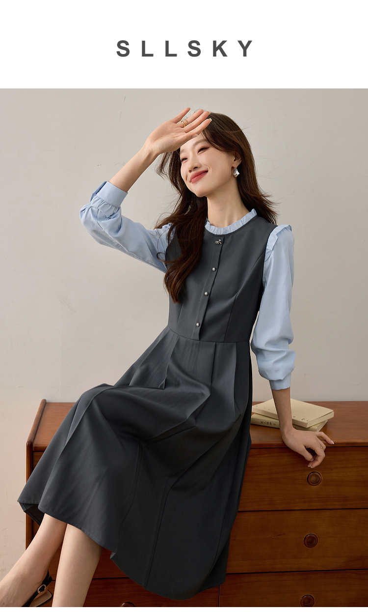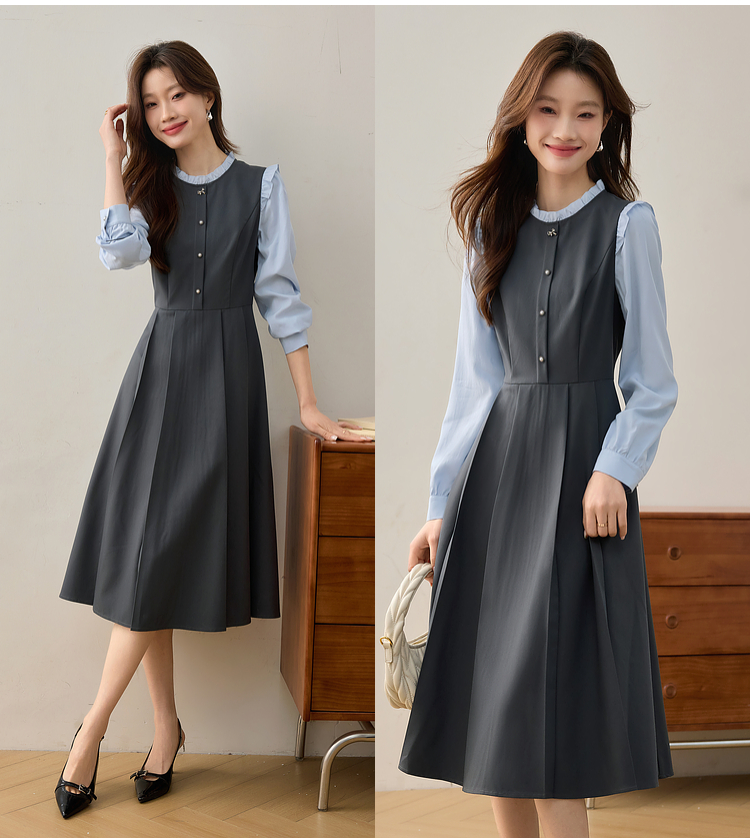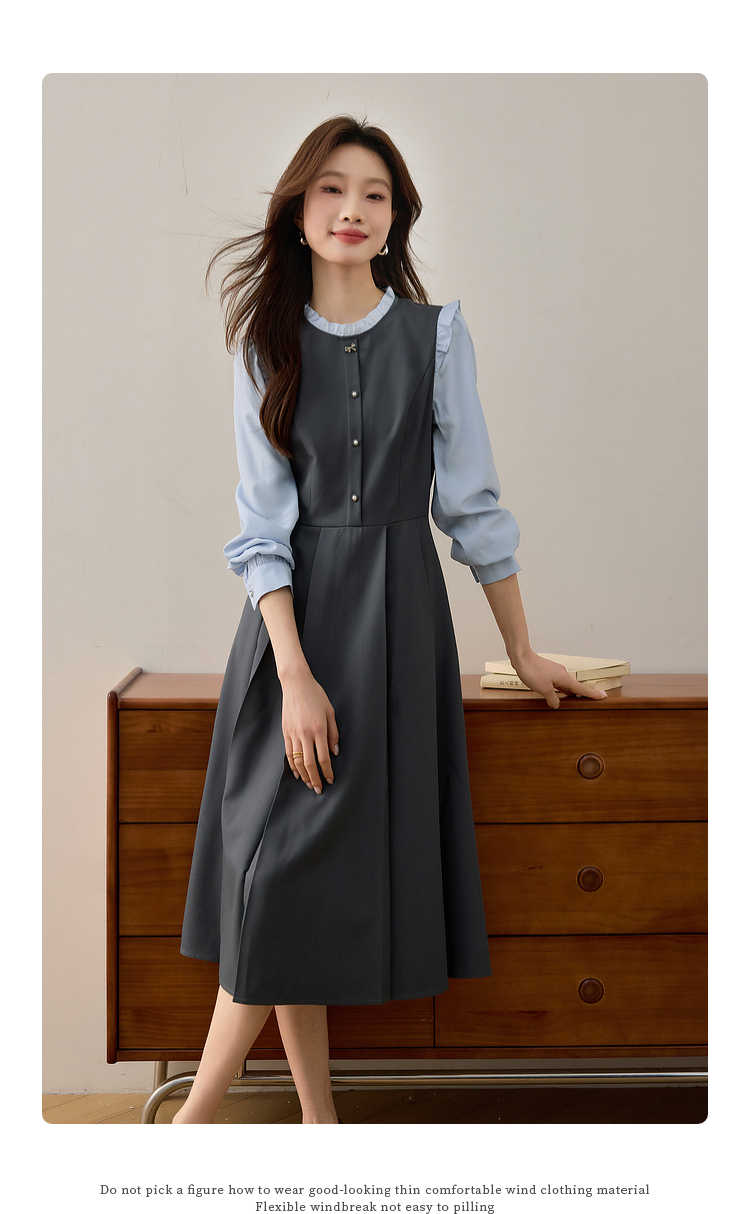 【1件75折】熙世界假两件木耳边长袖连衣裙女2025春新款通勤上班气质显瘦裙子