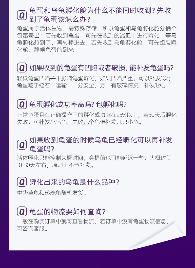 因乌龟蛋产品特殊,购买了养龟套餐的规格不支持7天无理由退换哦,感谢理解。养殖舱与乌龟蛋分开发货,如收到舱后还未收到蛋,请耐心等待3天,也可以联系客服要物流单号。
