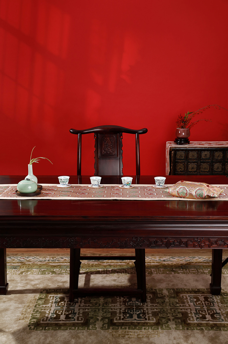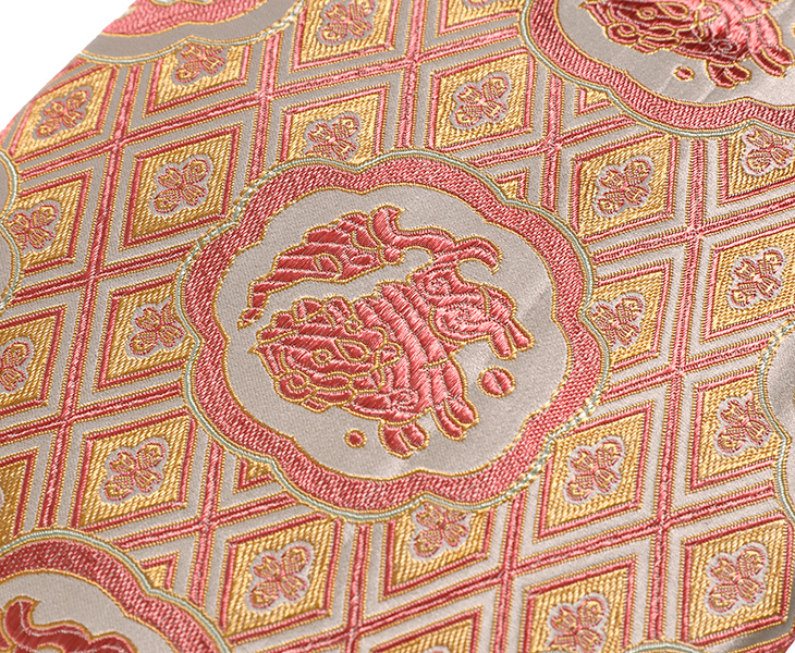 源自元代,主体图案是狮子小团花,地纹为菱形纹,再填八宝相花。小狮子生动活泼。整个纹锦构成一幅轻松灵动的画面。狮子是兽中之王,是现在人们公认的瑞兽,有驱邪避恶、祈保平安之寓意。