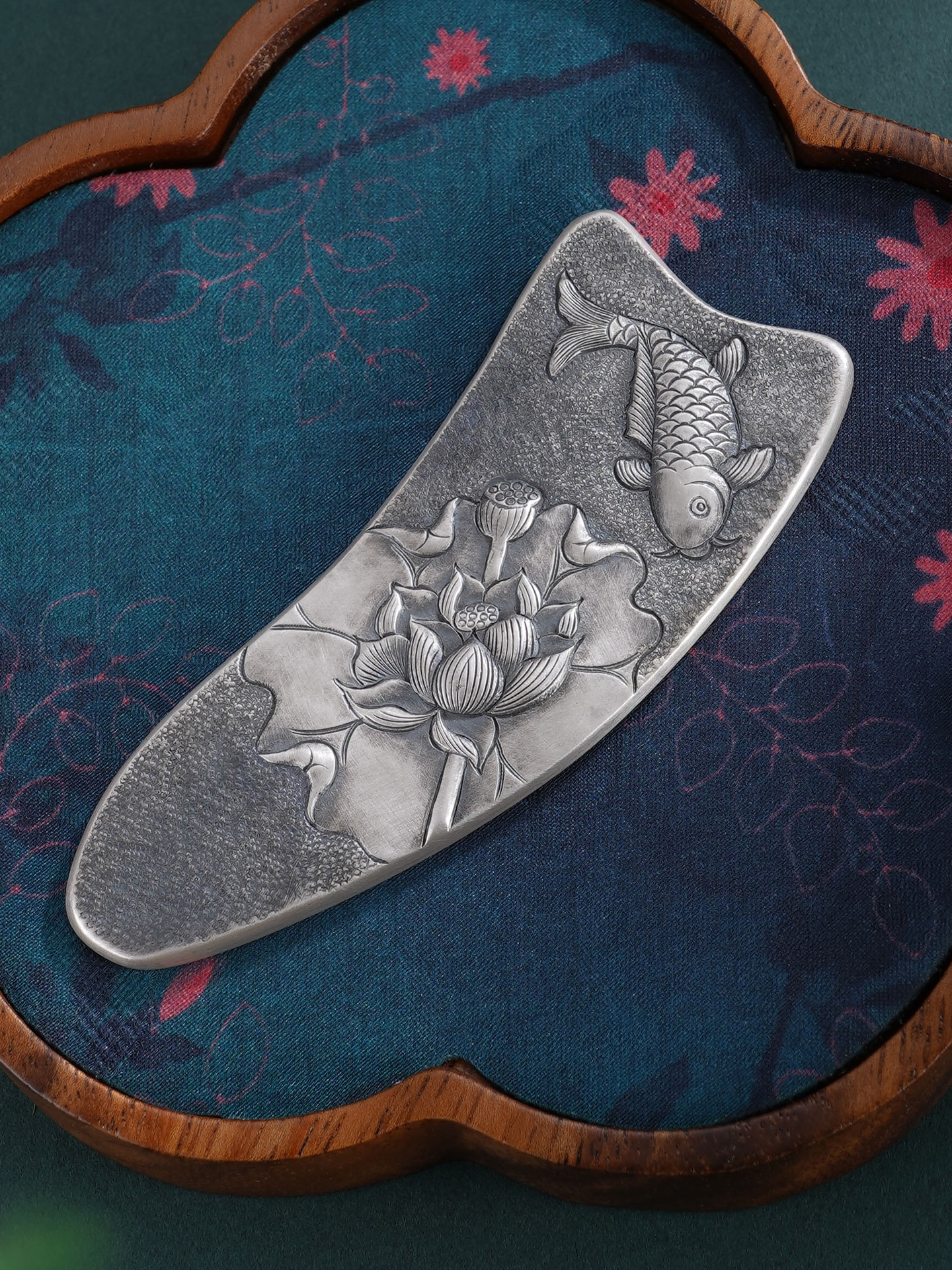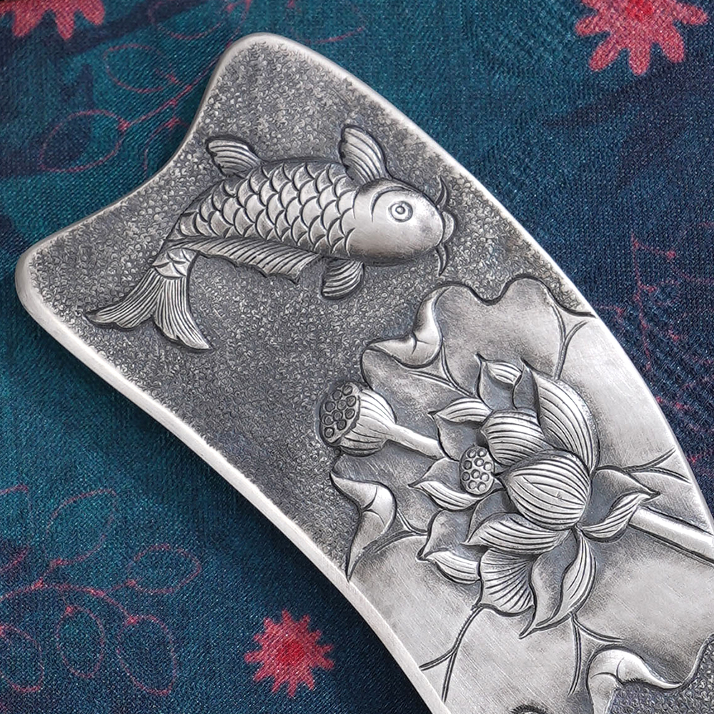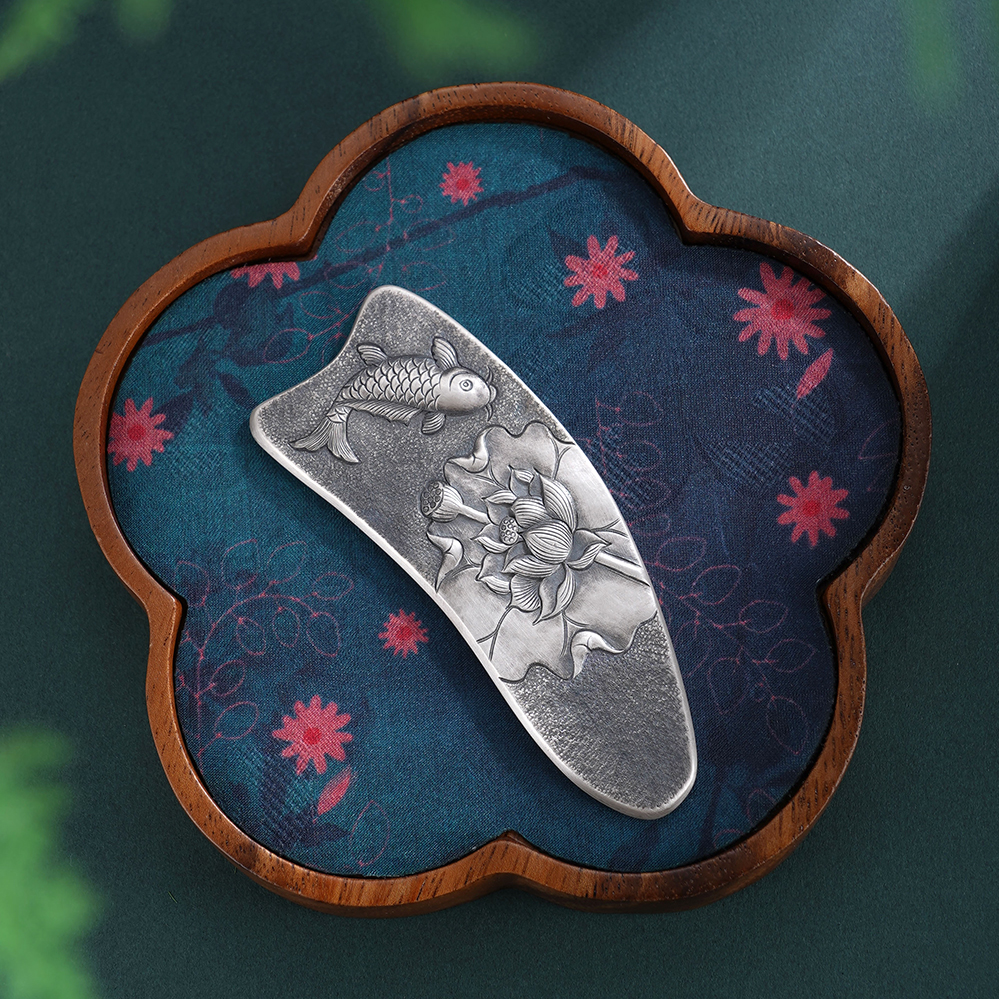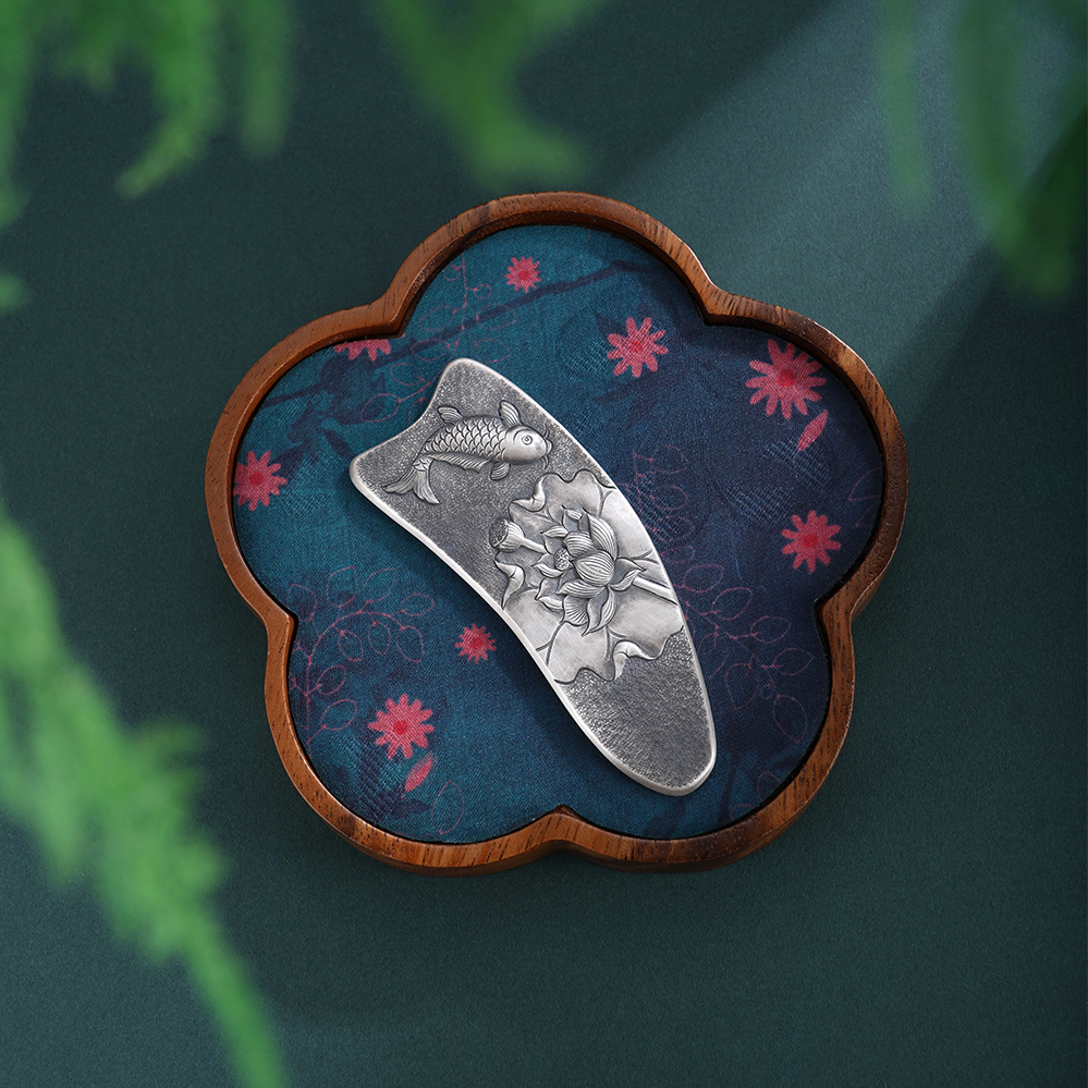 【寓意】:作品以传统錾刻技艺精铸,莲花与鲤鱼纹样灵动相映,栩栩如生。既凝莲华之清雅,又寓“连年有余”之吉,寄托美好期许。