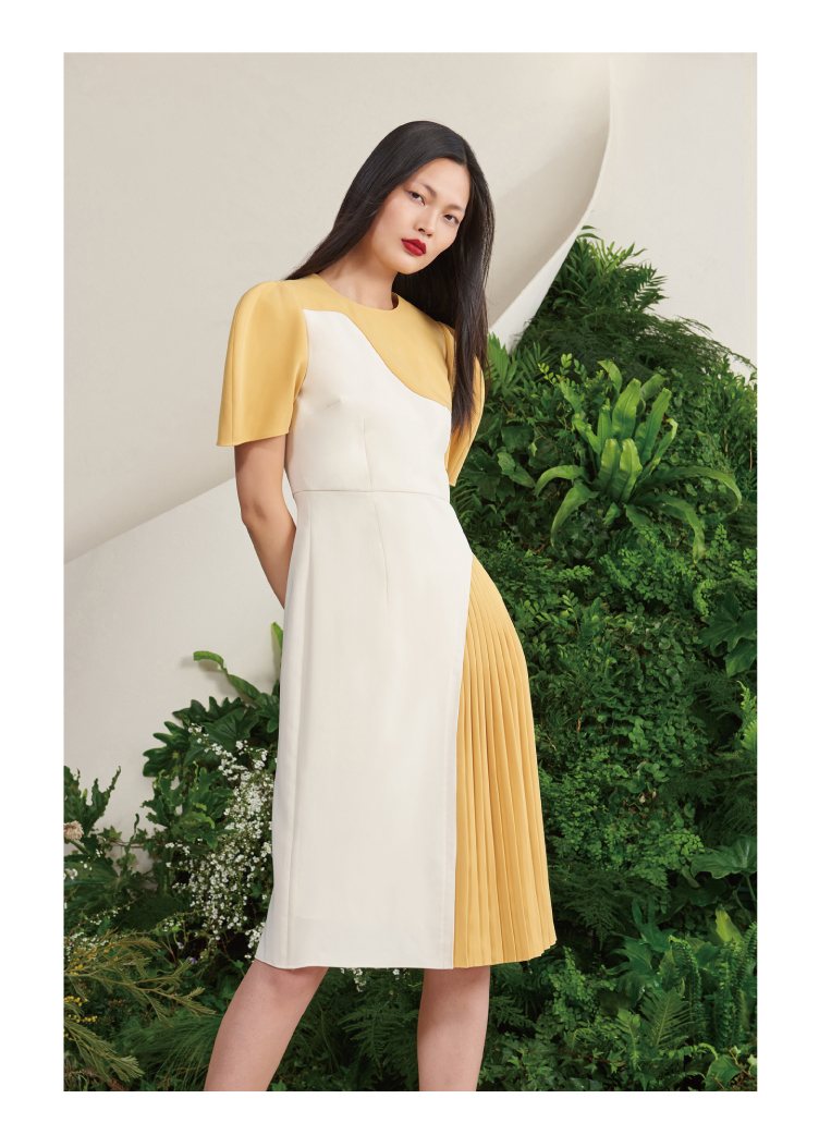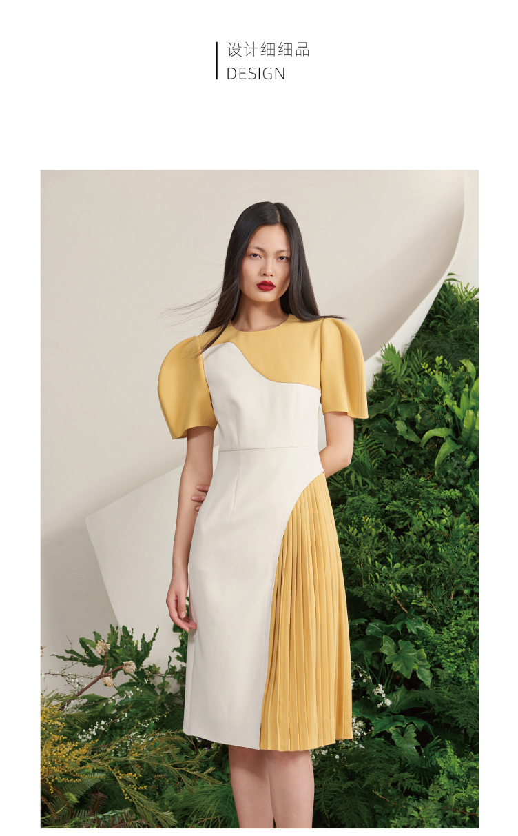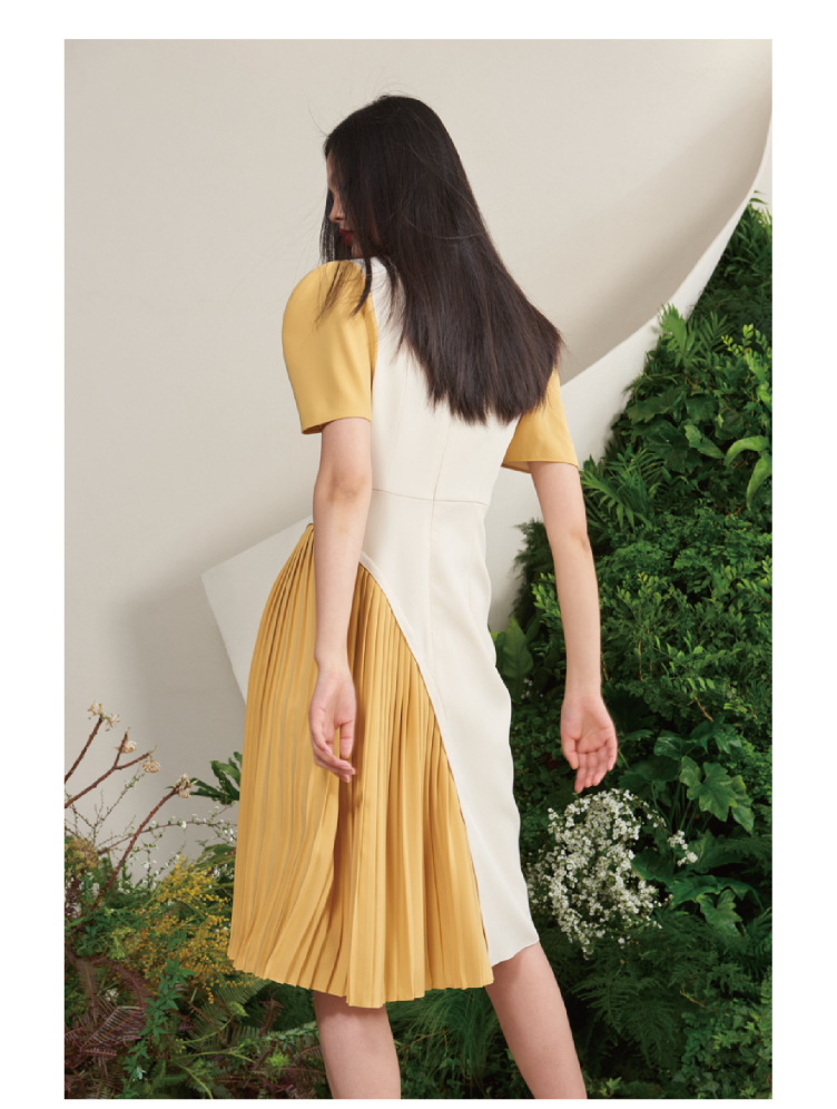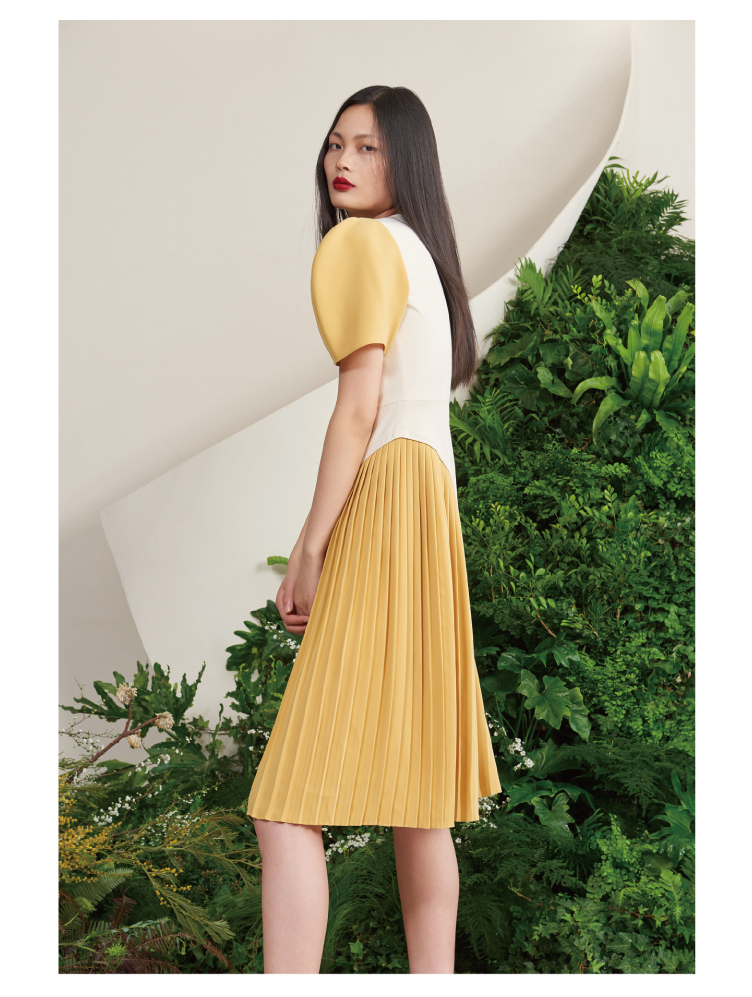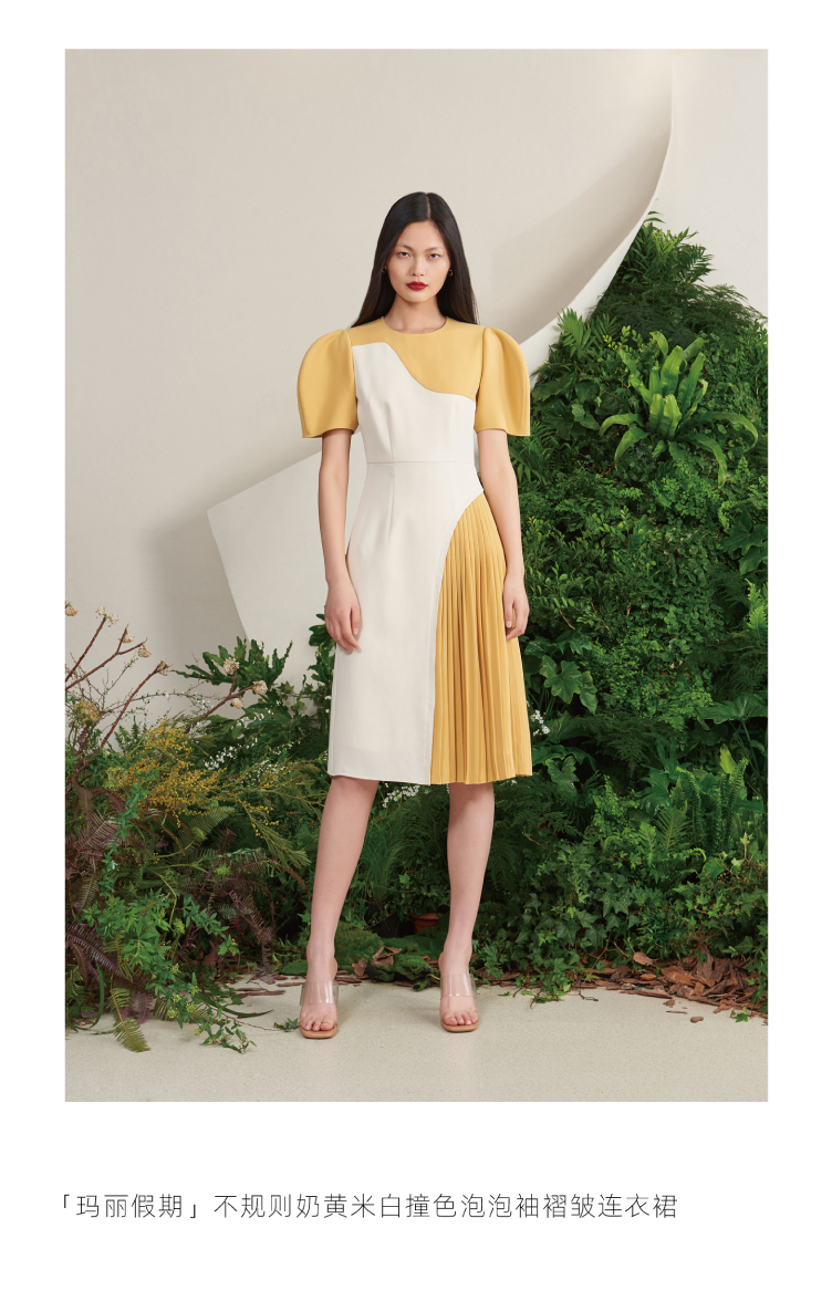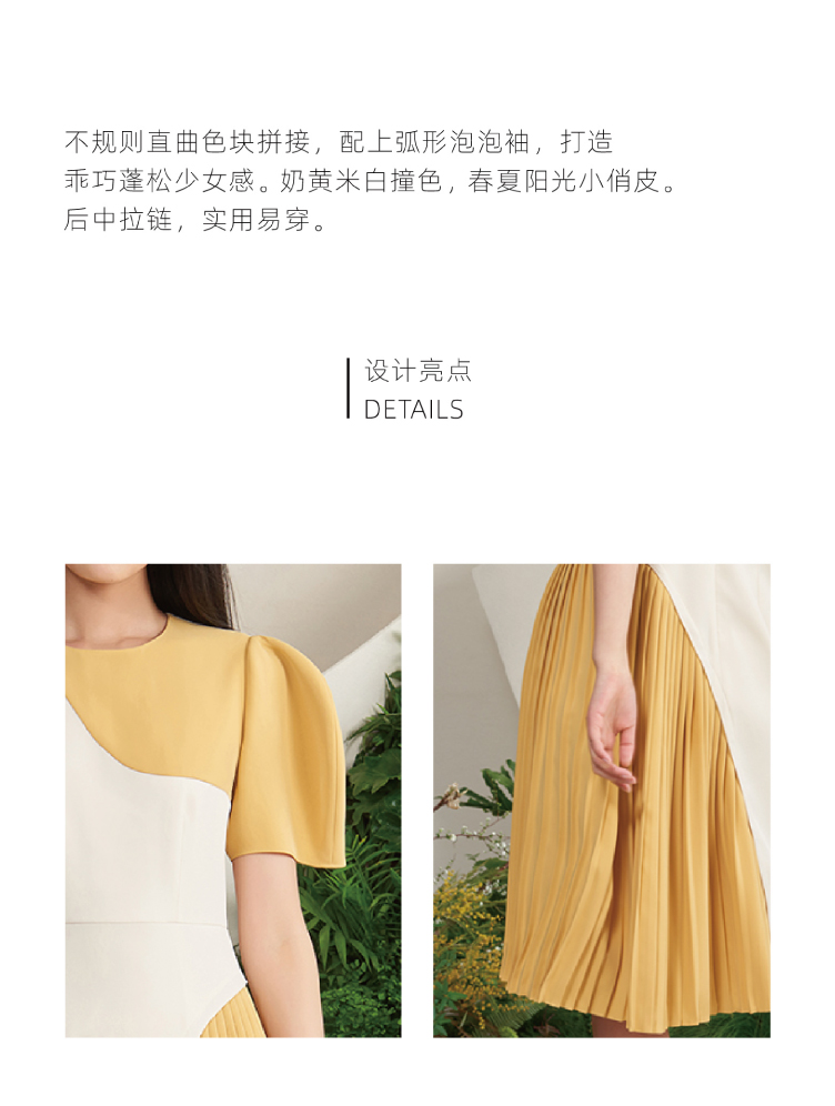 【玛丽假期】不规则奶黄米白撞色泡泡袖褶皱连衣裙/0000651