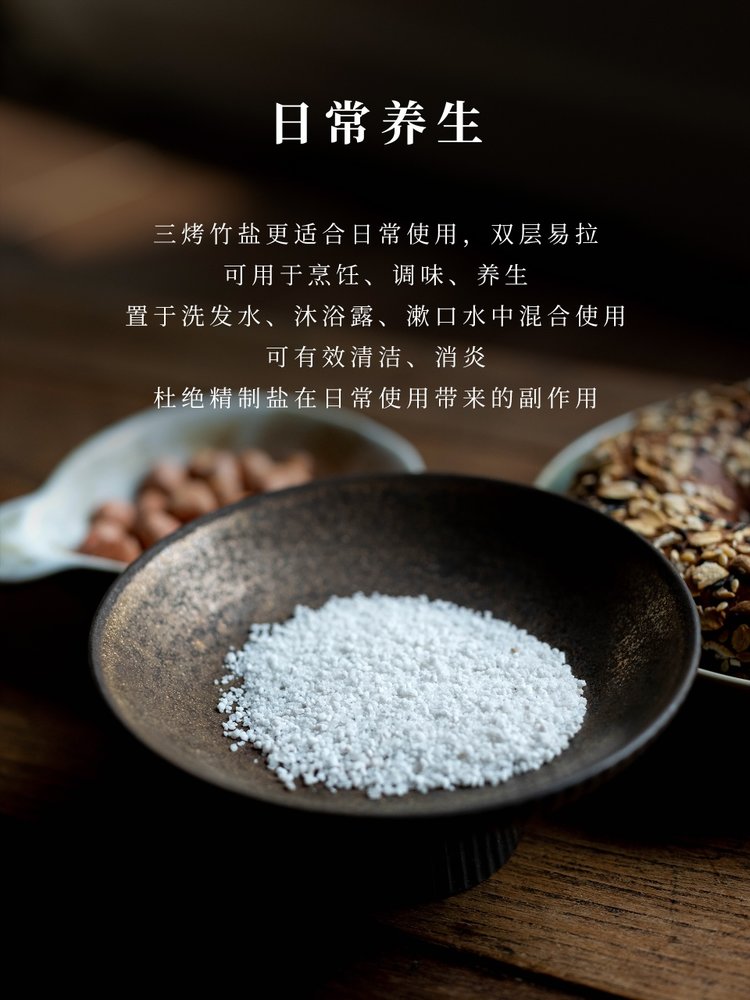 4.三烤竹盐风味为咸,甘,鲜,生津止渴,普通精制盐为咸,苦,涩,久用口渴;