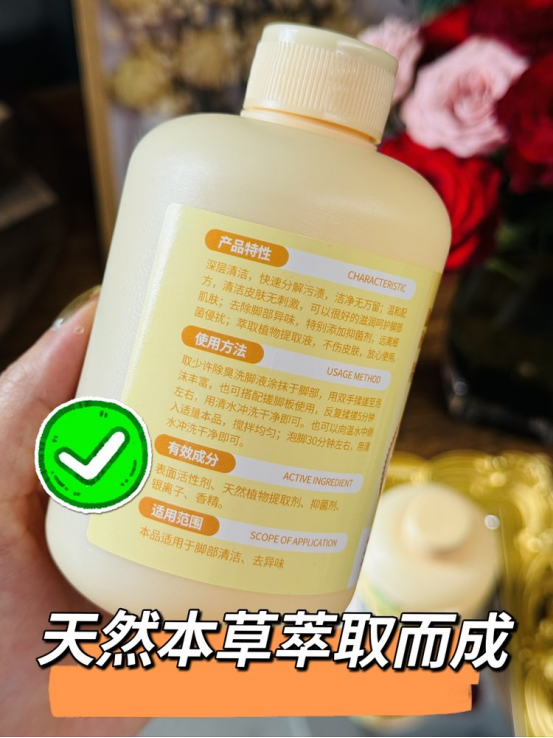 🔻而且,它的味道非常清新 不会有刺鼻的气味 独特的香味还能“镇压”恶臭! 大牌同款,淡淡清香 市面上大部分的脚气产品 都是靠香精强行遮盖臭味 那股子香臭味反而让人难以忍受! 这款除臭洗脚液就不一样了 天然草本配方🍃具有更强的净化、清新效果! 不仅脚臭味快速消失无踪 而且散发的植物清香 芬芳不刺鼻,闻着神清气爽~