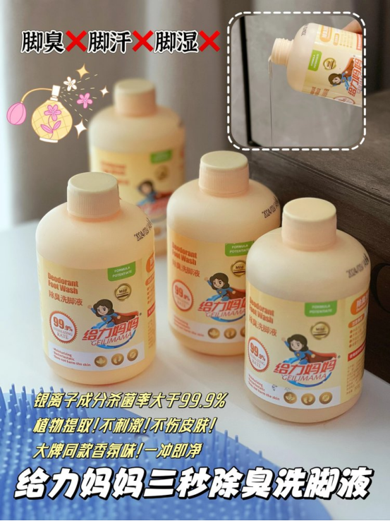 与市面上普通的脚臭喷雾不同 给力妈妈三秒除臭液专门针对足部问题研发 纯植物精粹的抗菌洗脚液! 预防+治理,双管齐下! 容易脚臭、脚酸、脚汗、脚湿的一定要试一下 必入理由👇 ✅银离子成分杀菌率大于99.9% ✅植物萃取天然表活,温和清洁 ✅专门对付金黄色葡萄球菌,从深层分解异味菌群 ✅有效抑菌,去除异味,温和清洁 ✅大牌同款香氛味,淡淡植物清香 ✅成分温和不刺激,不伤皮肤,小孩大人都能用