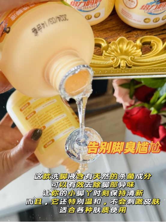 🔻给力妈妈洗脚液的使用非常方便 只需要将适量的洗脚液倒入温水中 搅拌均匀后 将脚放入水中浸泡 15-20 分钟即可 使用后,用清水冲洗干净即可 每晚脚丫携带的大量细菌、脏东西 用洗脚液瞬间清除,温和呵护足部 让脚丫挣脱枷锁,自由呼吸~ 除了直接用来洗脚以外 还可以用来洗鞋洗袜子 对袜子上消毒杀菌也很有效果!