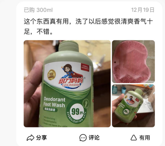 品牌方承诺无效退款⚠️ 敢于承诺无效退款就一定有效果⚠️ 天气马上就要热起来了 家里有脚臭老公的一定离不开这个三秒除臭液 给力妈妈专注数十年高端日化! 把所有心思都放在配方和工艺上 国内很多家庭都在用的高端品牌 这款洗脚液的主要功效是除臭和杀菌 ✅它含有天然的抗菌成分和Ag+银离子 主打除菌除味!可以有效地杀死脚部细菌 从而减少脚部异味的产生 ✅而且它还特别温和,不会刺激皮肤! 用它洗脚就像给脚部做了一场 SPA! 舒服极了!