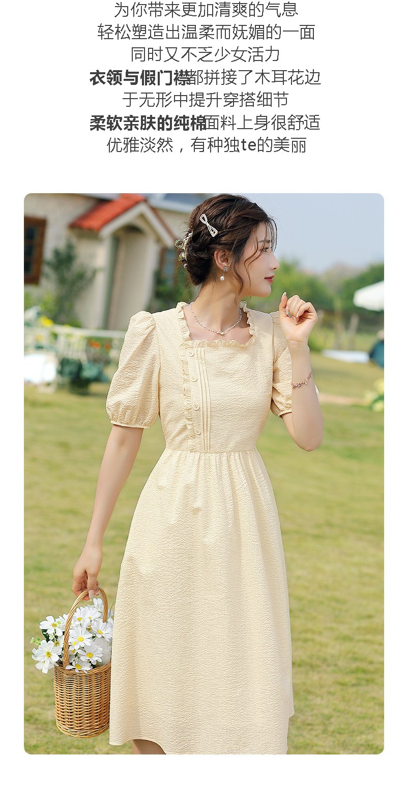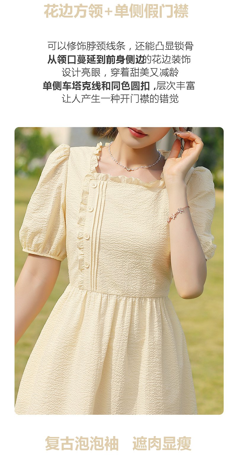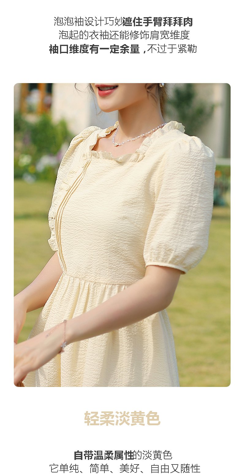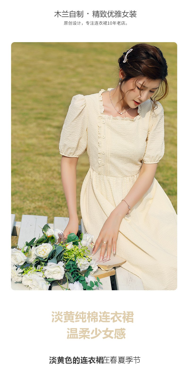 勿忘花黄色纯棉方领连衣裙女夏2025年夏季新款法式收腰泡泡袖裙子