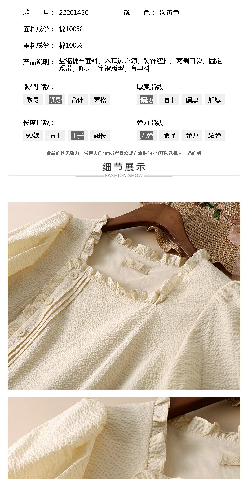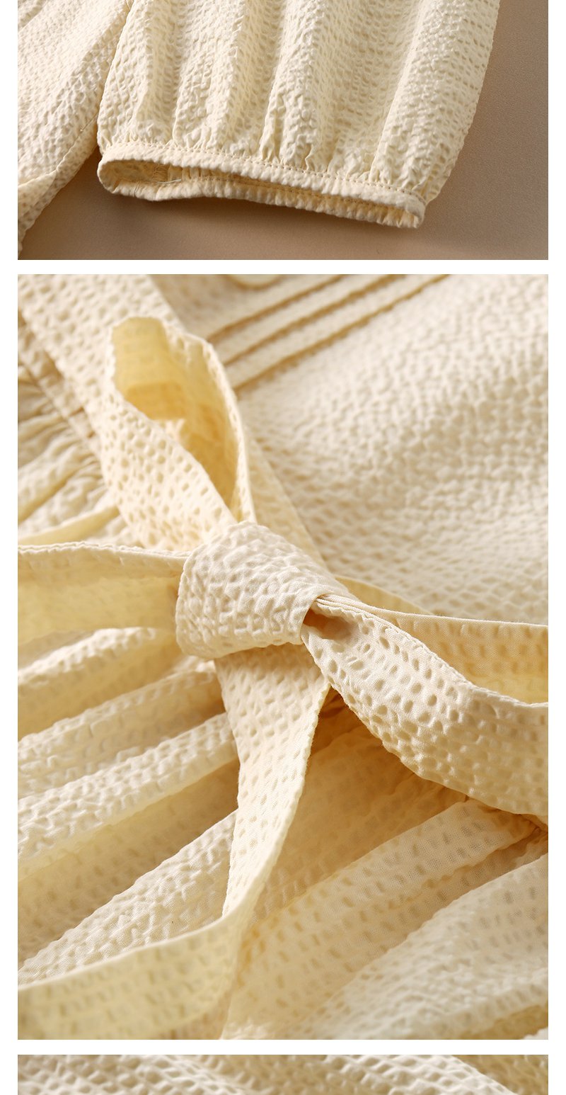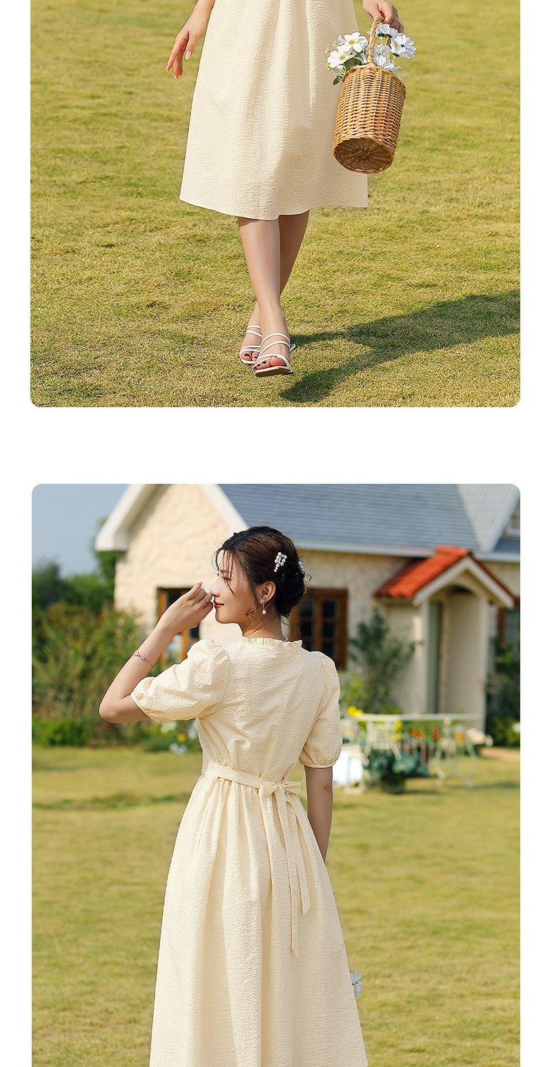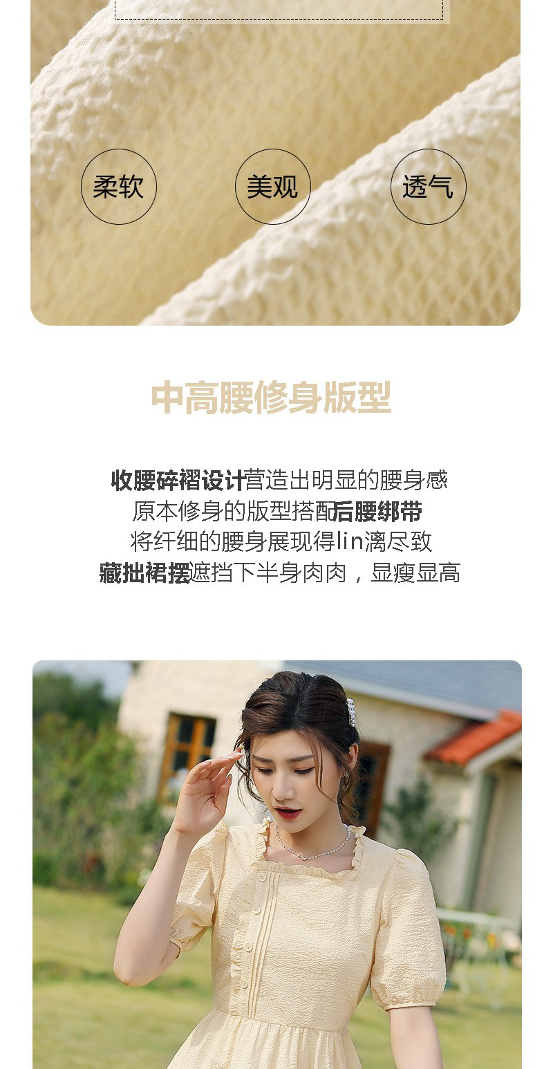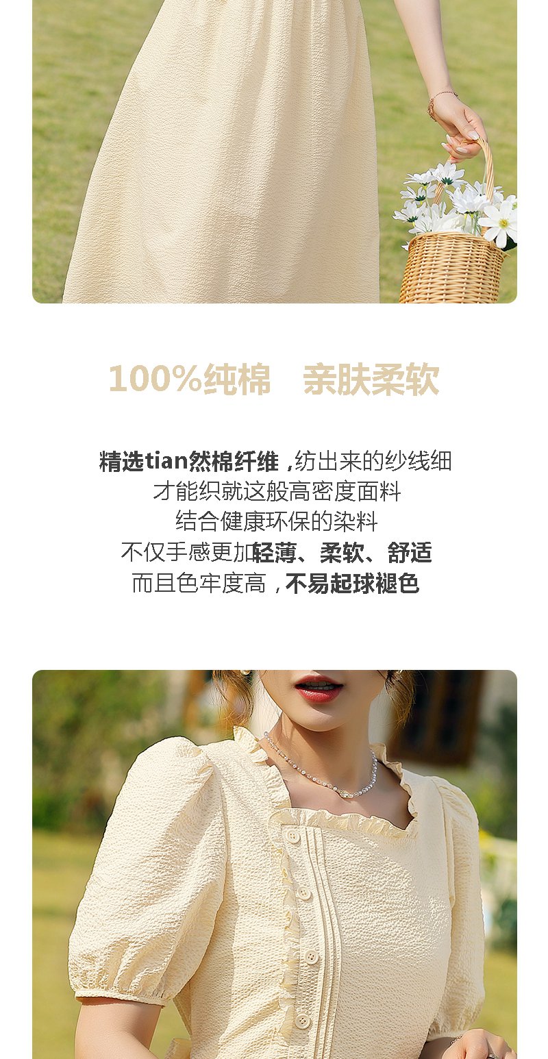 勿忘花黄色纯棉方领连衣裙女夏2025年夏季新款法式收腰泡泡袖裙子