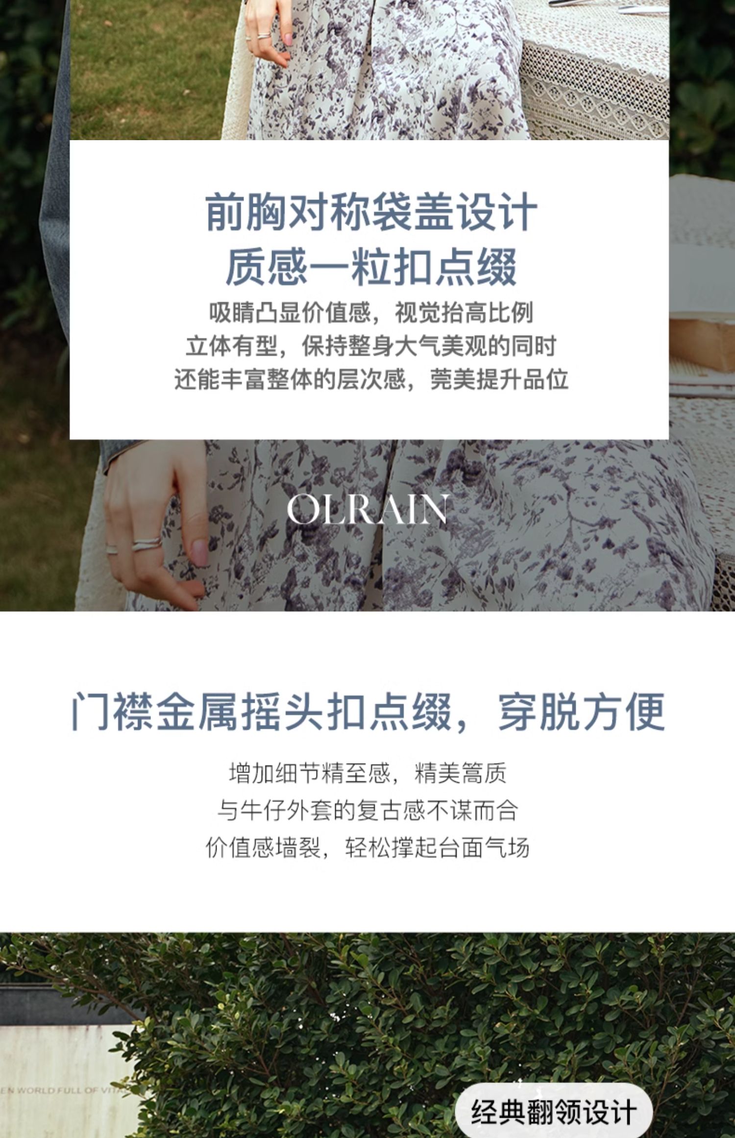 - “精致”是欧芮儿olrain品牌文化的核心,欧芮儿认为,精致的女人,不但要外在动人,更要内在迷人,内外兼修,有魅力、有气质、有内涵,自信而不自傲,优雅而不矫揉,自有万种风情而不轻浮,更不故作矜持。