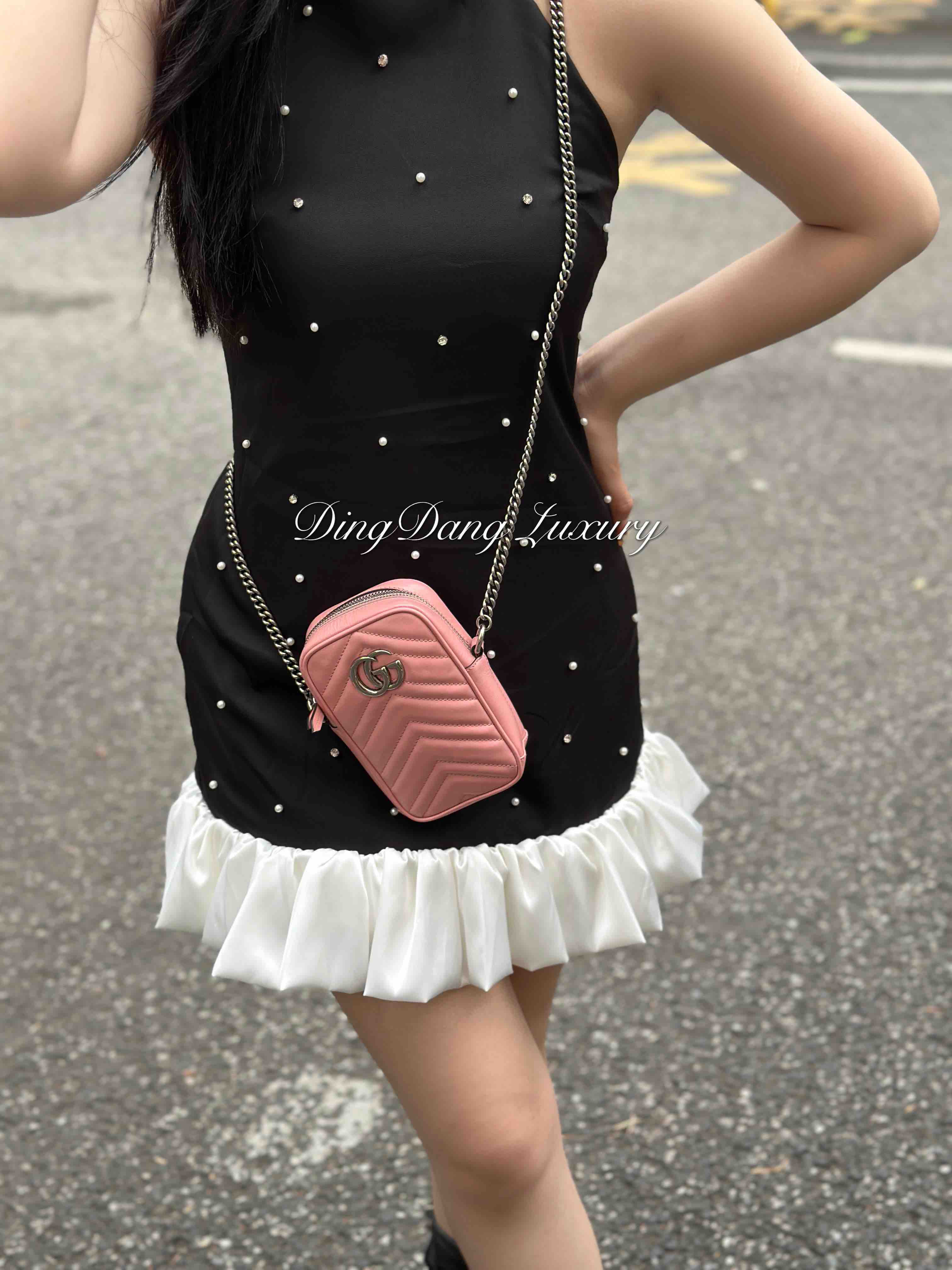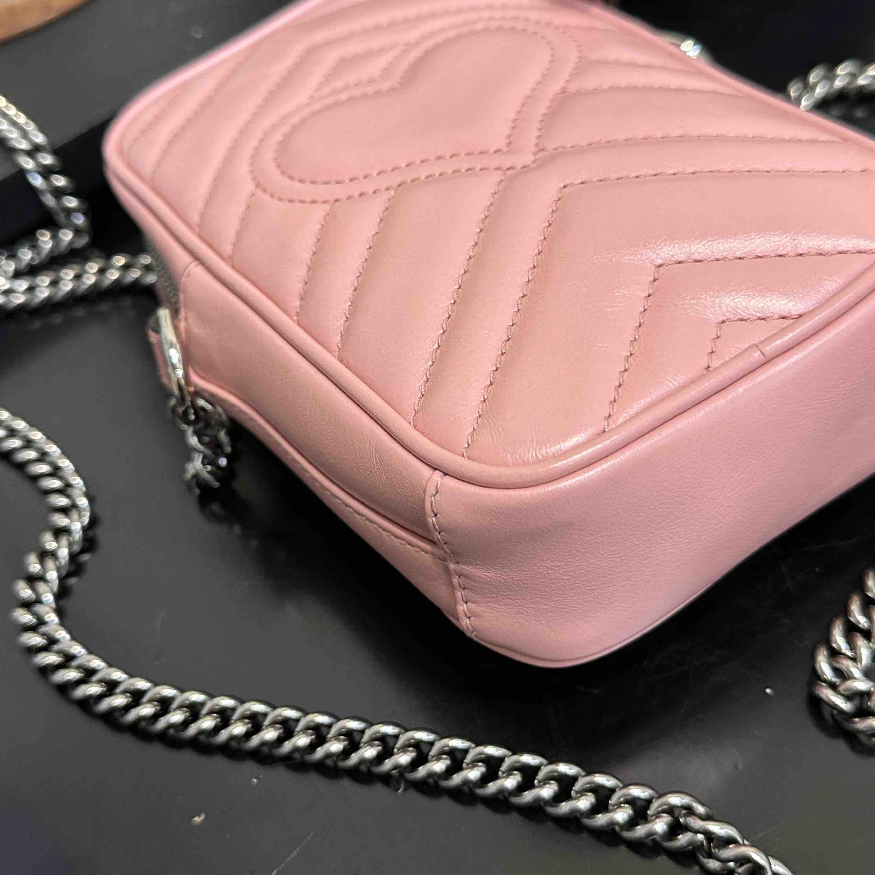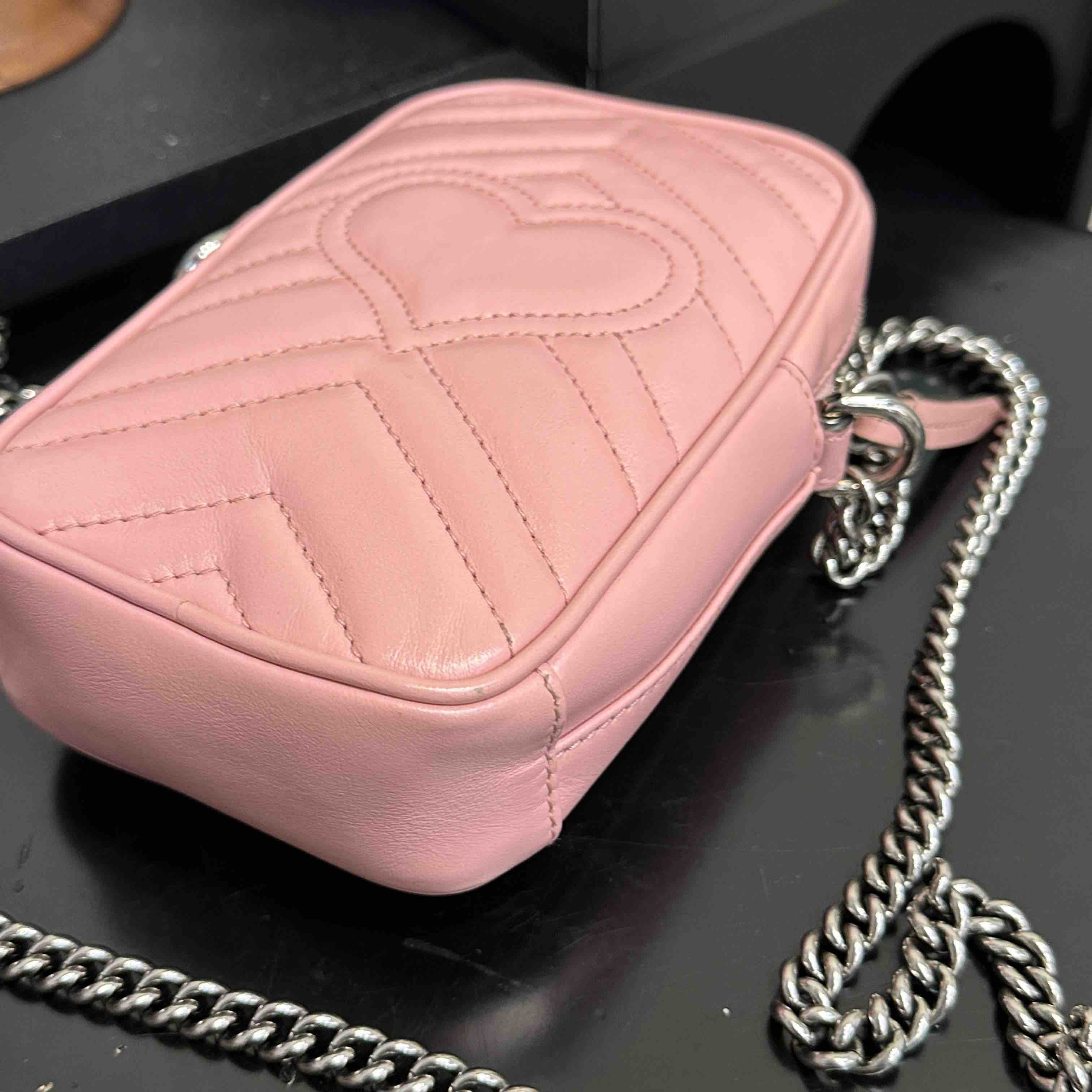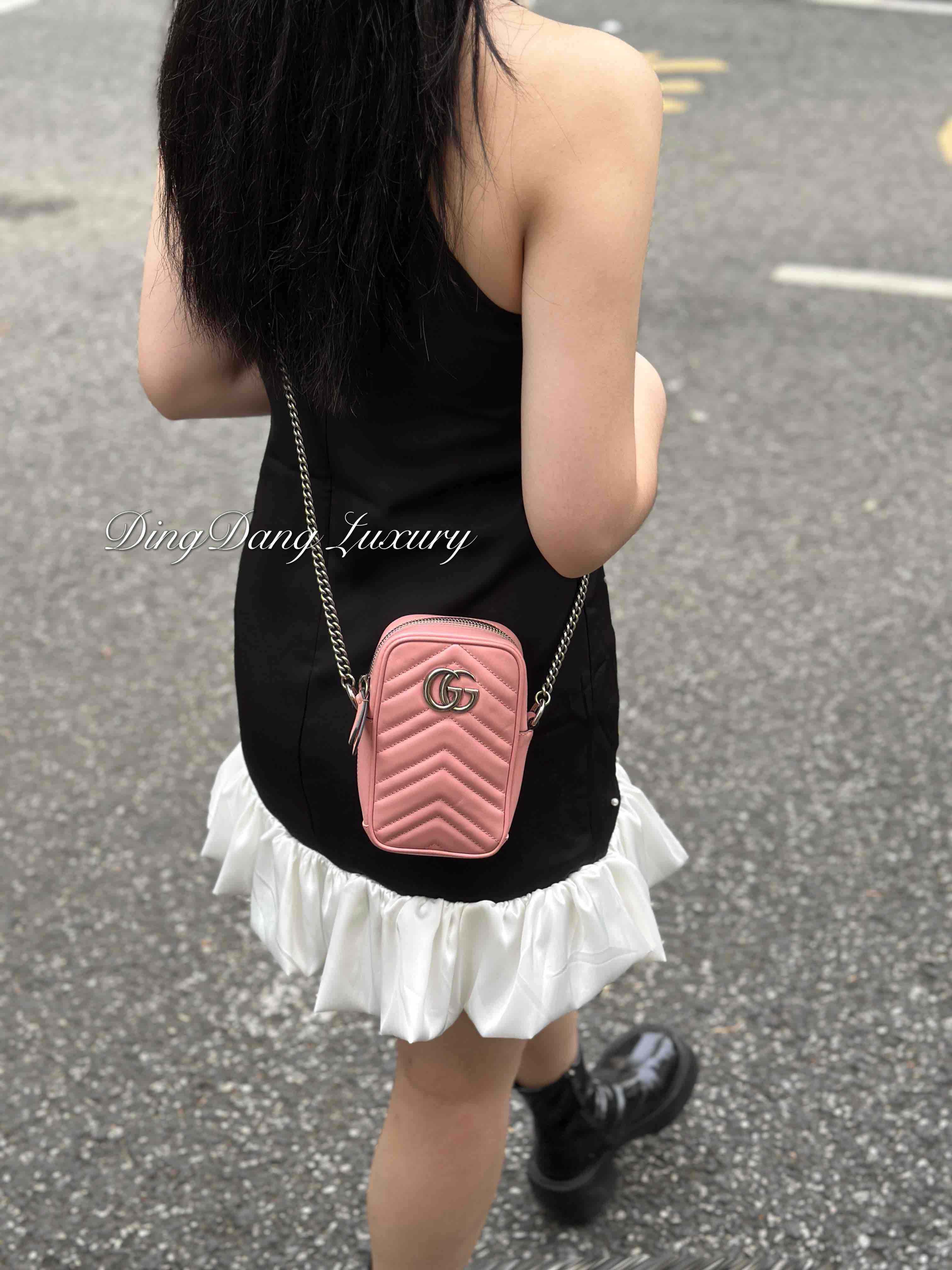 【商品详情】正品二手 Gucci 双g 马蒙 粉色 牛皮 mini 手机包👜95新 11x16 配件:盒 防尘袋 2说明书 吊牌。 包口轻微使用感 内里卡槽轻微染色