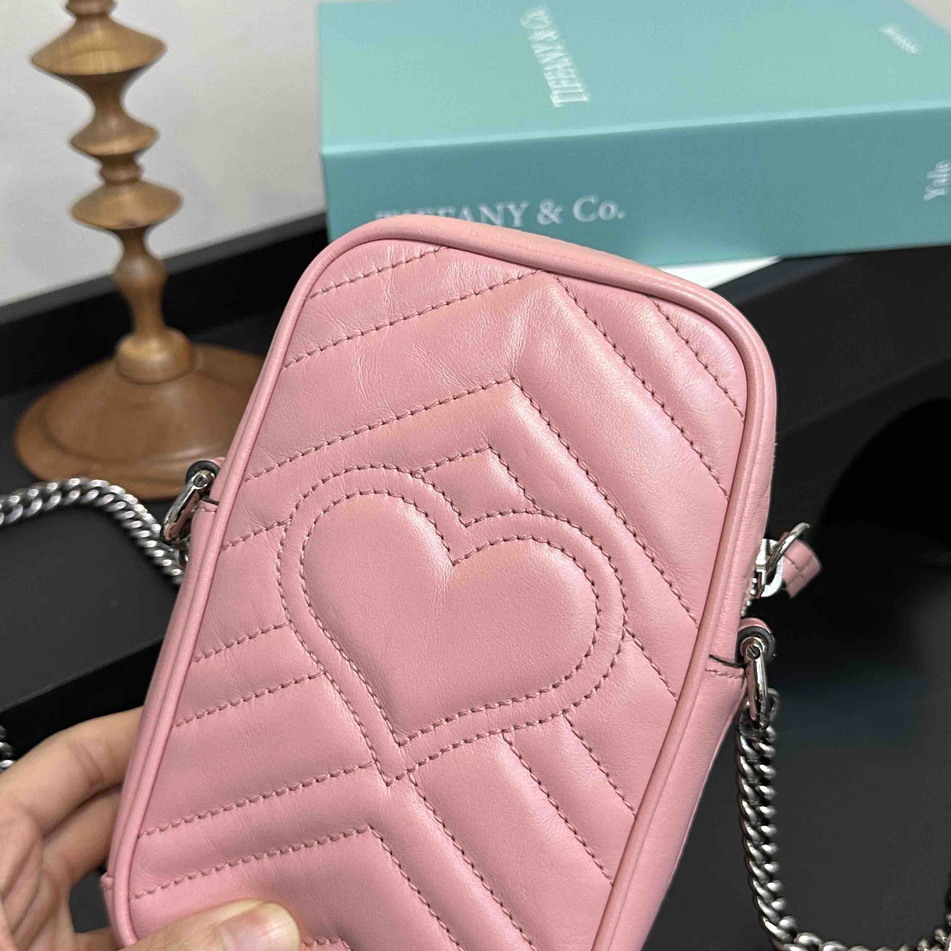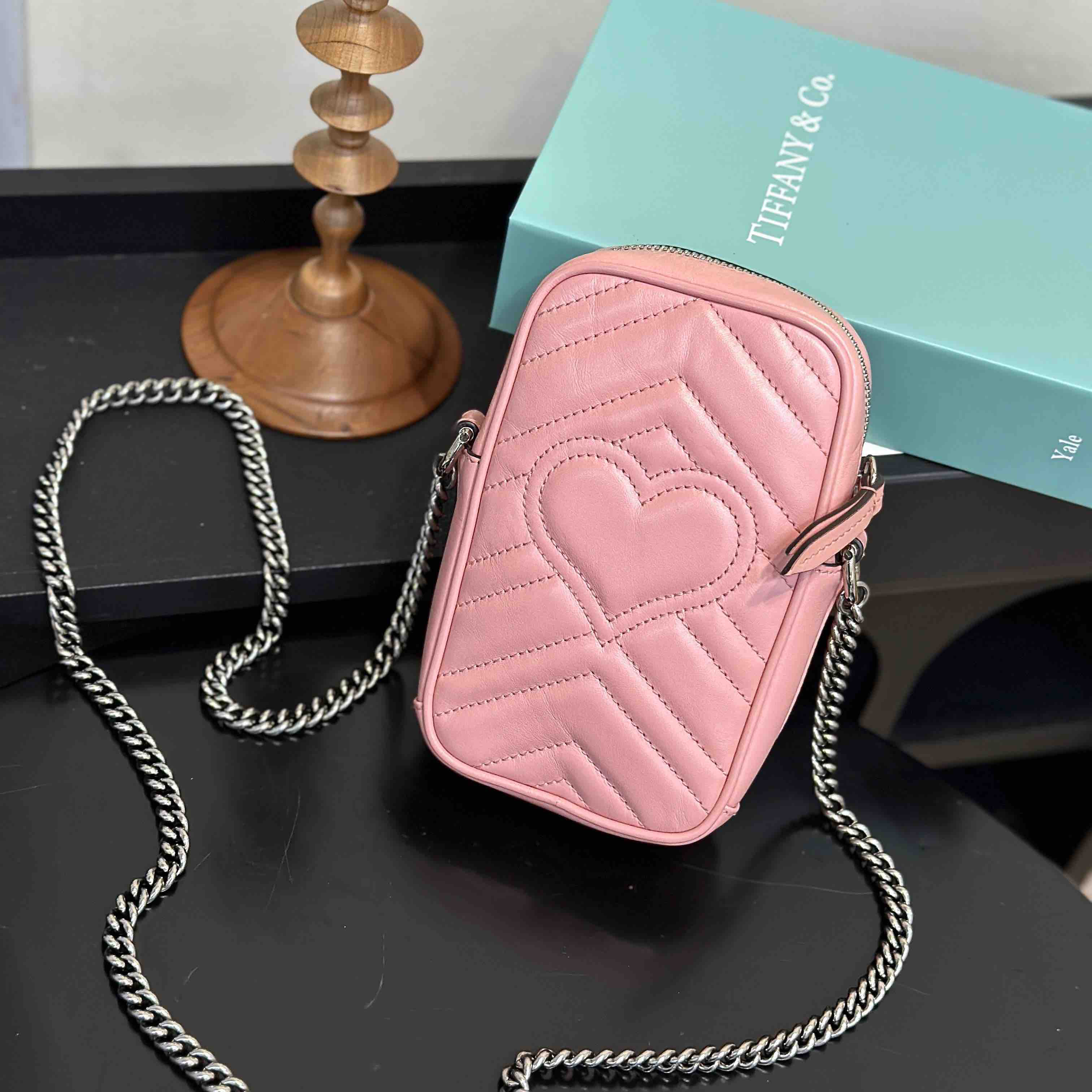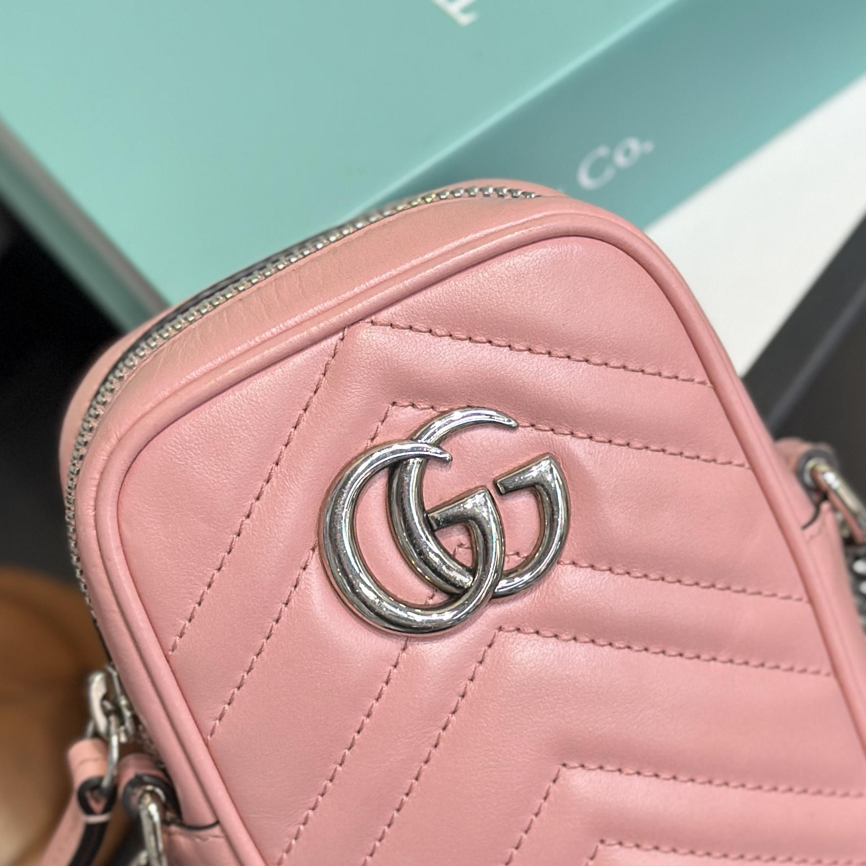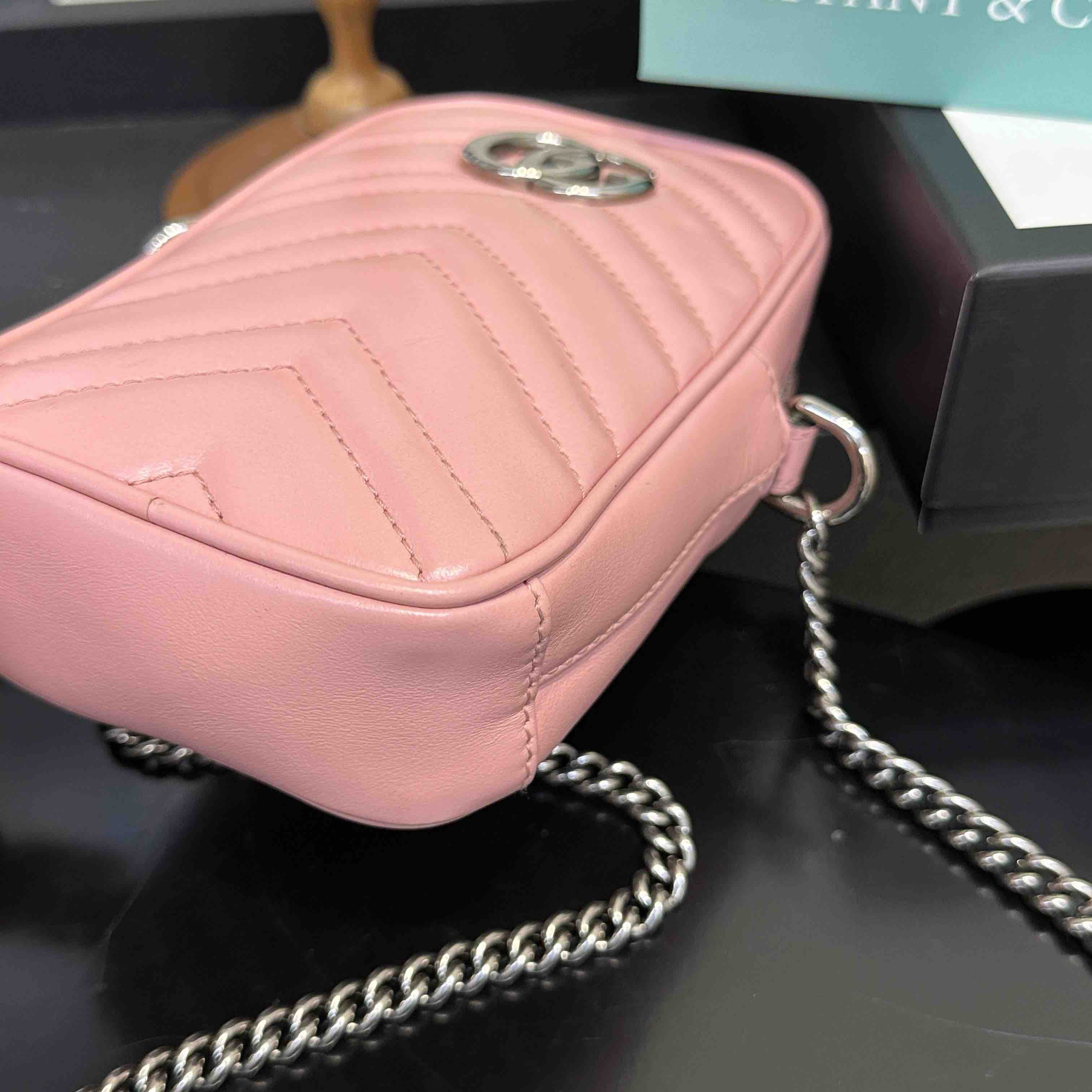 【商品详情】正品二手 Gucci 双g 马蒙 粉色 牛皮 mini 手机包👜95新 11x16 配件:盒 防尘袋 2说明书 吊牌。 包口轻微使用感 内里卡槽轻微染色