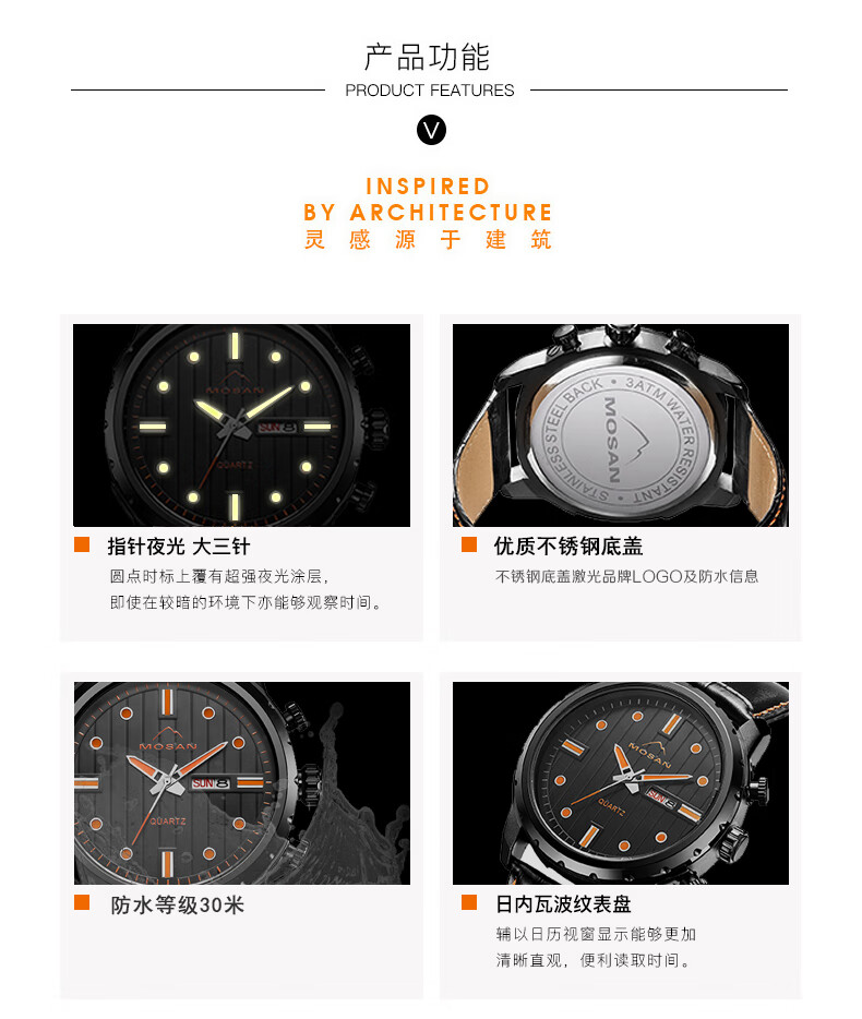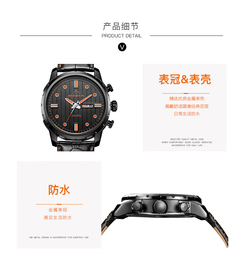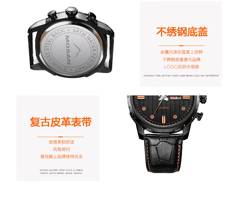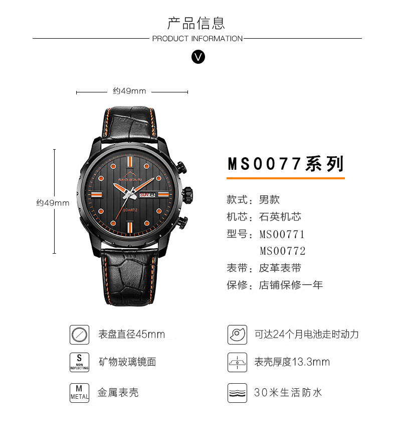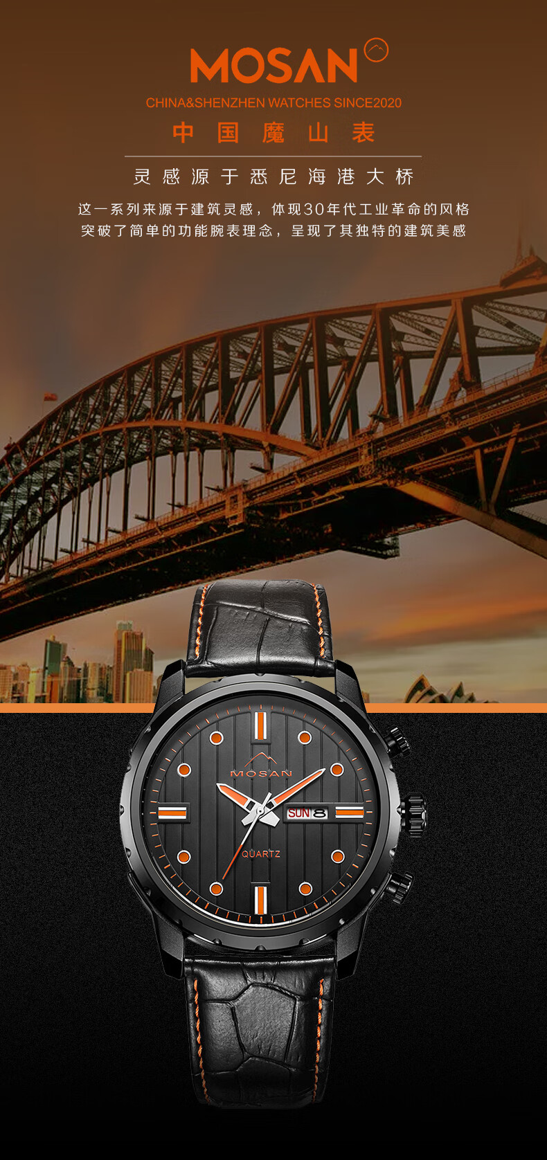 魔山(MOSAN)经典复古时尚石英表男士手表MS00771/MS00772 黑面黑带石英表 45mm