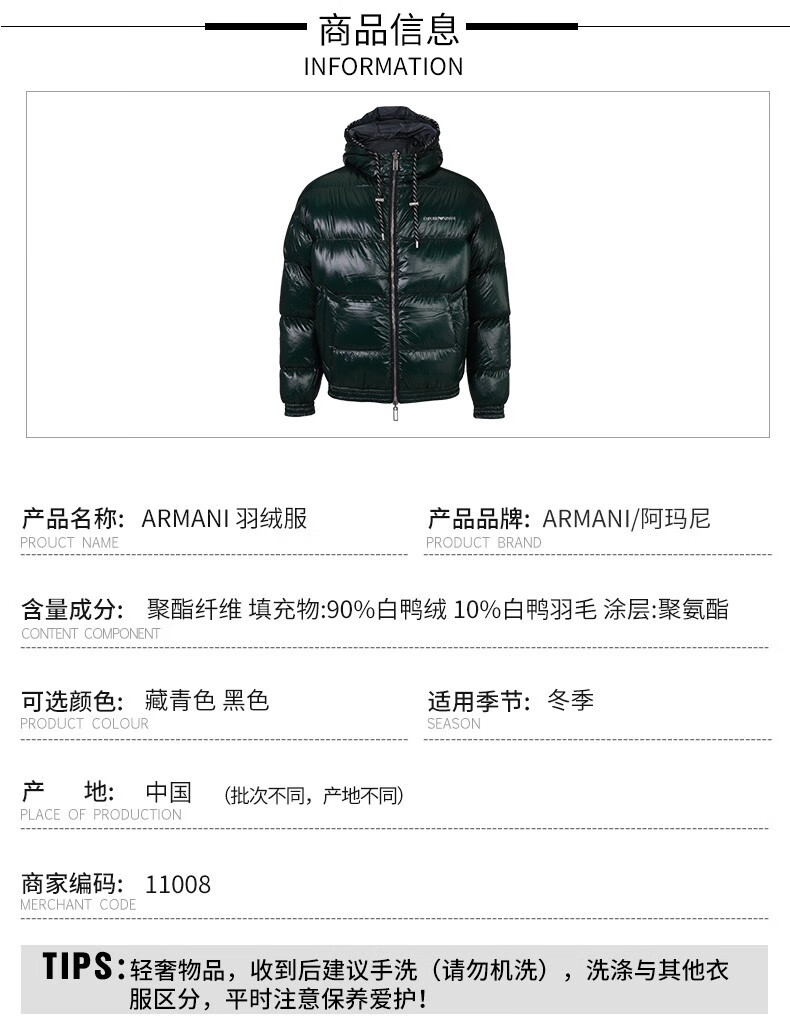 【超惠秒】Emporio Armani 阿玛尼 男士白鸭绒双面穿夹克羽绒服 11008