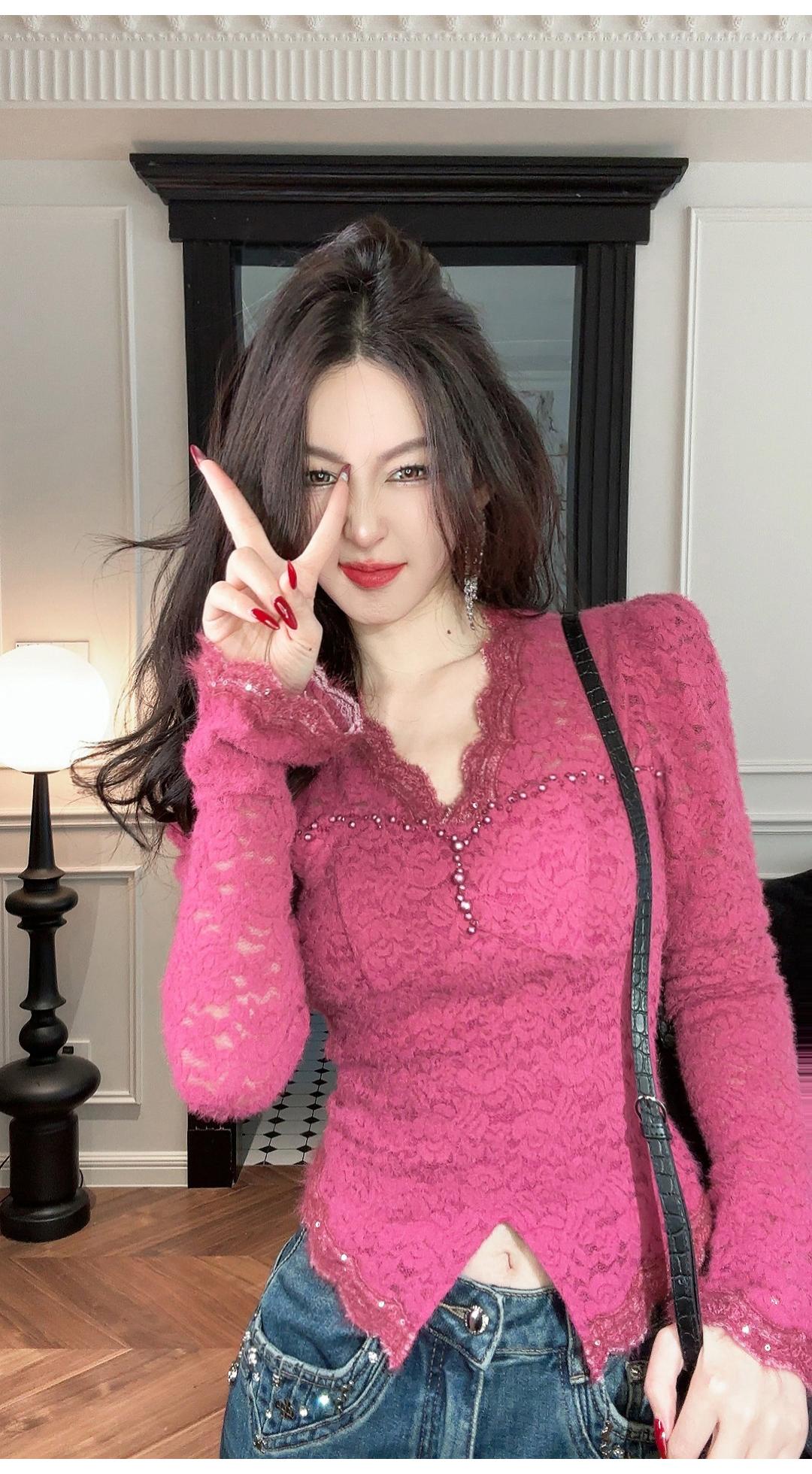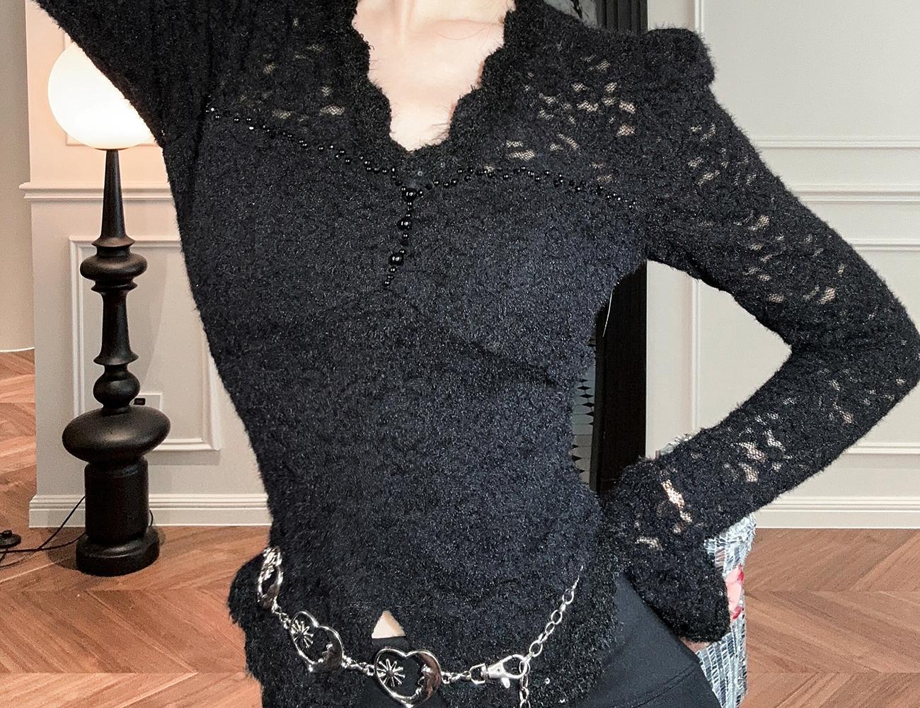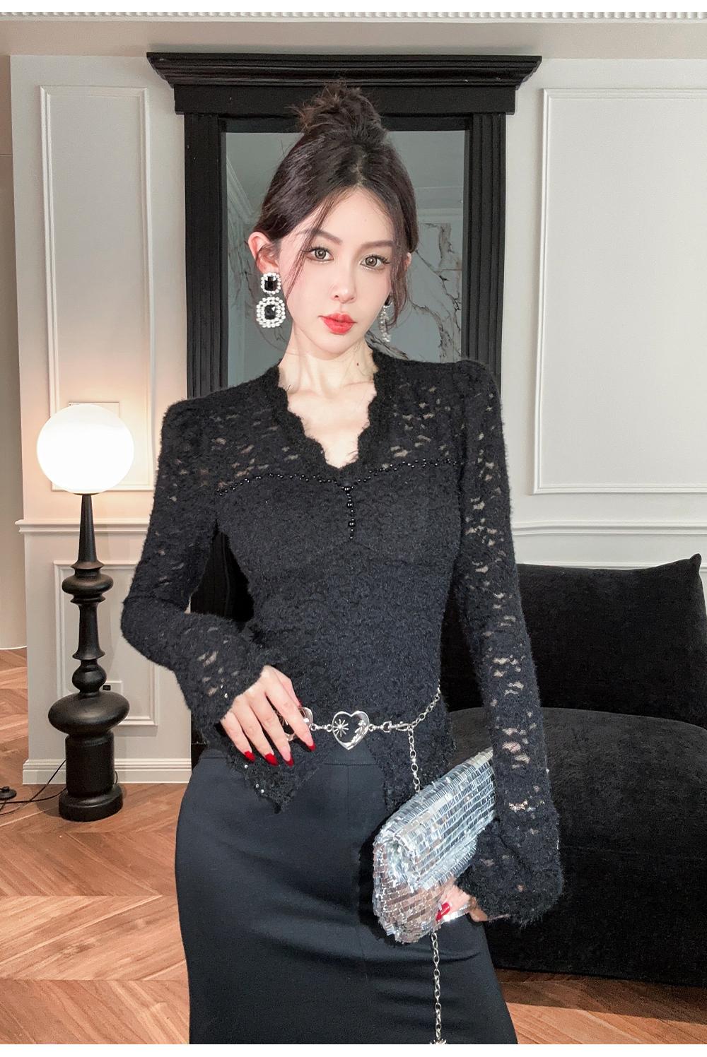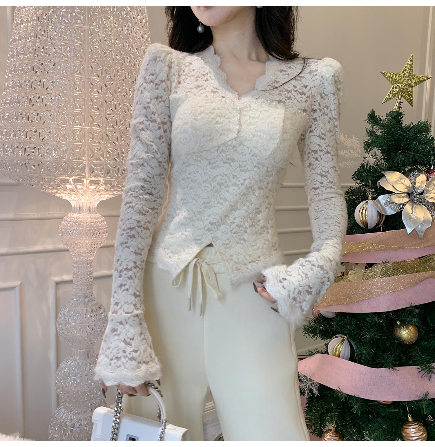 BeQueenStory【百搭蕾丝】性感时尚蕾丝羽毛纱长袖V领修身上衣女装