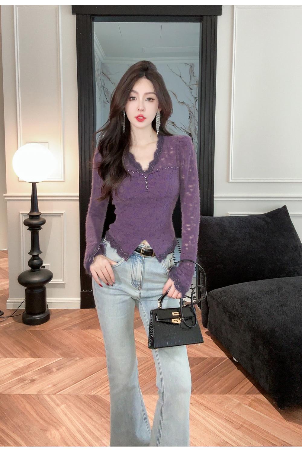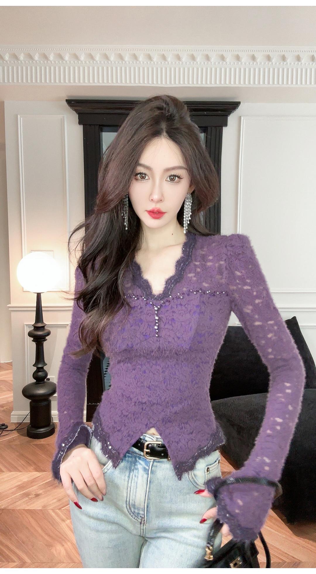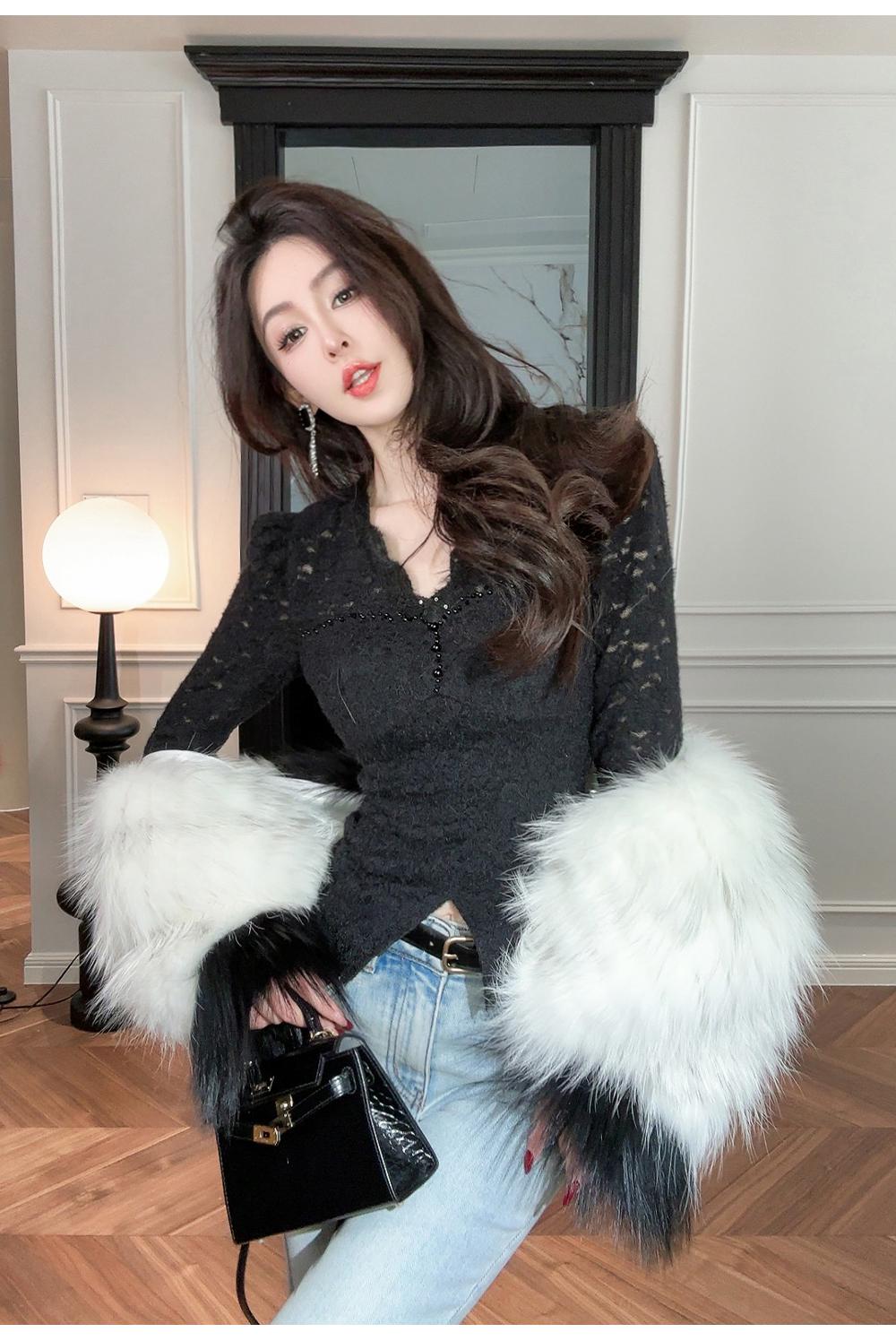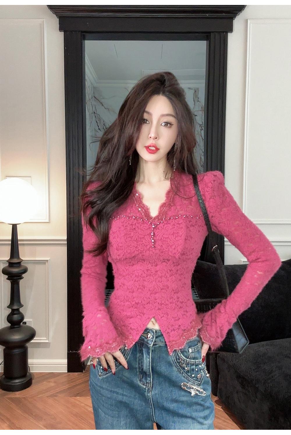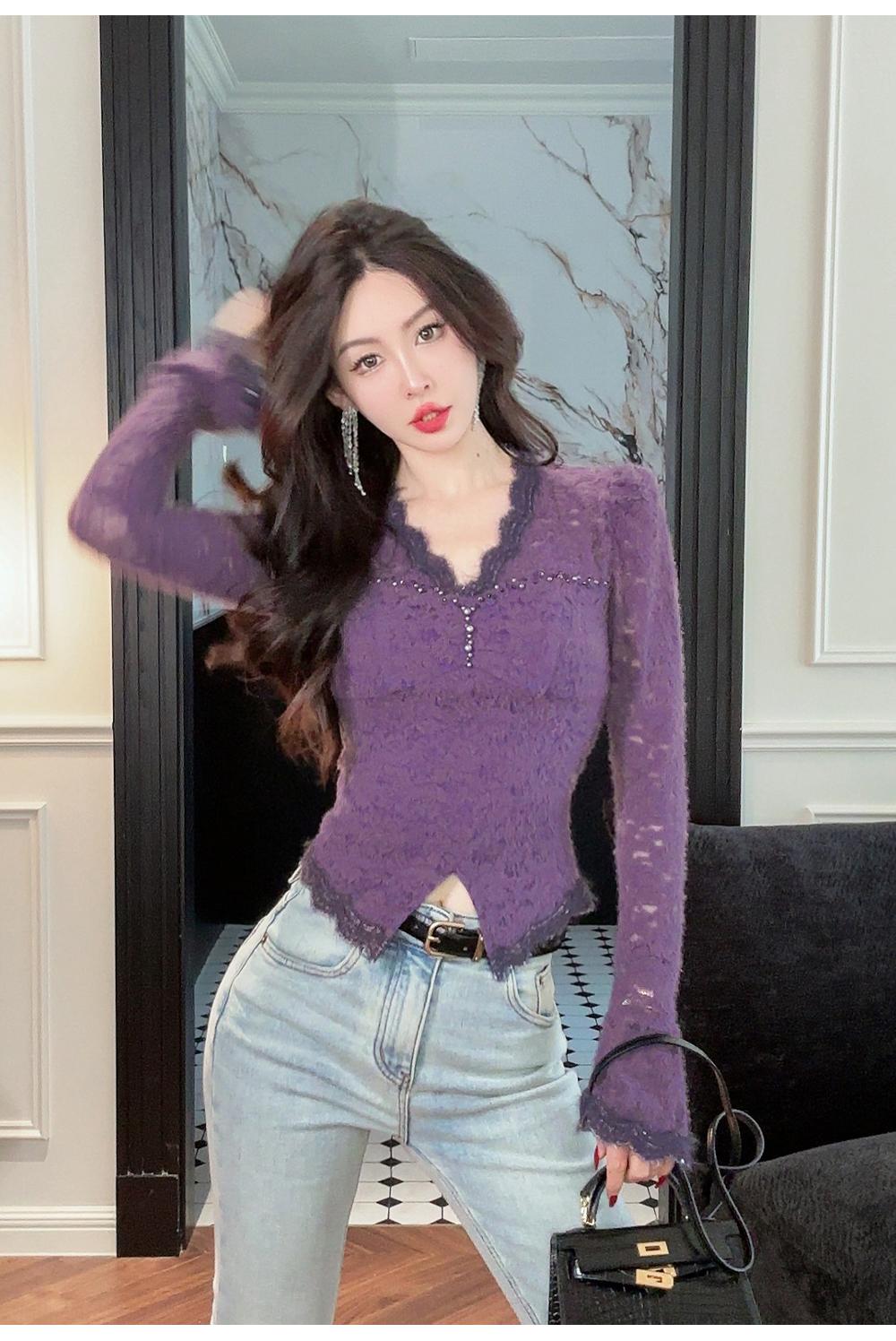 BeQueenStory【百搭蕾丝】性感时尚蕾丝羽毛纱长袖V领修身上衣女装