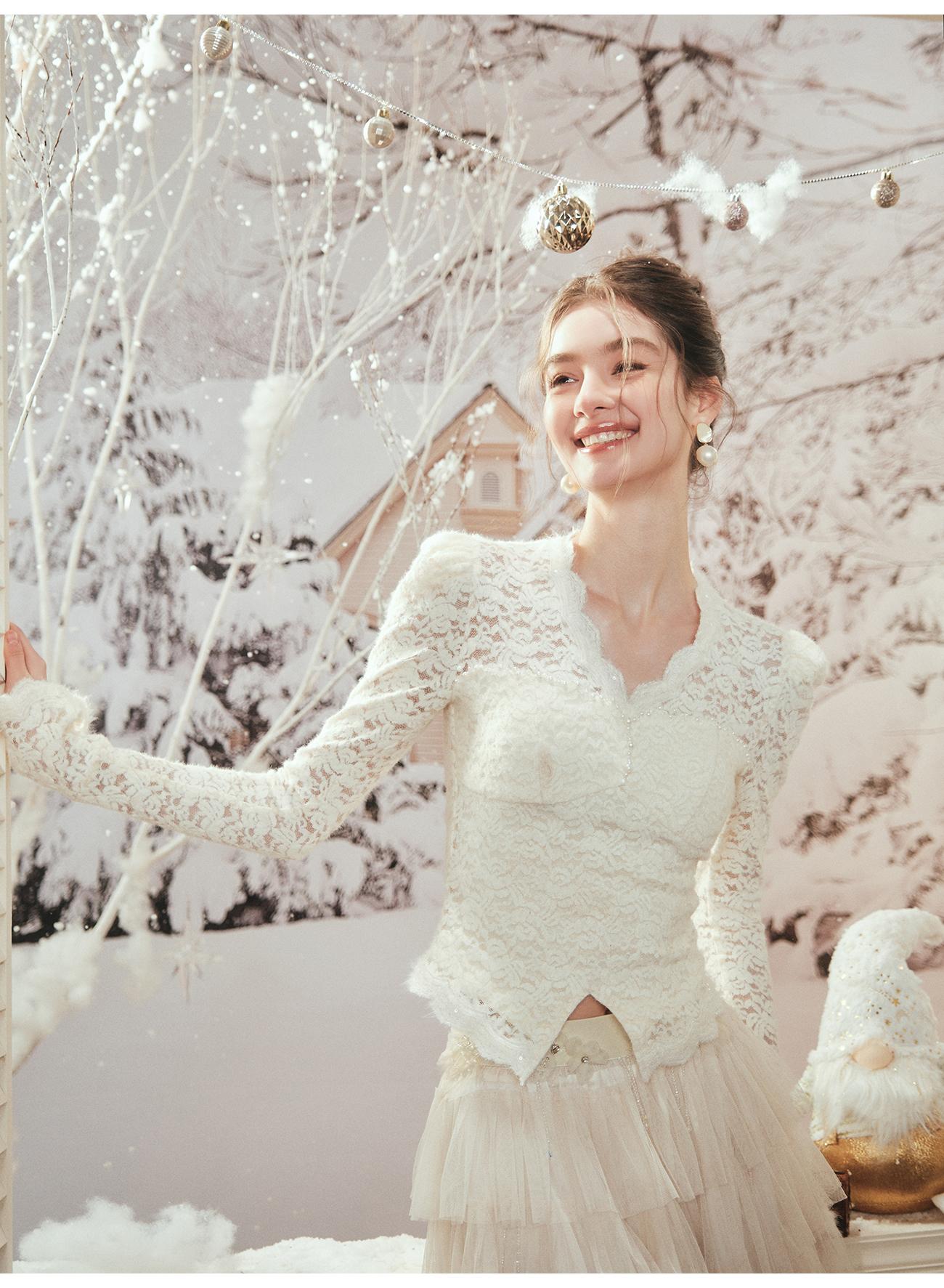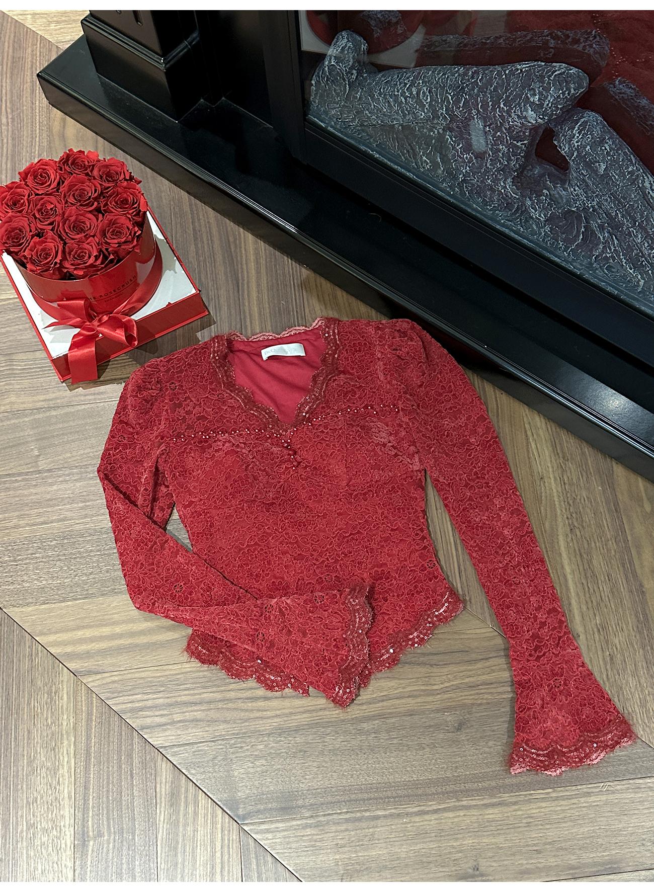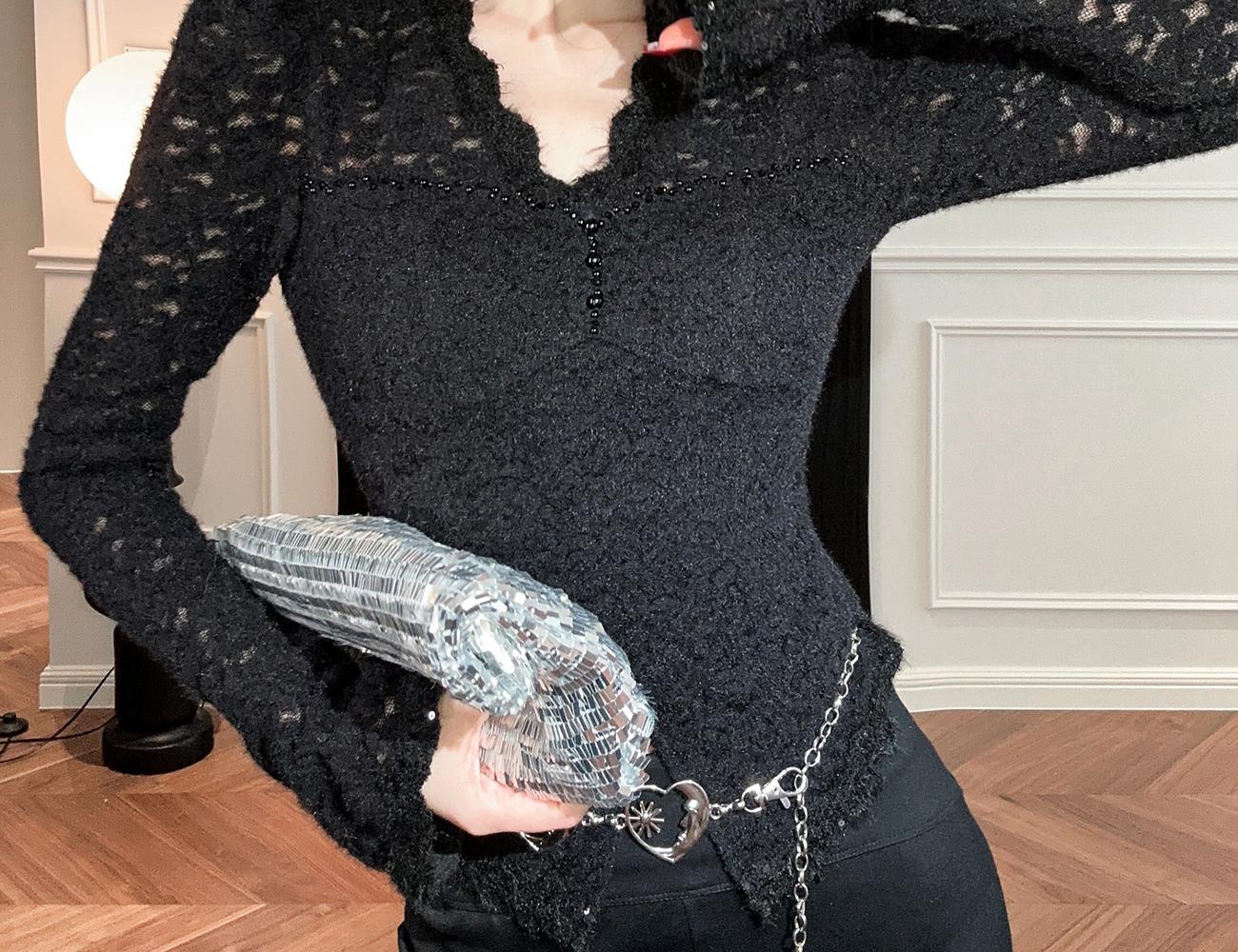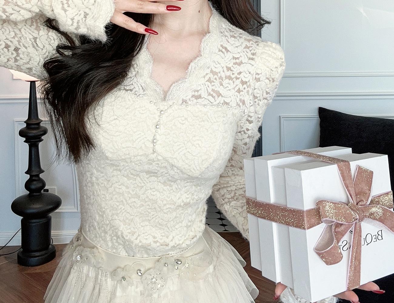 BeQueenStory【百搭蕾丝】性感时尚蕾丝羽毛纱长袖V领修身上衣女装