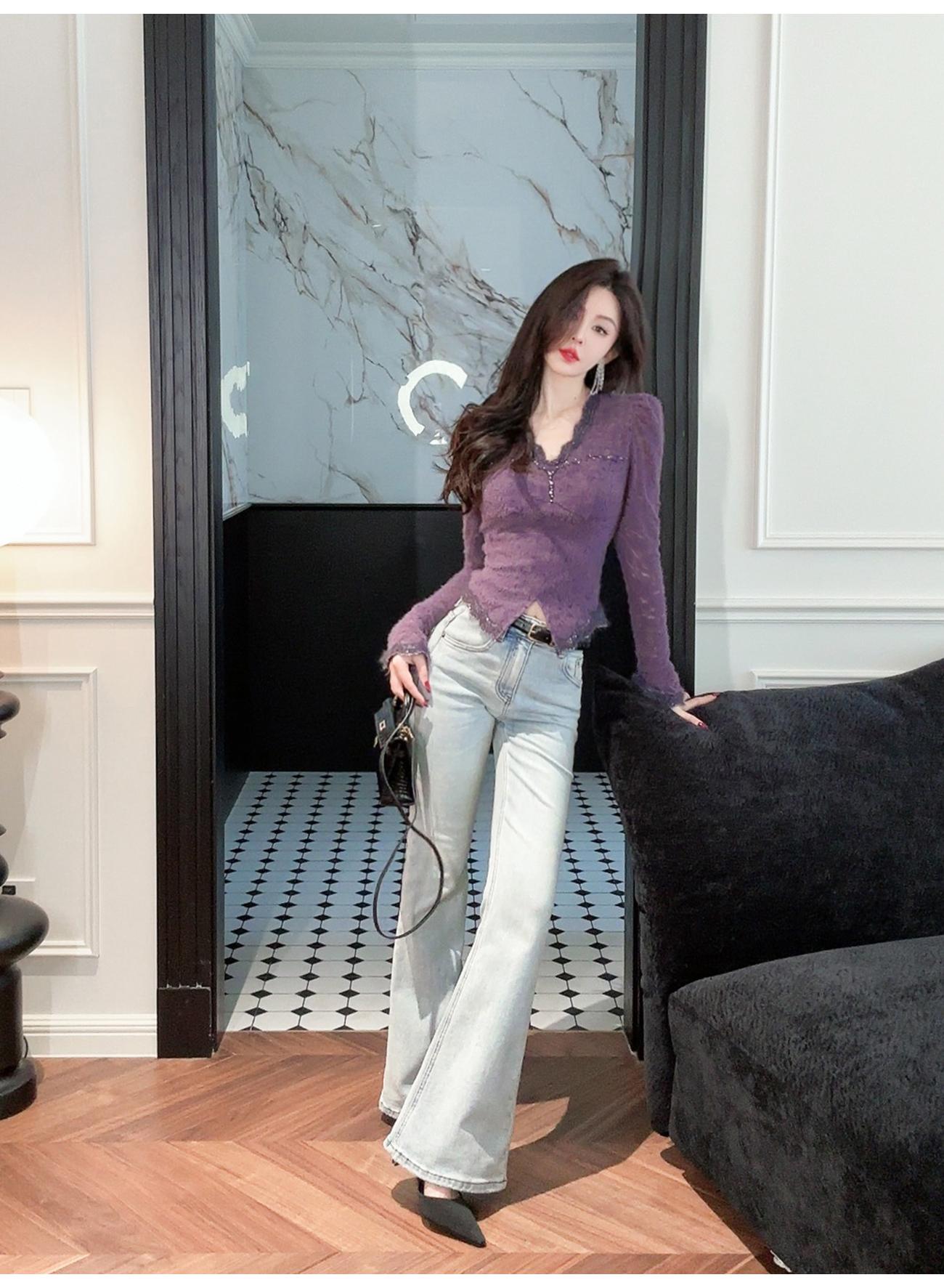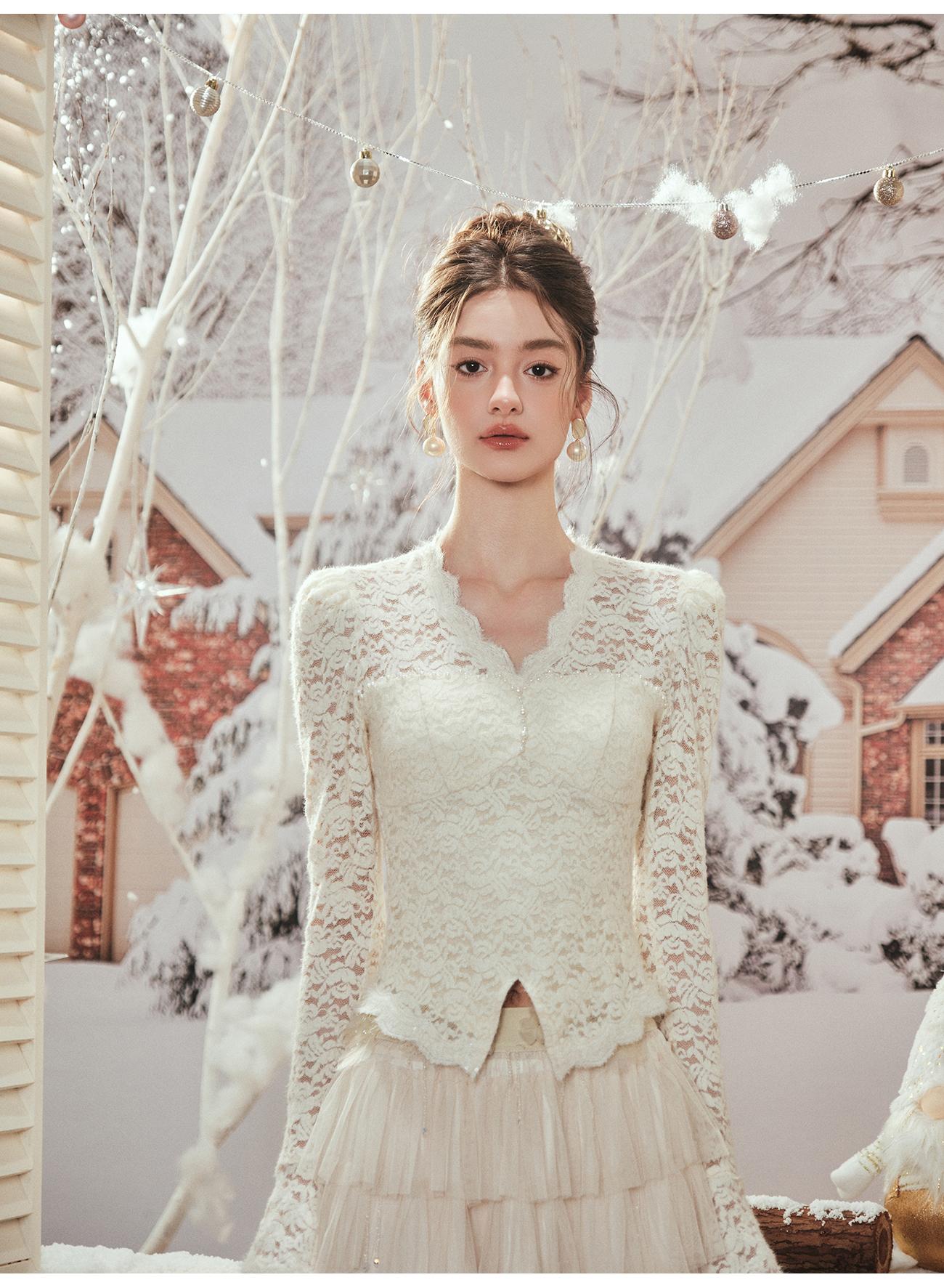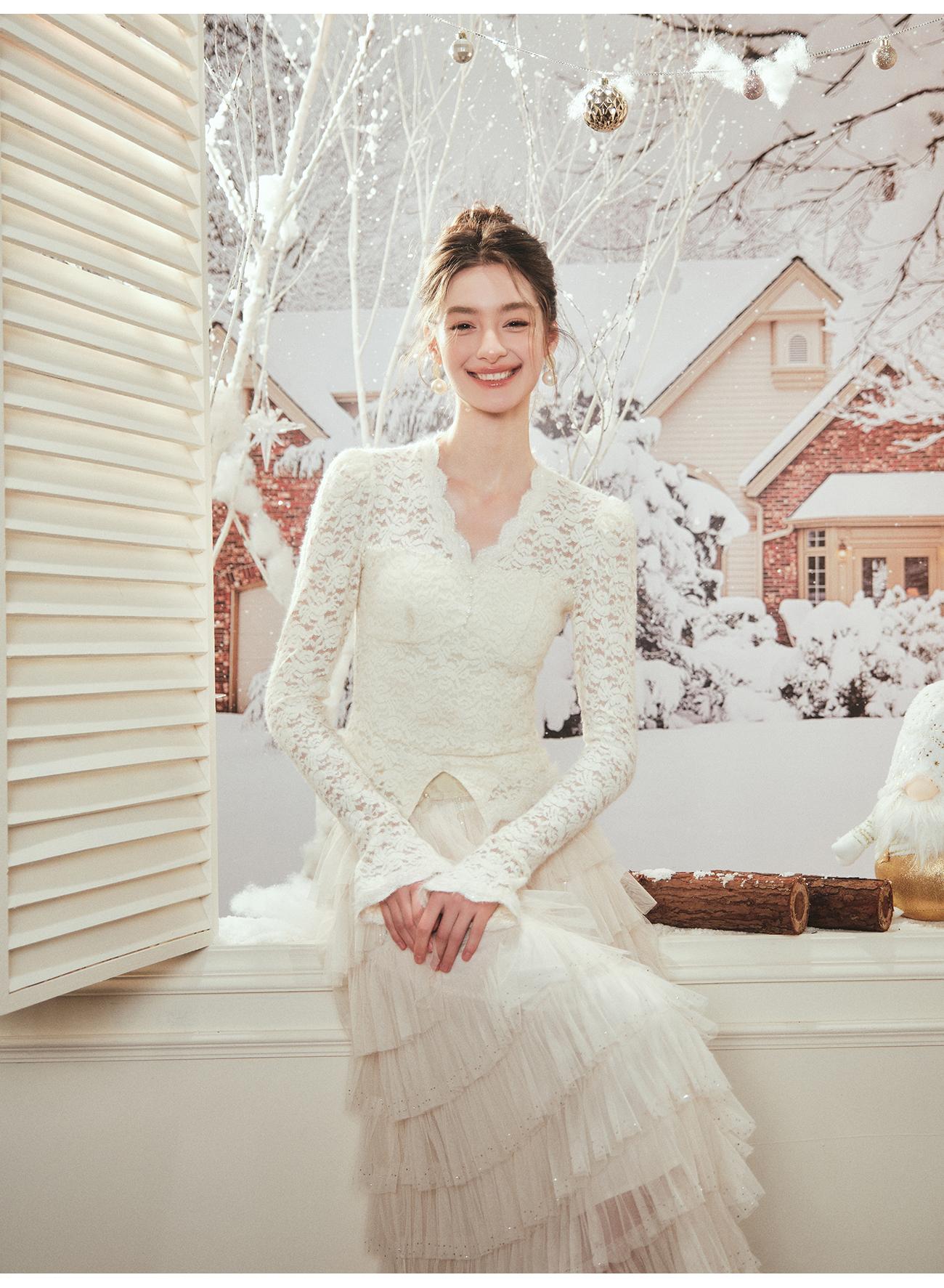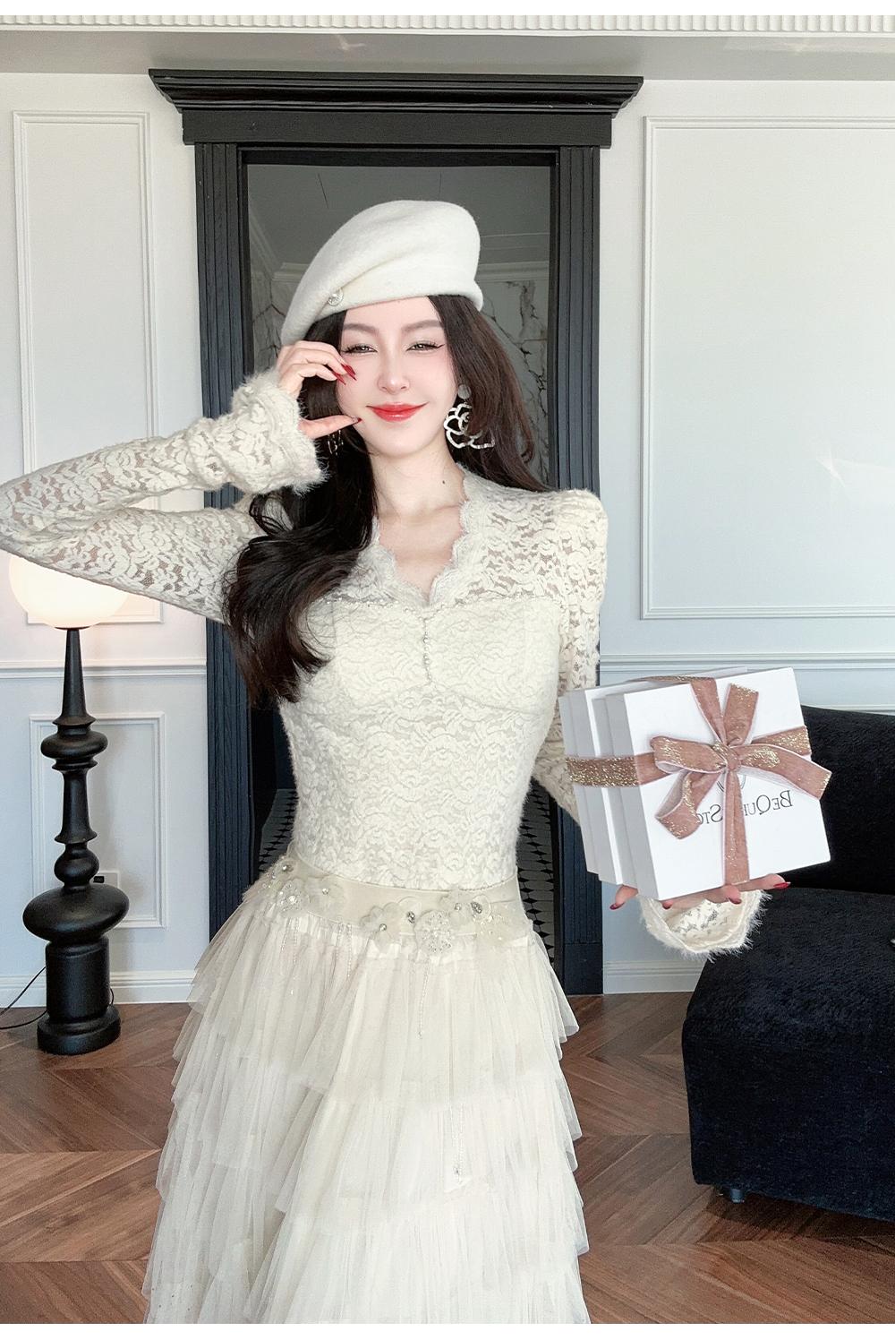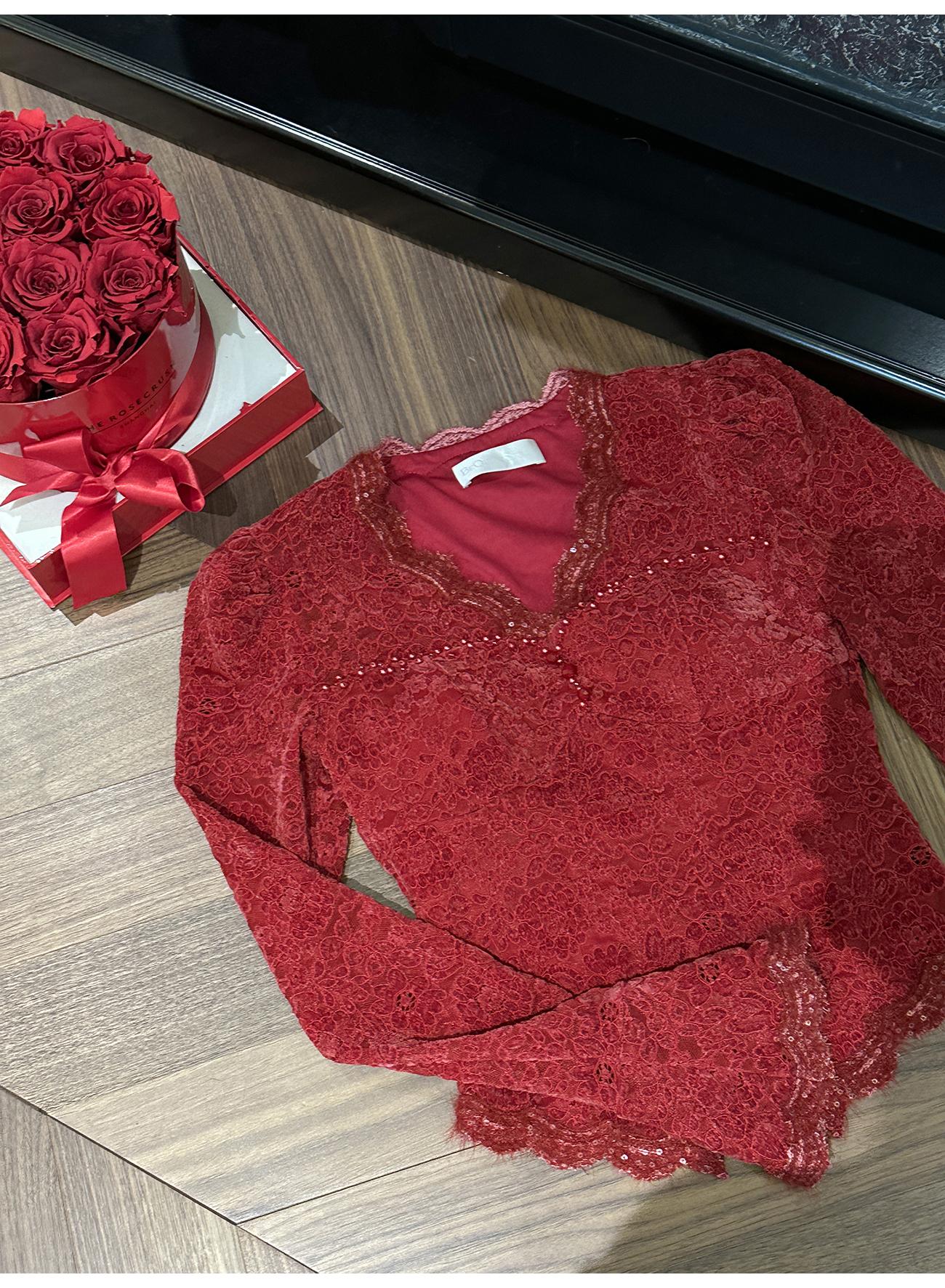 BeQueenStory【百搭蕾丝】性感时尚蕾丝羽毛纱长袖V领修身上衣女装