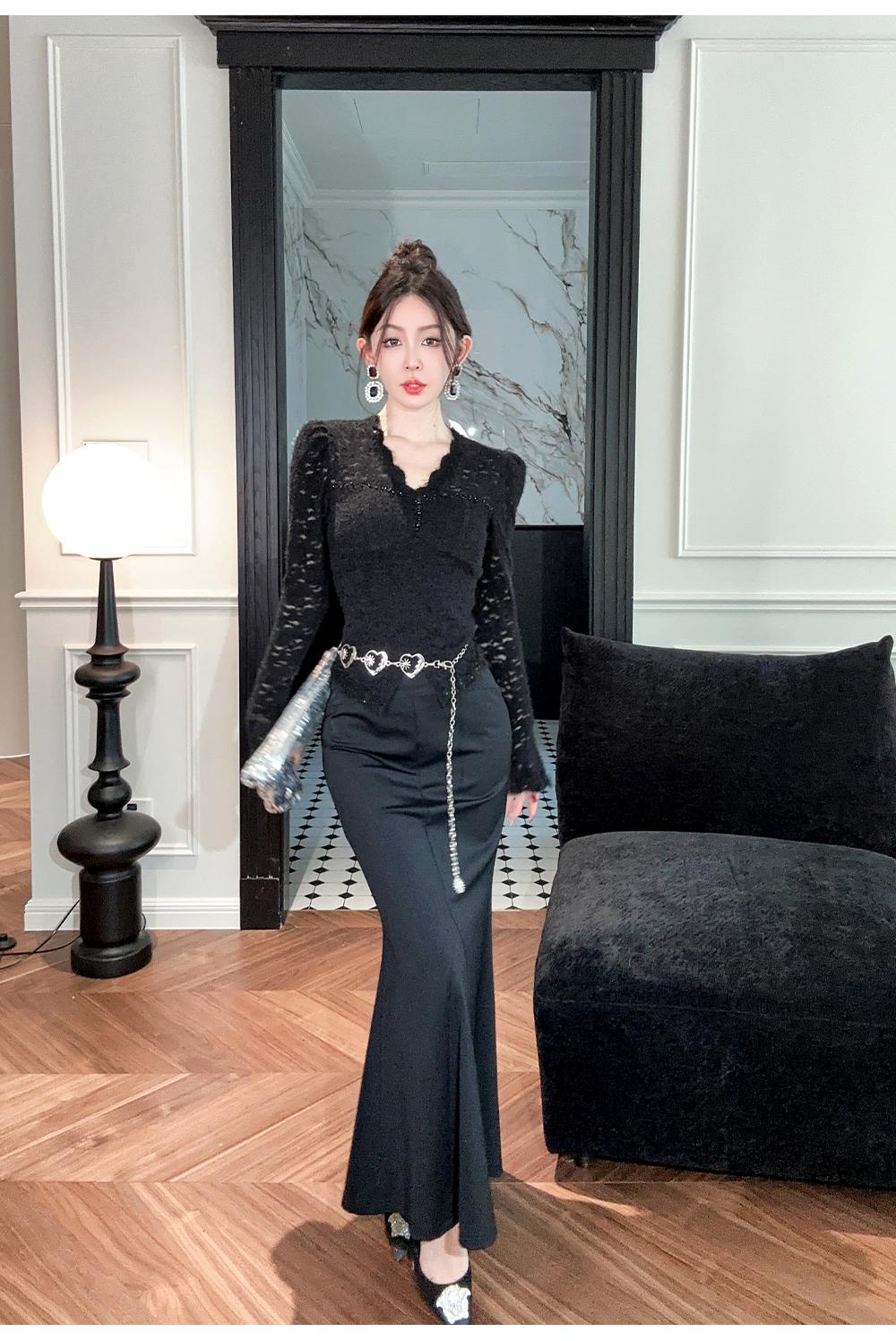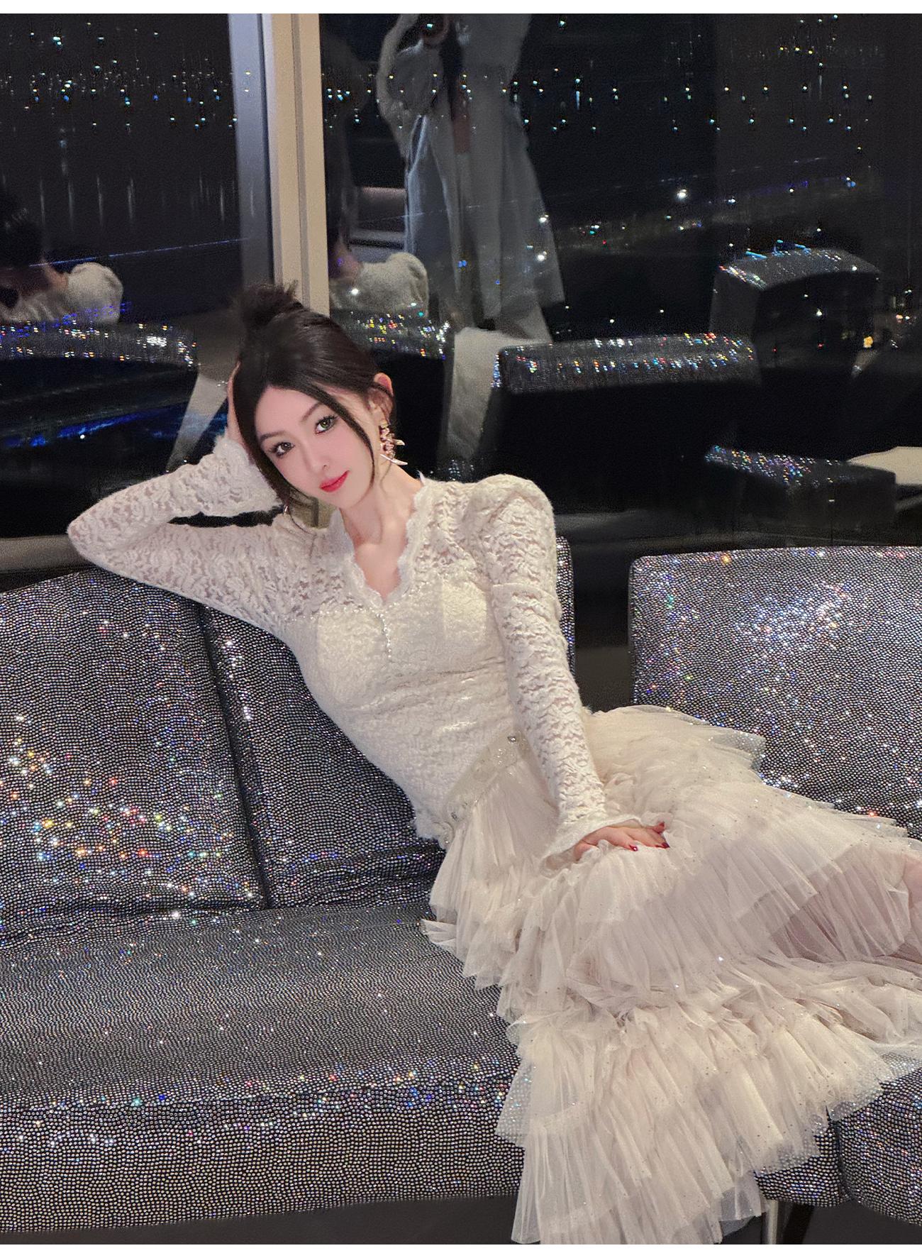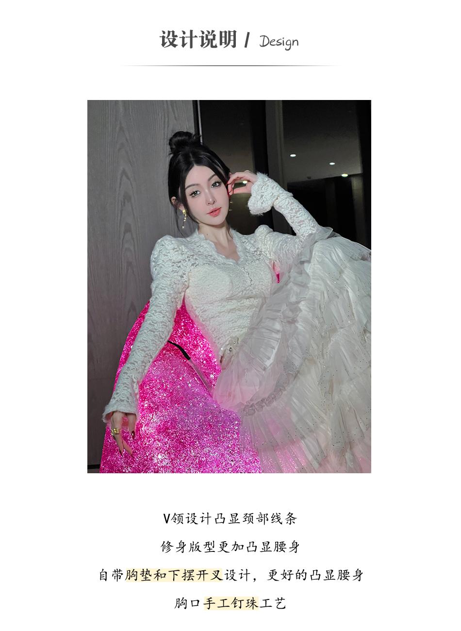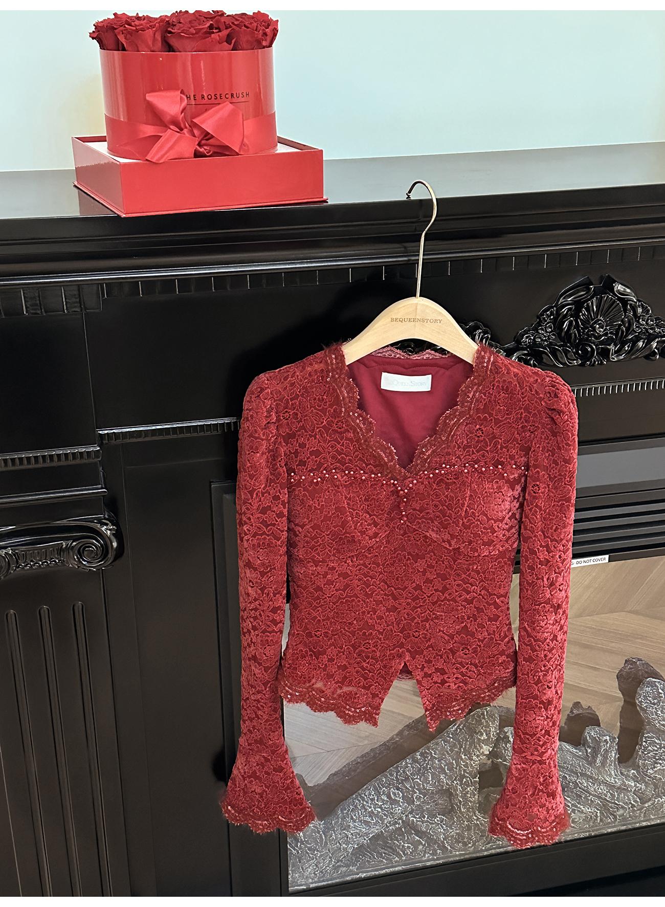 BeQueenStory【百搭蕾丝】性感时尚蕾丝羽毛纱长袖V领修身上衣女装