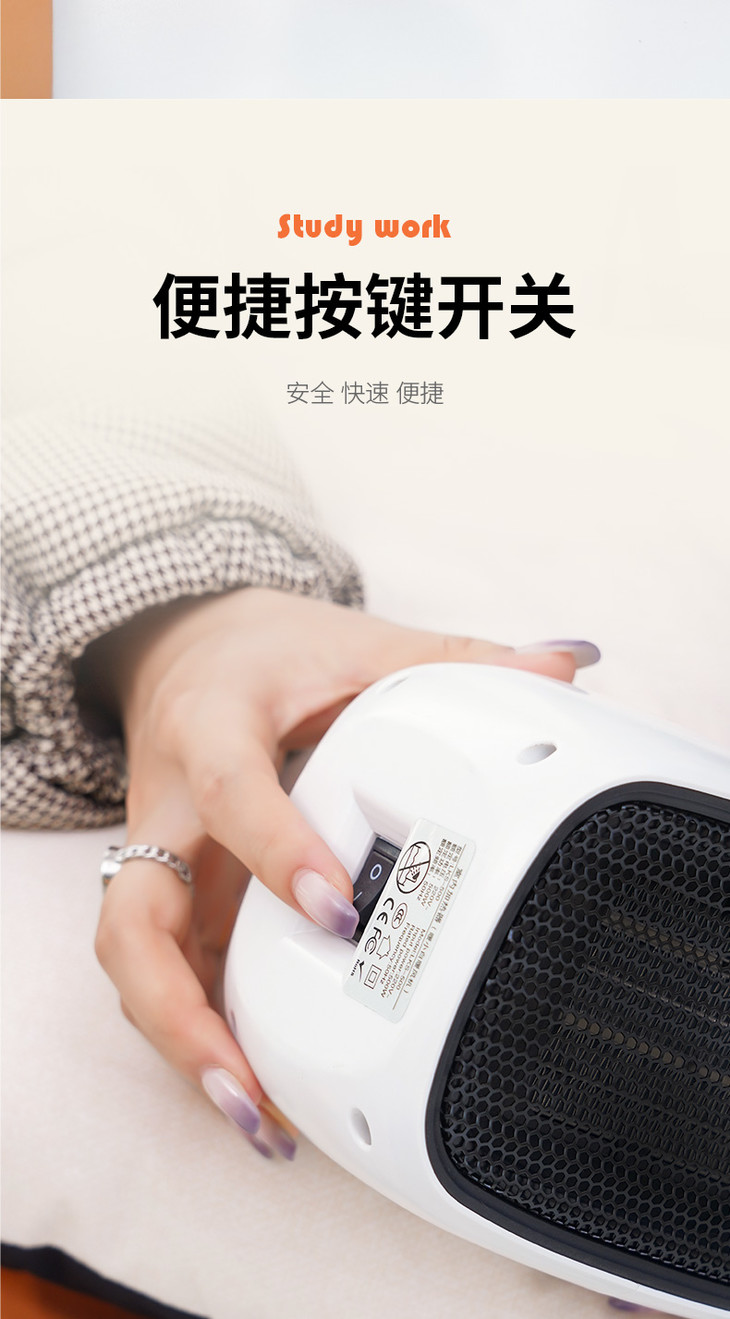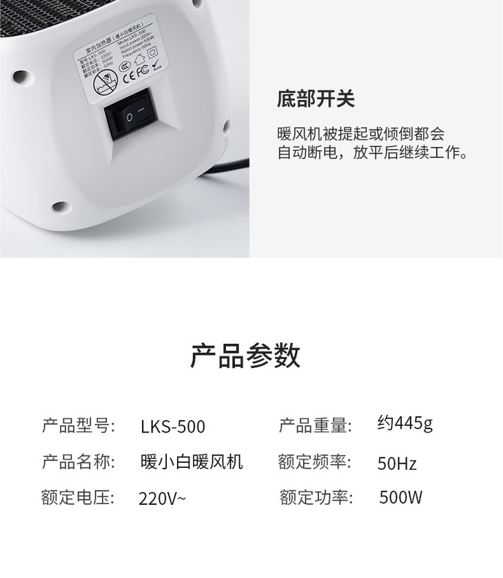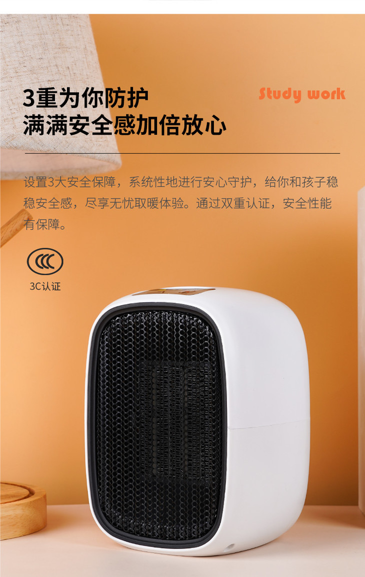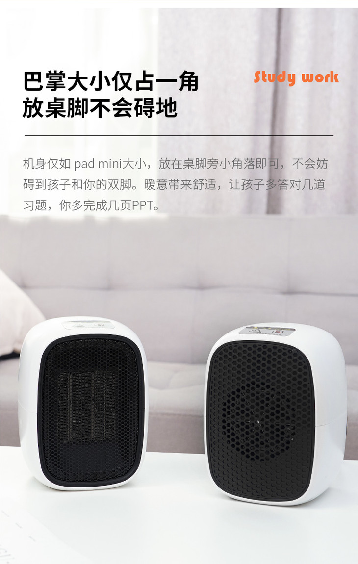 1、暖小白桌面暖风机 PTC陶瓷发热体,安全