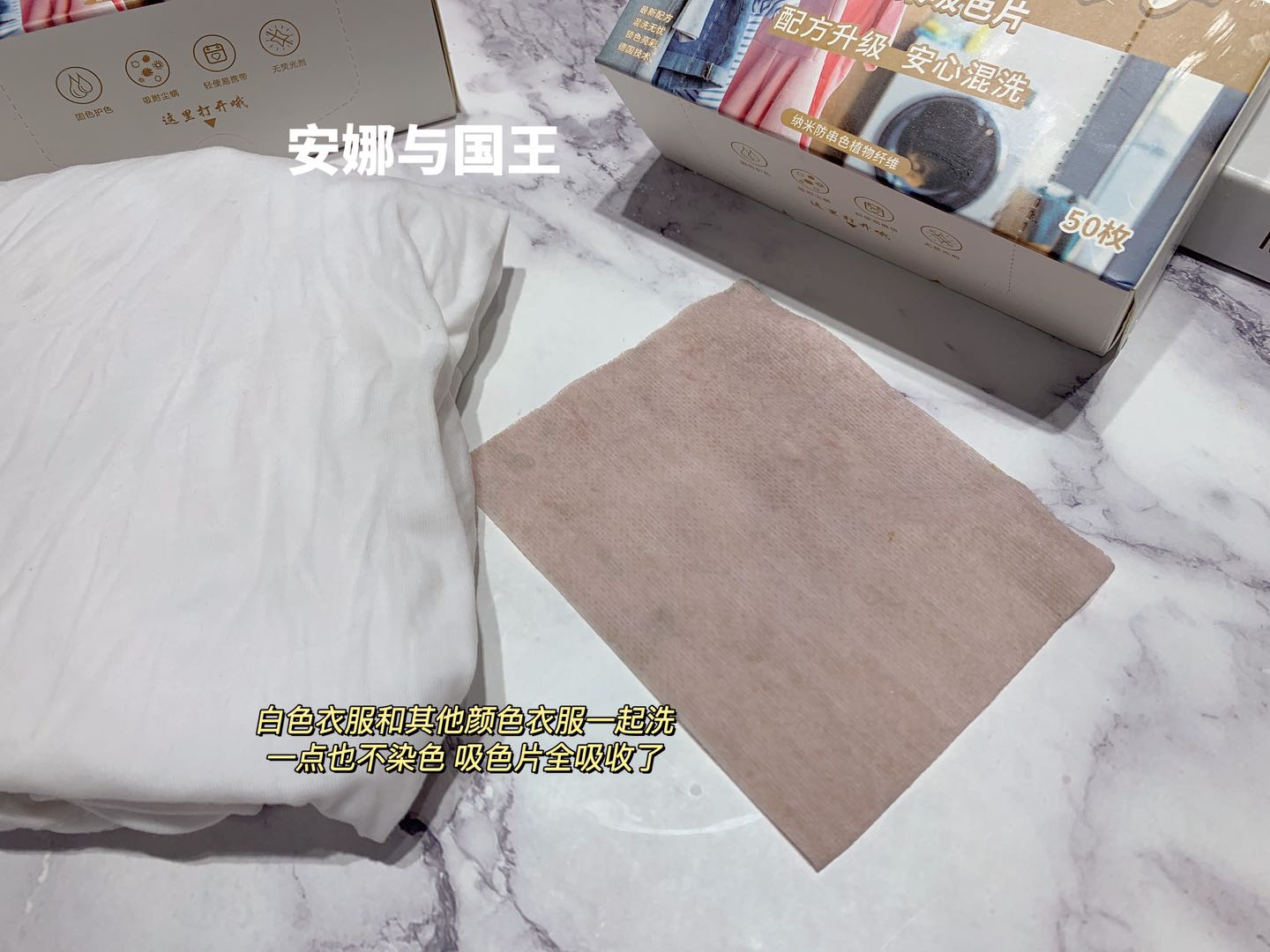 安娜与国王防串染吸色片 我以前也觉得洗衣服防串色没必要,直到后来有次我不小心把一件白T恤和牛仔裤放一起洗,白T恤被毁了,那个心痛的感觉,蓝瘦香菇。为了避免悲剧再一次发生,于是我扒拉各种防止衣服串色的神器。 特意用一件不喜欢的白衣服和黑色裤子一起洗了,嘿嘿嘿嘿,结果白衣服一点事都没有,这个吸色片真心好用,材质摸起来很厚实,衣服再也不怕被染色了。