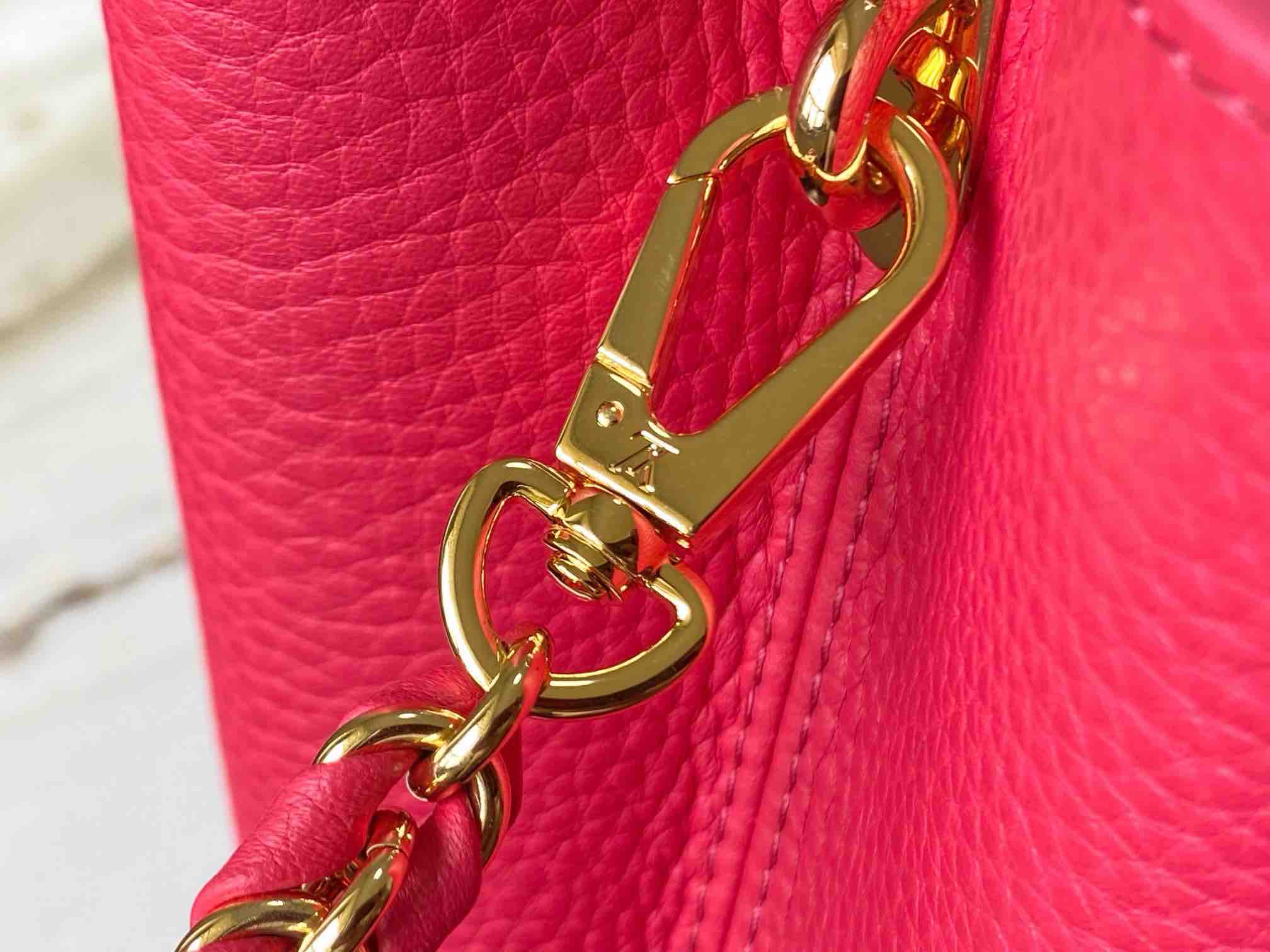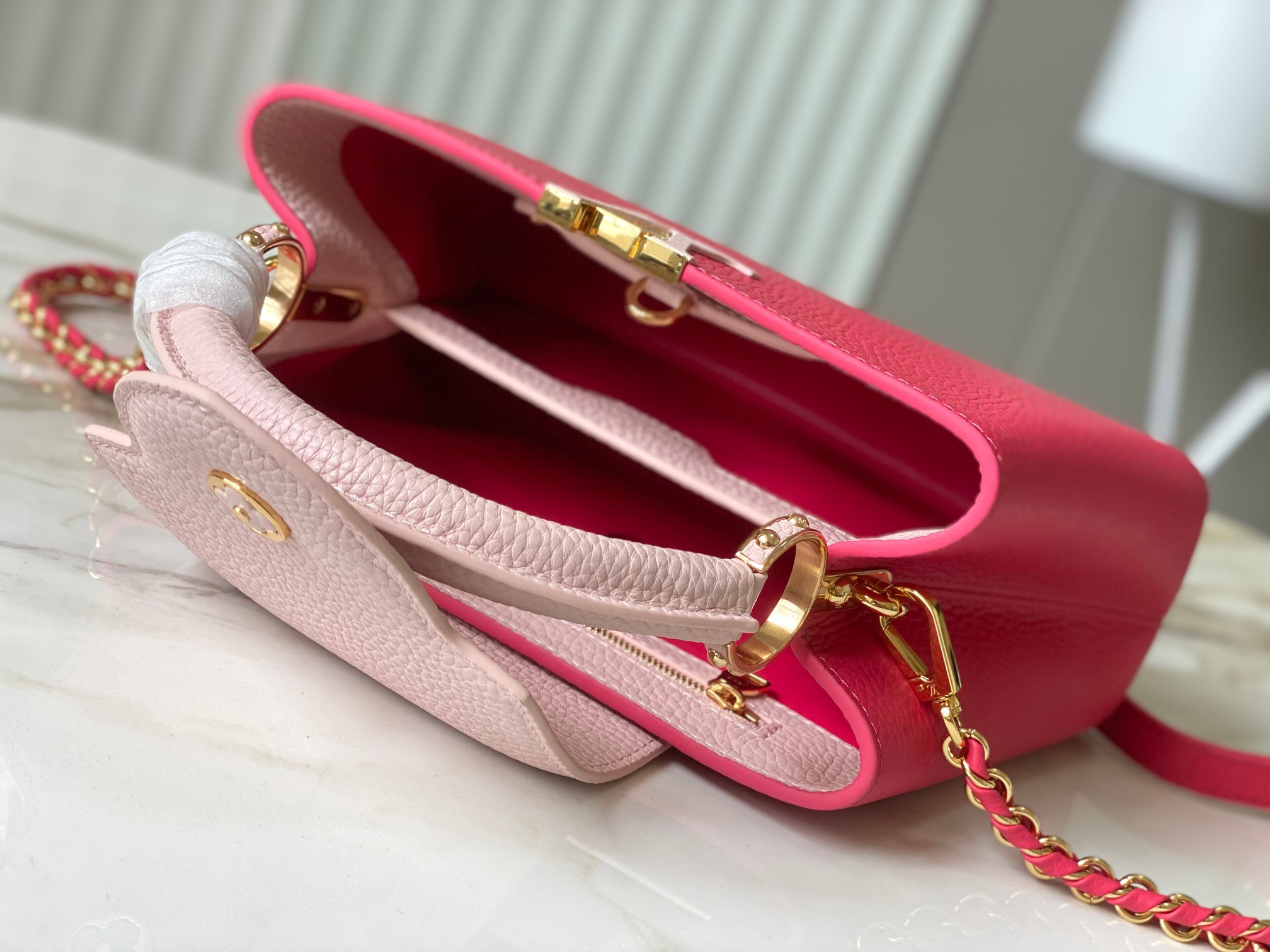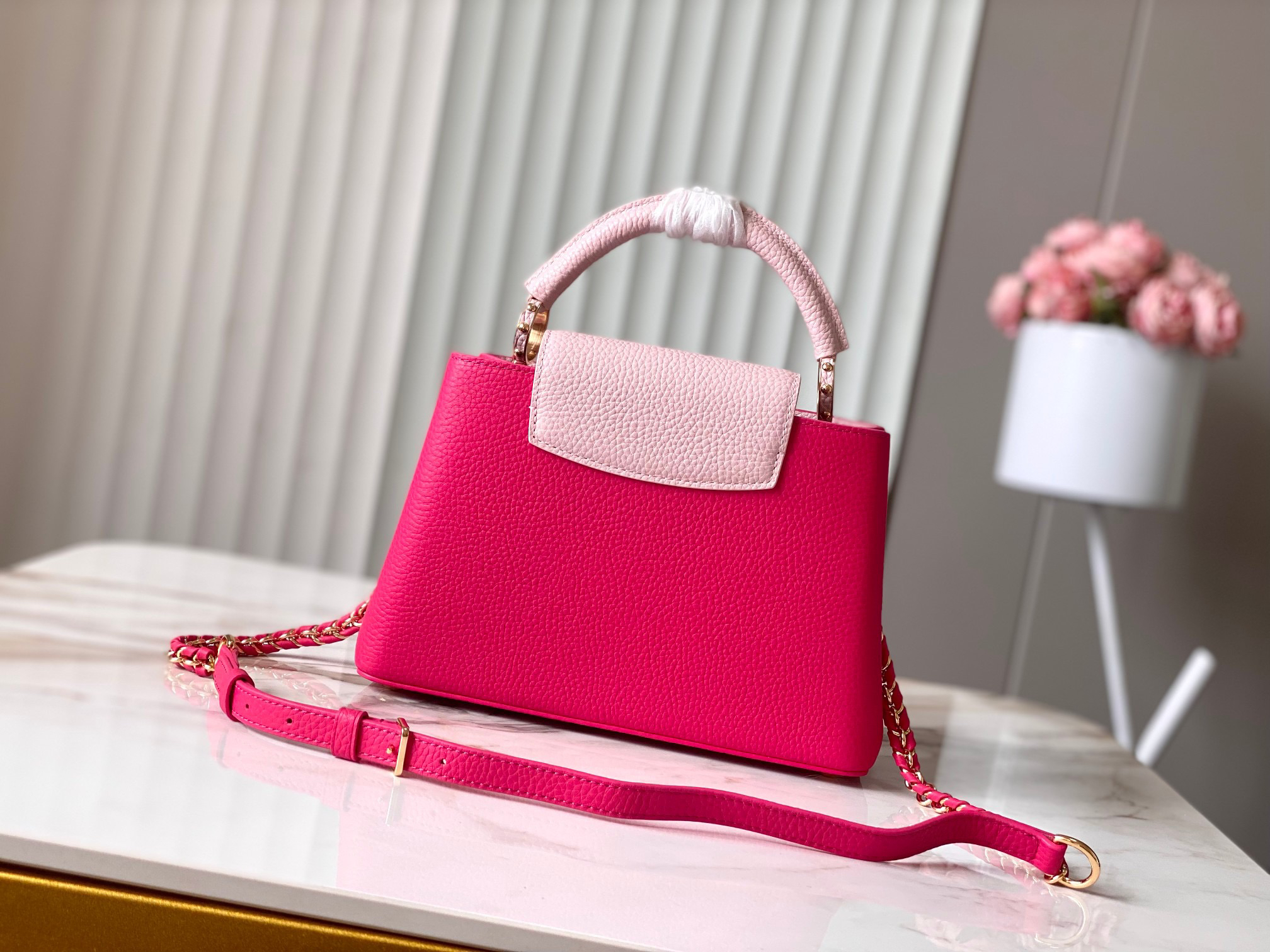 秋冬特惠💰1630 渠道级LV 新品 te级LV 全套包装 M21689/M48865玫红拼链条款 此款Taurilon皮革版Capucines 手袋呈现柔美清新的色调 令人眼前一亮 除了标志性的ding部皮革手柄 另配可脱卸、可调节编结皮革链式包带 便于肩背或斜挎 包内设有隔层和拉链口袋 可存放贵重物品 Size:27 * 18 * 9 cm