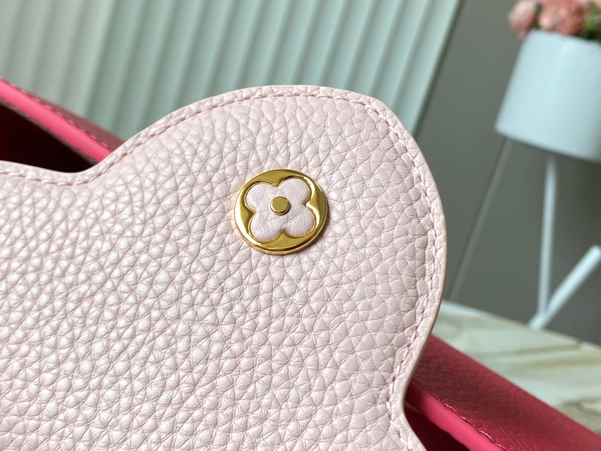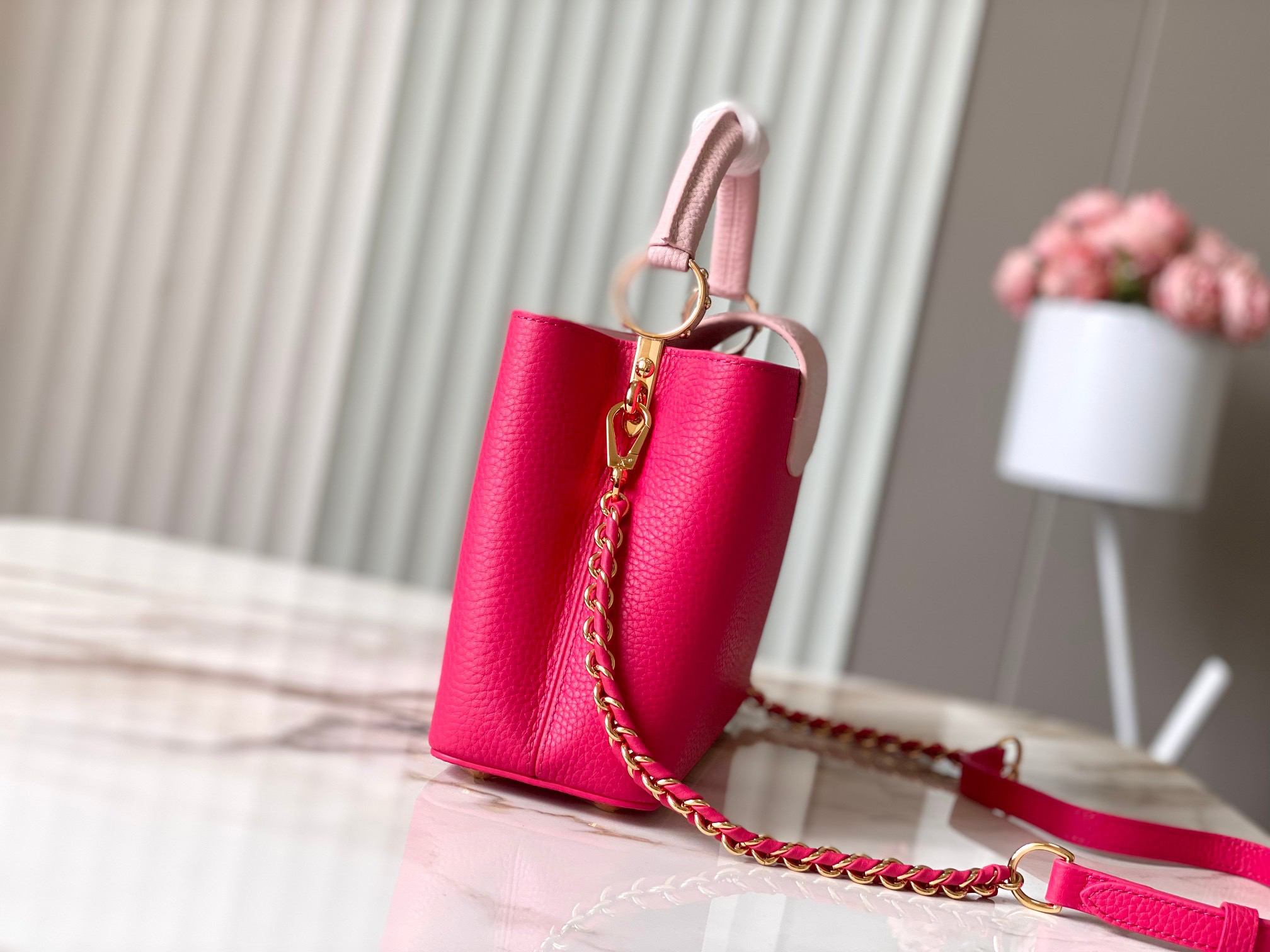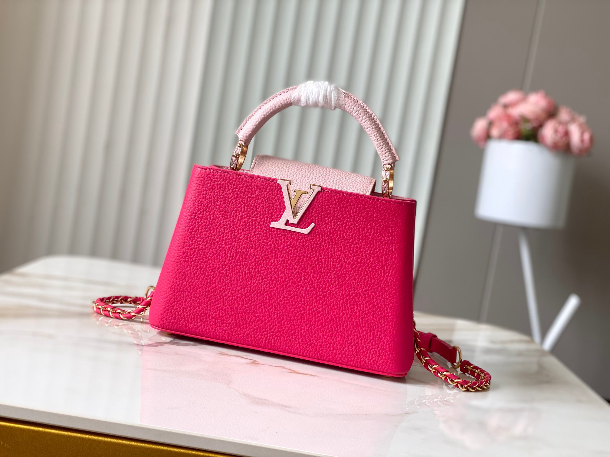 秋冬特惠💰1630 渠道级LV 新品 te级LV 全套包装 M21689/M48865玫红拼链条款 此款Taurilon皮革版Capucines 手袋呈现柔美清新的色调 令人眼前一亮 除了标志性的ding部皮革手柄 另配可脱卸、可调节编结皮革链式包带 便于肩背或斜挎 包内设有隔层和拉链口袋 可存放贵重物品 Size:27 * 18 * 9 cm