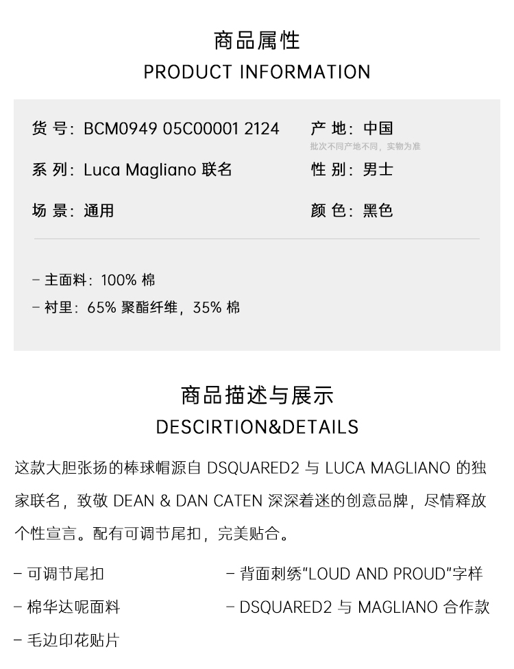 DSQUARED2 男士 Luca Magliano 联名 字母徽标印花棉质棒球帽 黑色 BCM0949 05C00001 2124