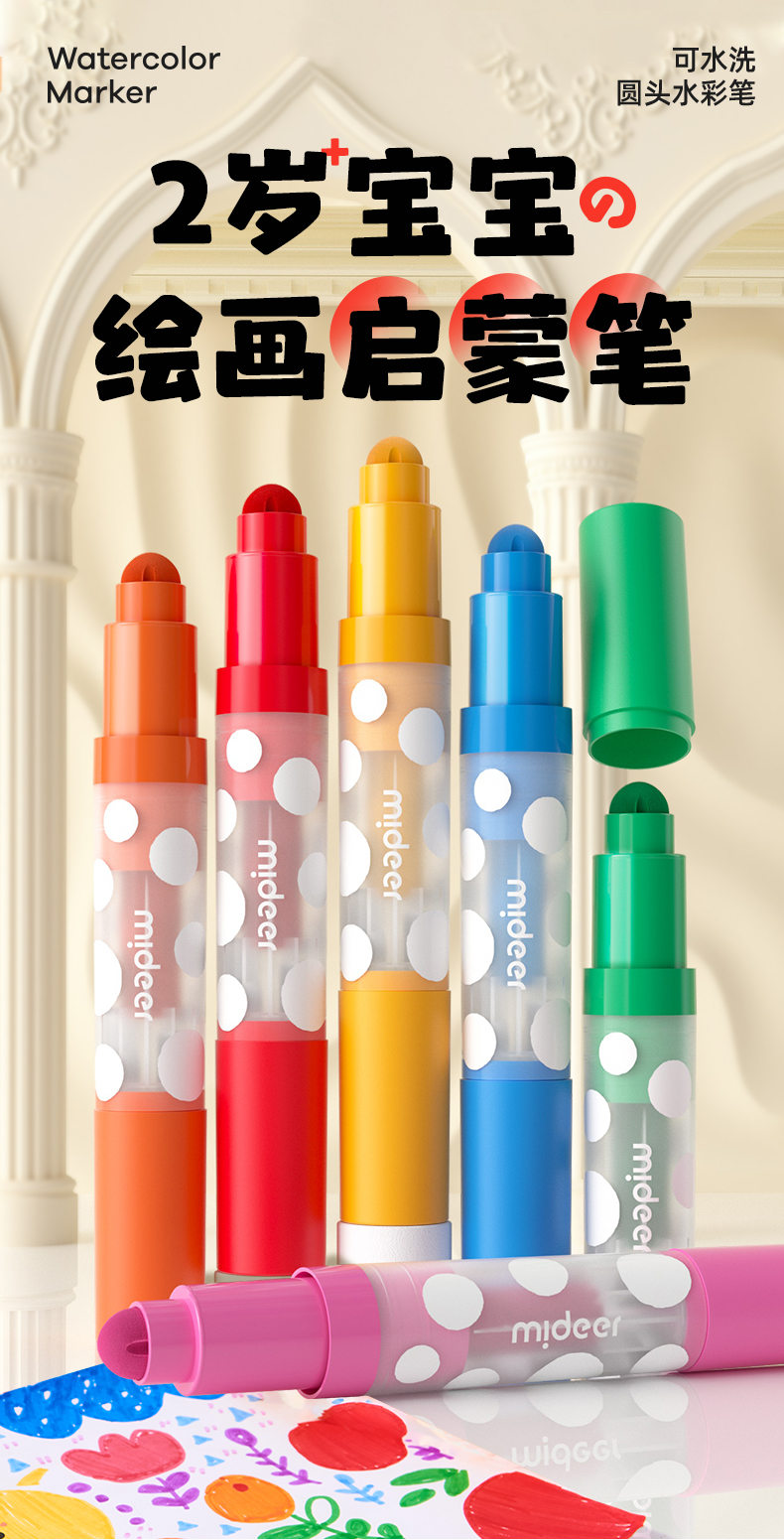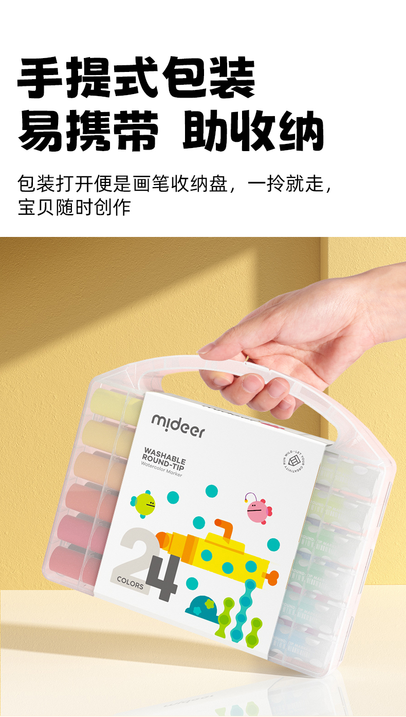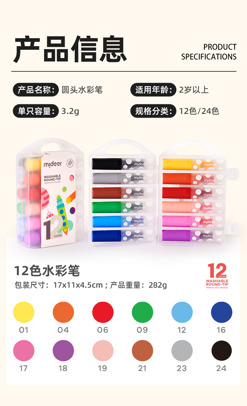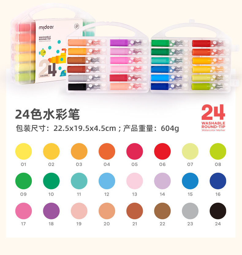 mideer弥鹿儿童圆头水彩笔可水洗幼儿园画笔套装水溶性12色宝宝绘画启蒙笔小学生涂鸦彩色笔24色画画笔涂色笔