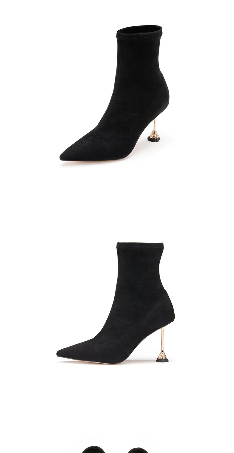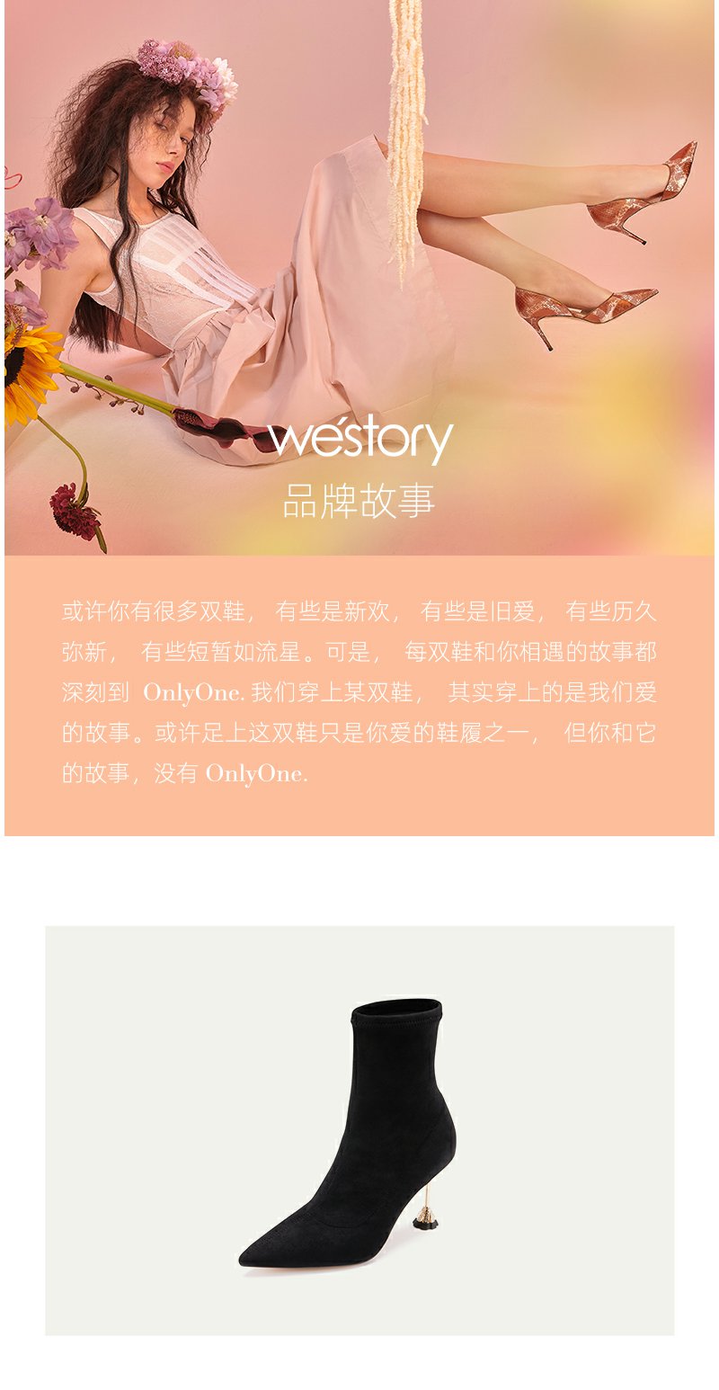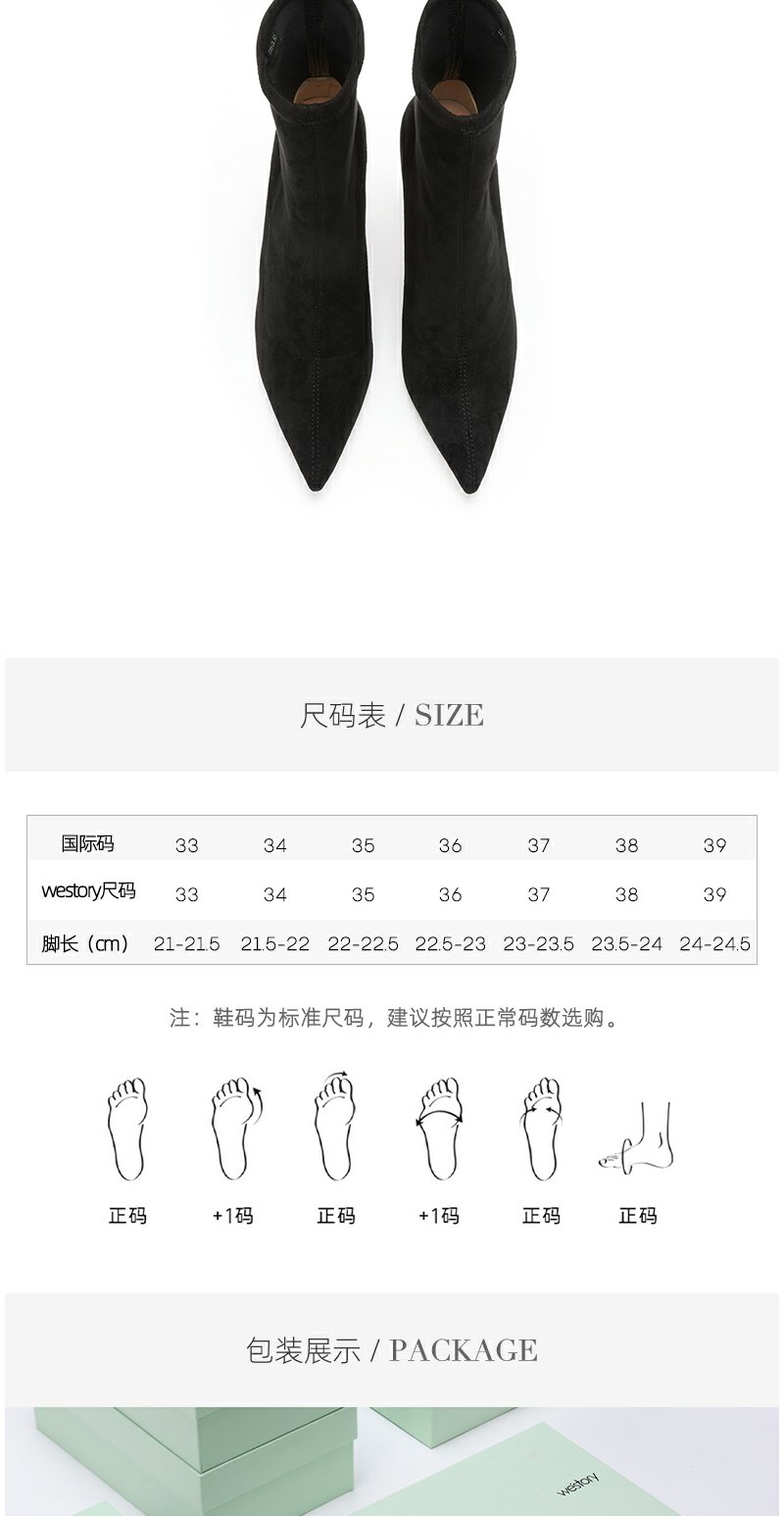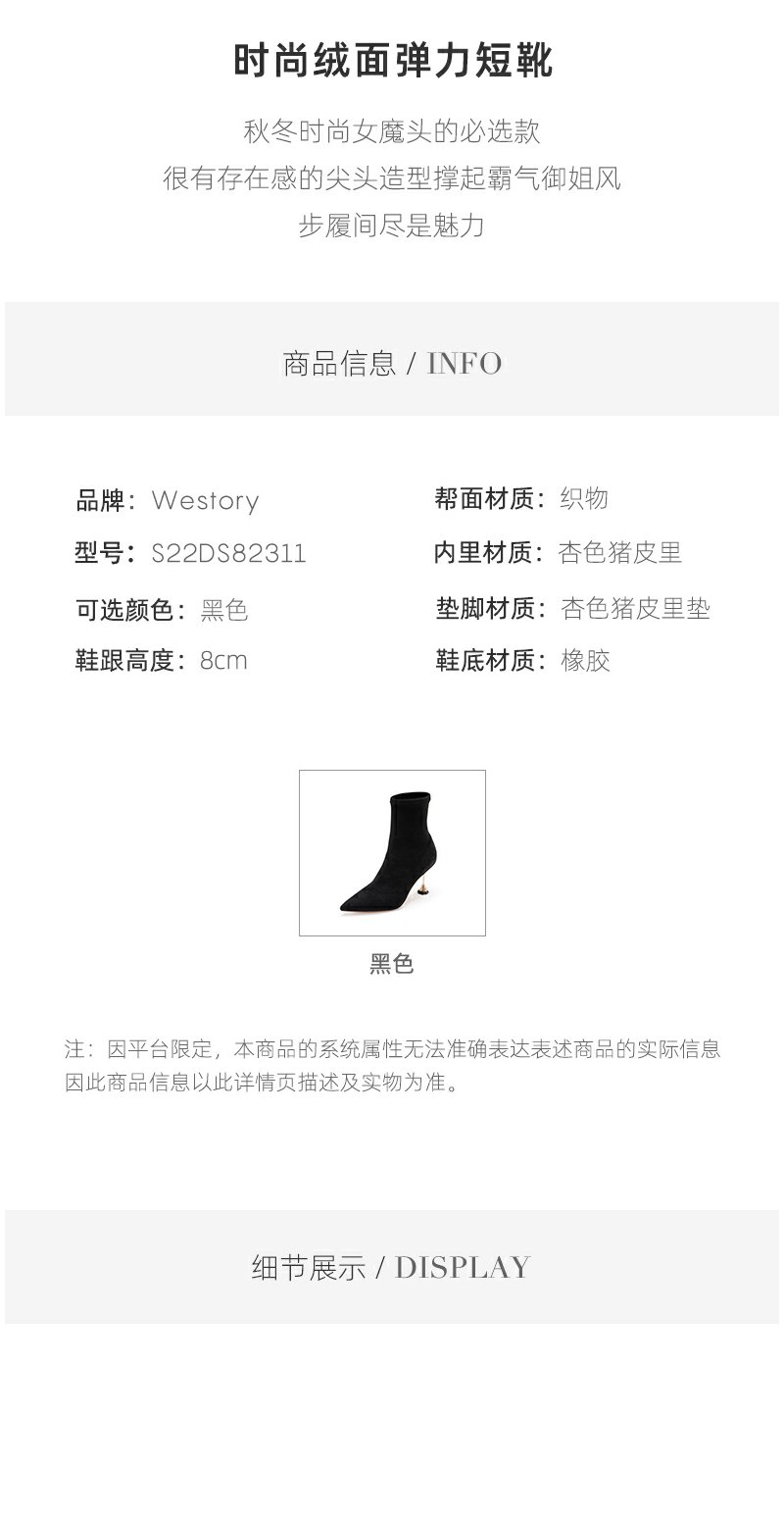 westory22年新款尖头细高跟气质秋冬黑色百搭绒面短筒靴子女82311