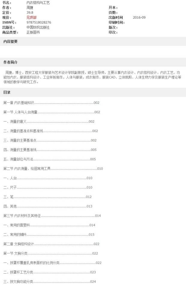 内衣结构与工艺 正版书籍 周捷 9787518028276