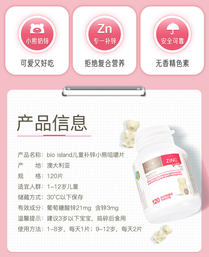 【跨境】bio island佰澳朗德 婴幼儿宝宝儿童补锌小熊咀嚼片 120粒【保税直发】