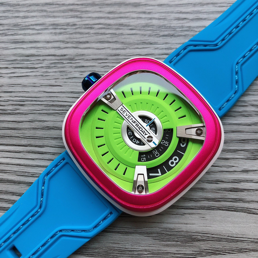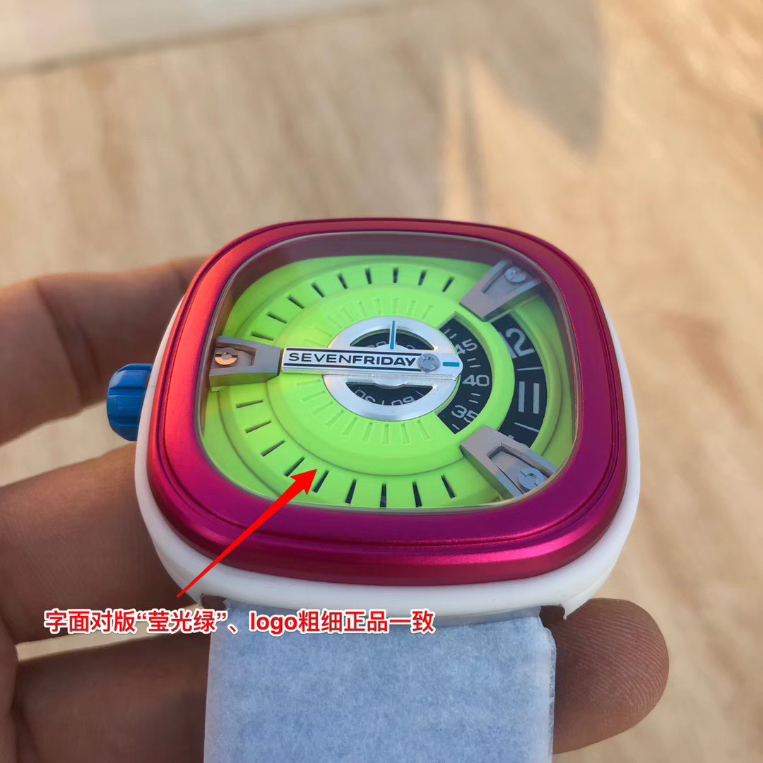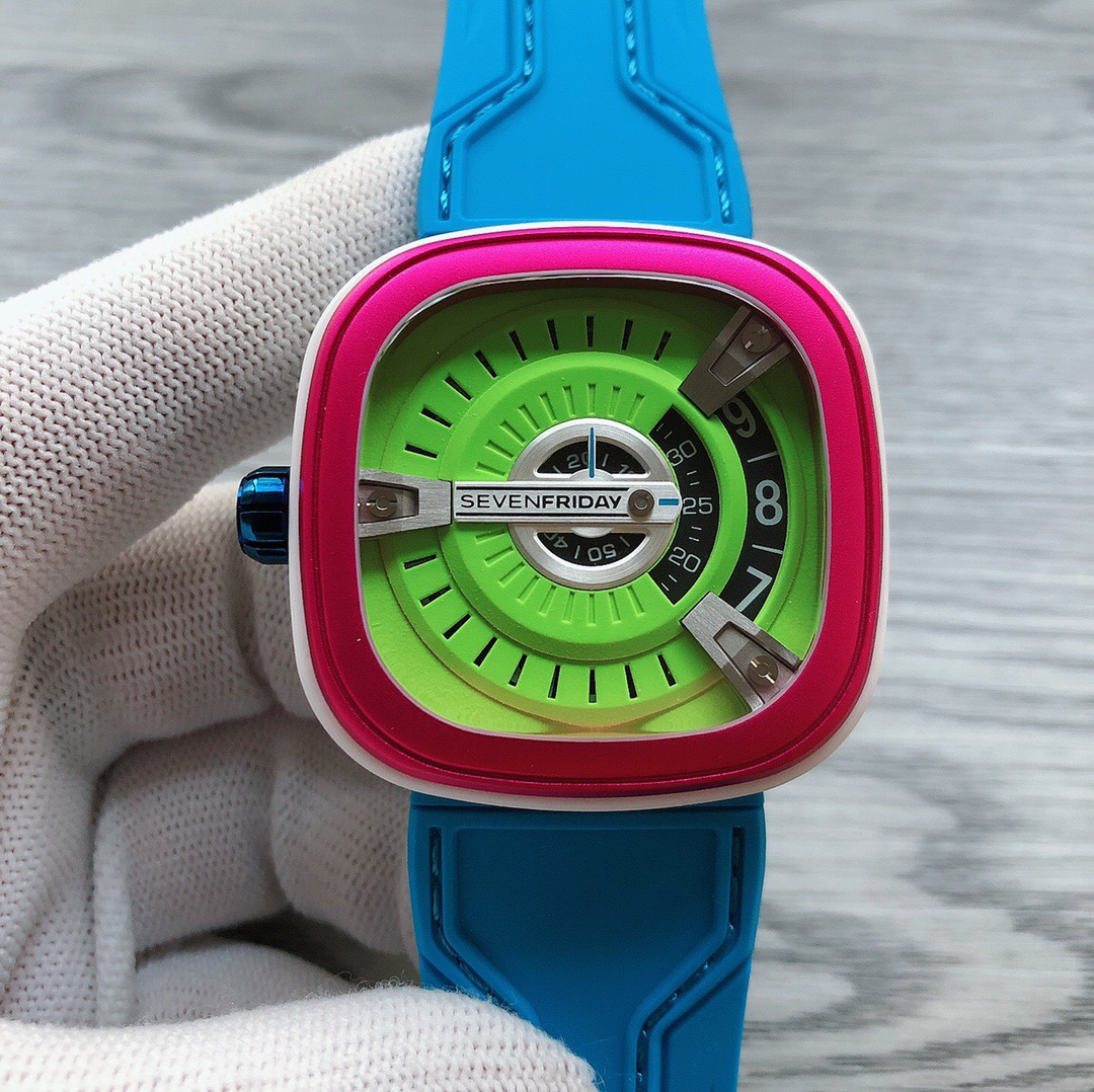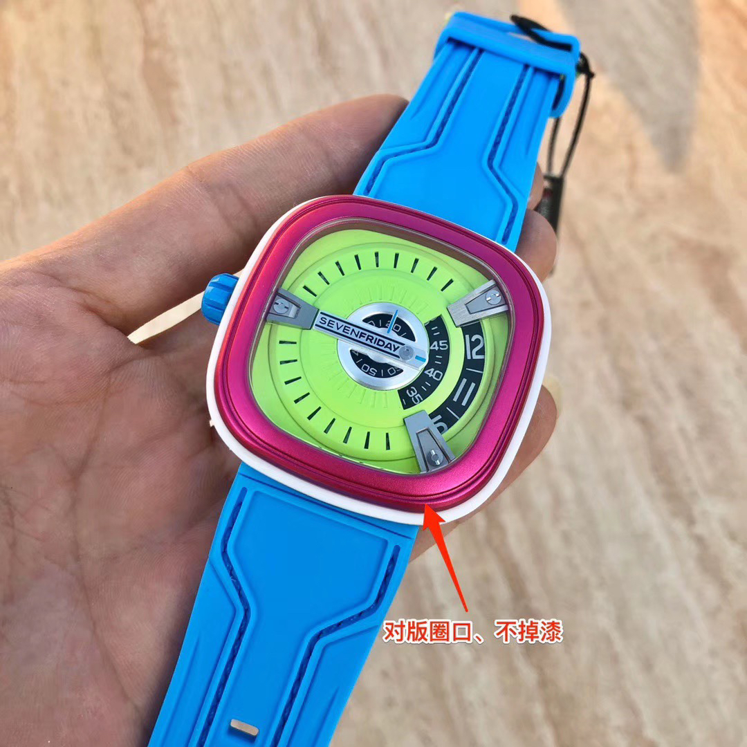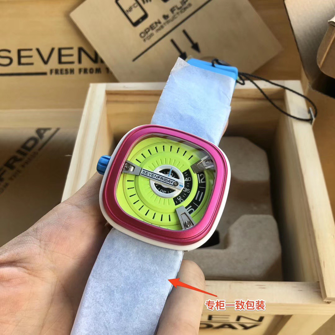 SevenFriday's "coolest guy" M2/03- Arrives on Seven Fridays SevenFridaySEVENFRIDAY collaborates with art master Tomyboy to bring a limited edition M2/03. The entire dial is full of night light, and the coolest and most dazzling Seven Fridays are coming. Expressing oneself with color, it is an absolute nightclub flirting tool with super fluorescent effect. Candy color matching is suitable for trendsetters and girls to wear. 30 meters waterproof and exclusive support for "SevenFridaySEVENFCAPTP" verification of the original Nishitetsu automatic mechanical movement. Please pay attention to the details of the workmanship!sevenFriday“最炫酷的仔”M2/03—七个星期五到货 SevenFridaySEVENFRIDAY携手艺术大师Tomyboy带来限量版M2/03、整个表盘全夜光最炫最酷的七个星期五来袭、用色彩来表达自我,绝对夜店撩妹神器,超强荧光效果,糖果色搭适合潮人和妹子佩戴 30米防水防 独家支持“sevenFriday”NFCAPP验证 原装西铁城自动机械机芯 请认准做工细节!