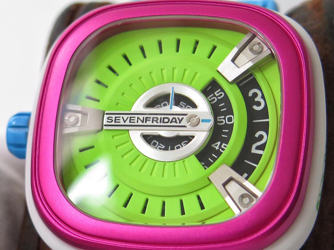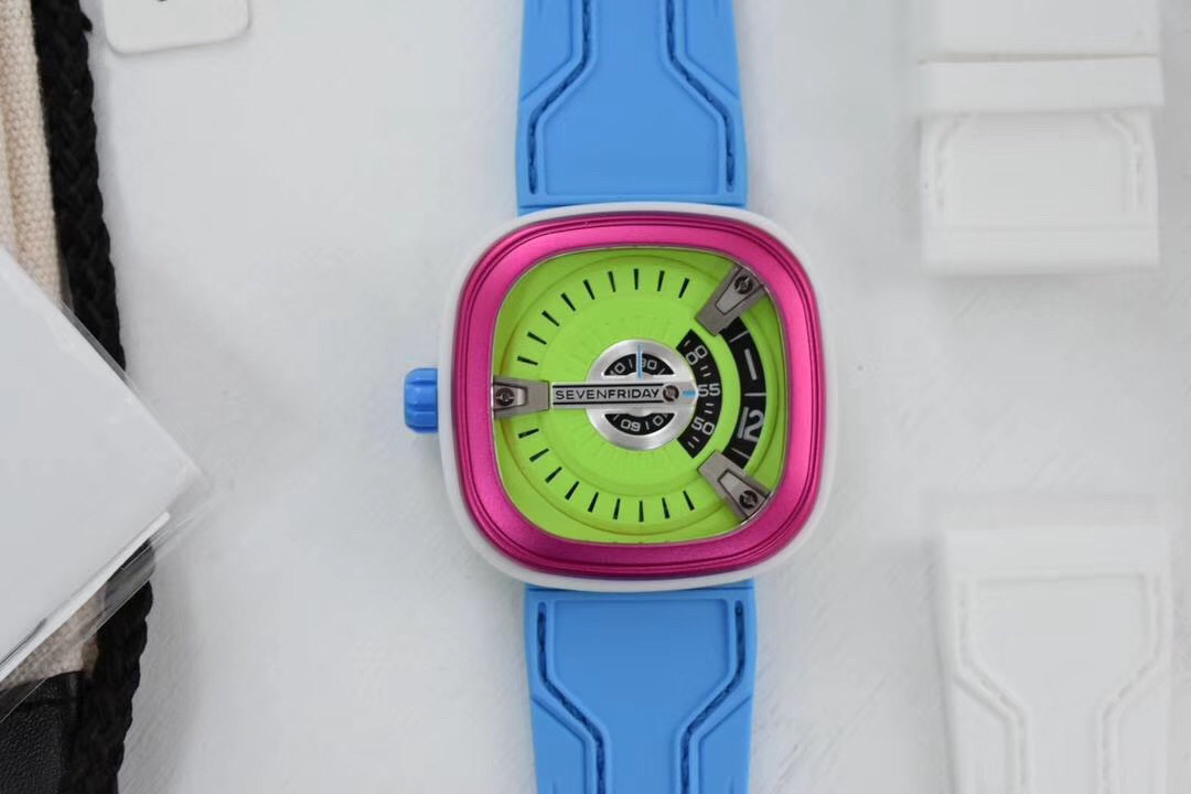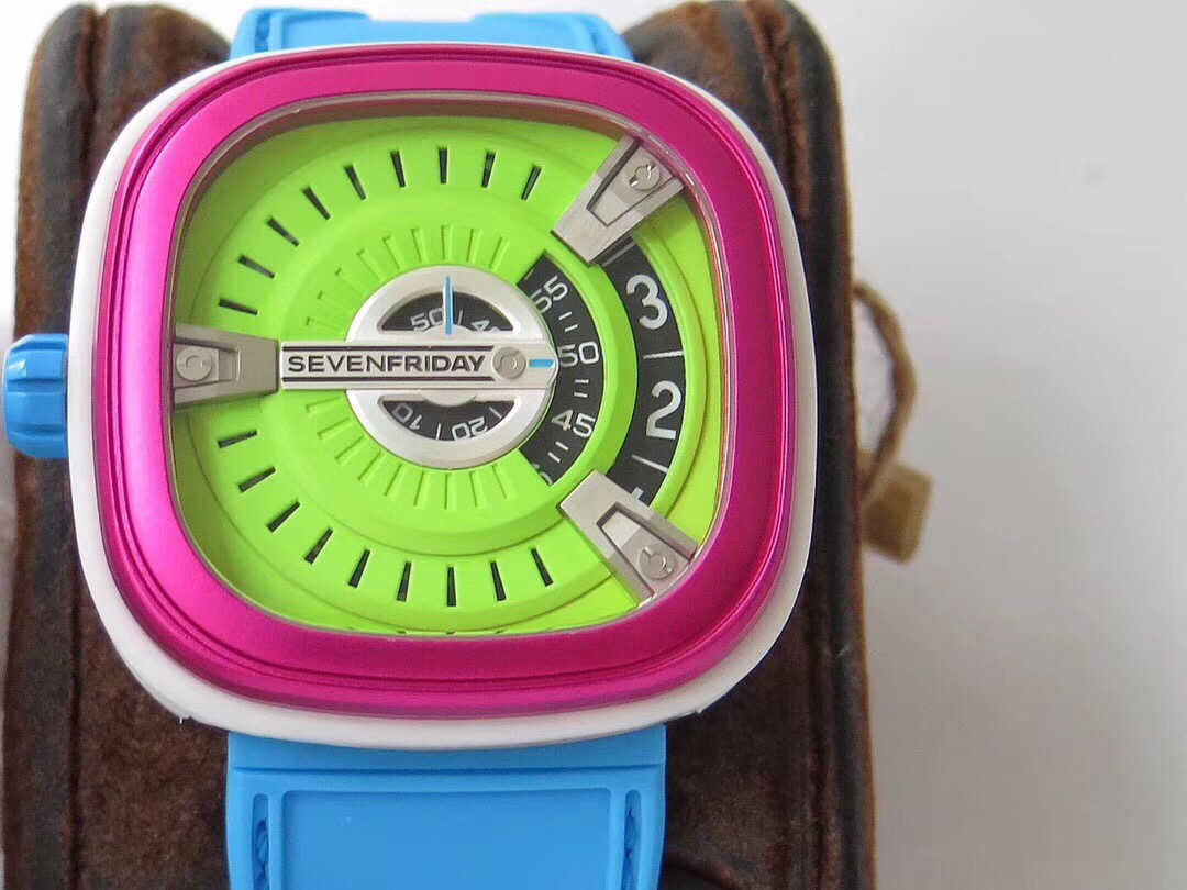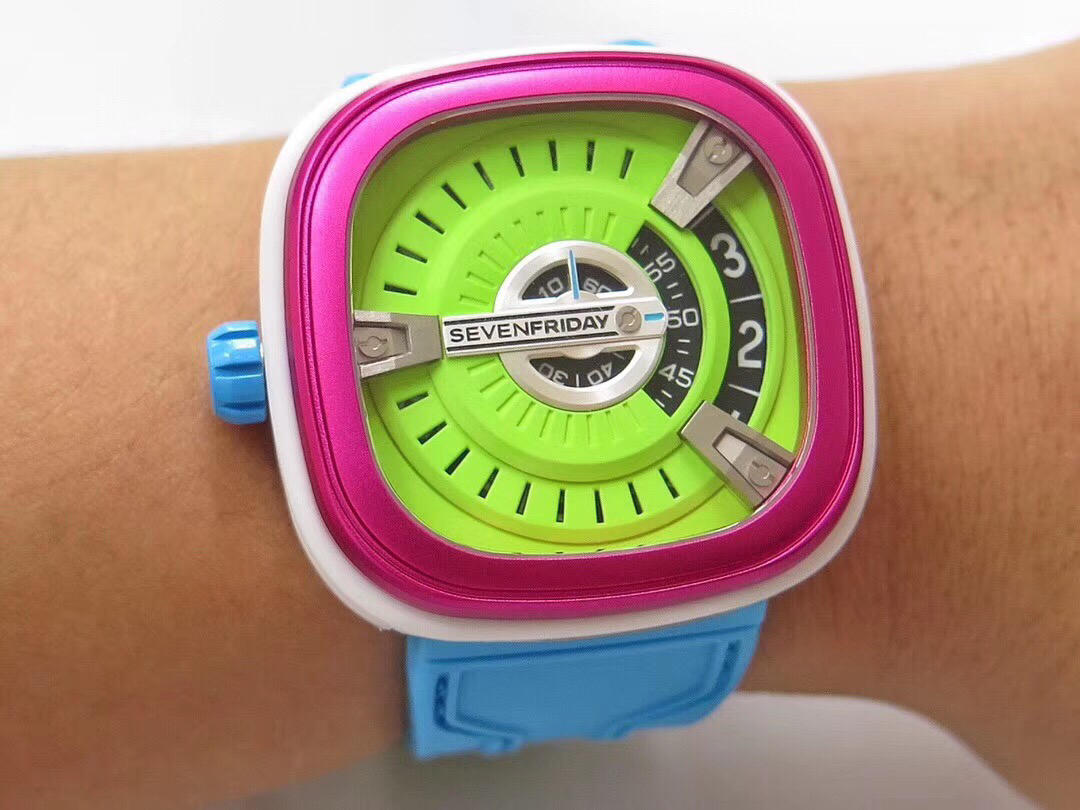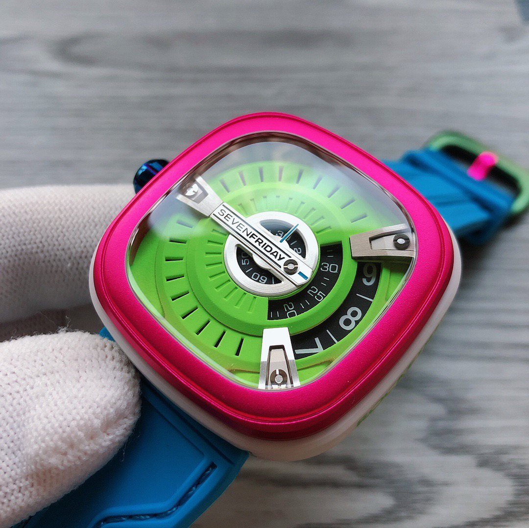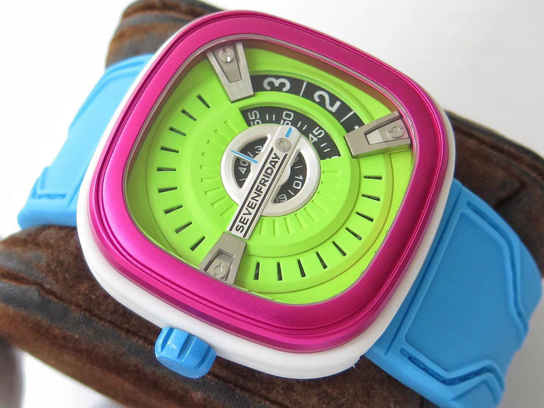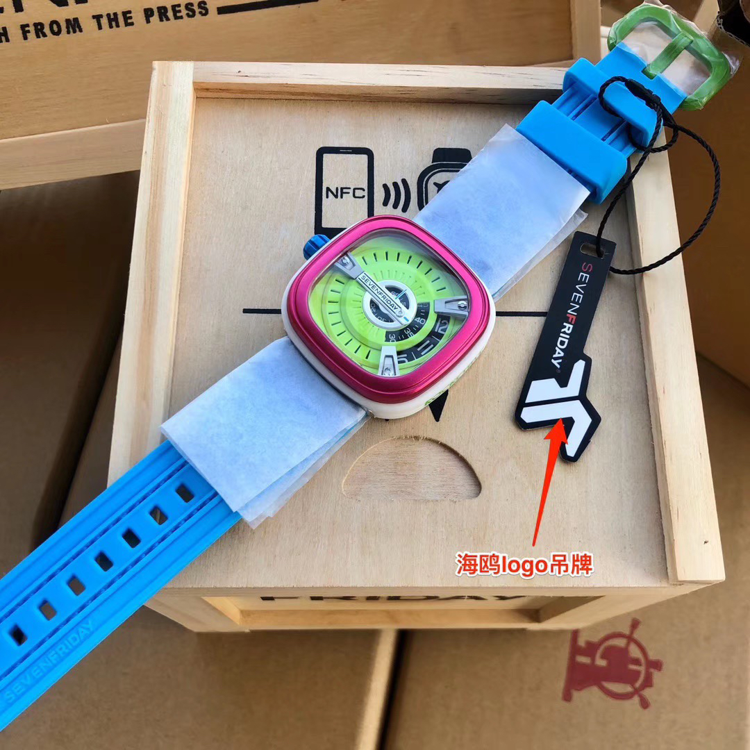 SevenFriday's "coolest guy" M2/03- Arrives on Seven Fridays SevenFridaySEVENFRIDAY collaborates with art master Tomyboy to bring a limited edition M2/03. The entire dial is full of night light, and the coolest and most dazzling Seven Fridays are coming. Expressing oneself with color, it is an absolute nightclub flirting tool with super fluorescent effect. Candy color matching is suitable for trendsetters and girls to wear. 30 meters waterproof and exclusive support for "SevenFridaySEVENFCAPTP" verification of the original Nishitetsu automatic mechanical movement. Please pay attention to the details of the workmanship!sevenFriday“最炫酷的仔”M2/03—七个星期五到货 SevenFridaySEVENFRIDAY携手艺术大师Tomyboy带来限量版M2/03、整个表盘全夜光最炫最酷的七个星期五来袭、用色彩来表达自我,绝对夜店撩妹神器,超强荧光效果,糖果色搭适合潮人和妹子佩戴 30米防水防 独家支持“sevenFriday”NFCAPP验证 原装西铁城自动机械机芯 请认准做工细节!
