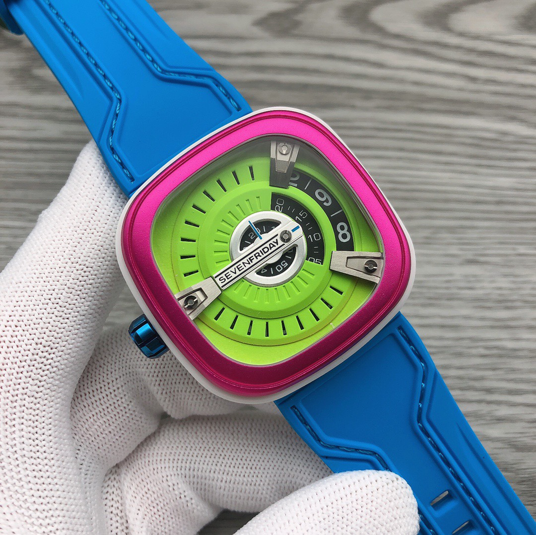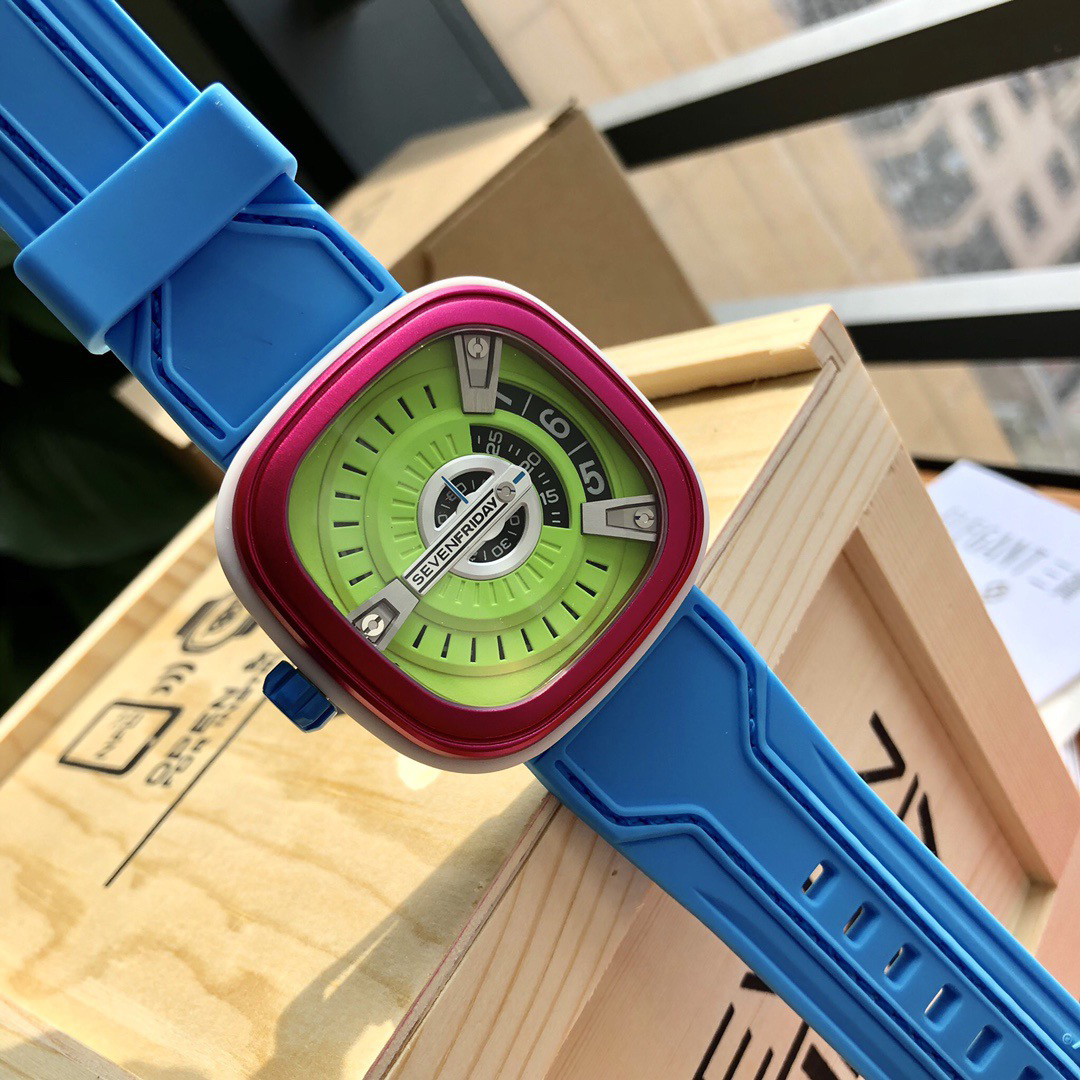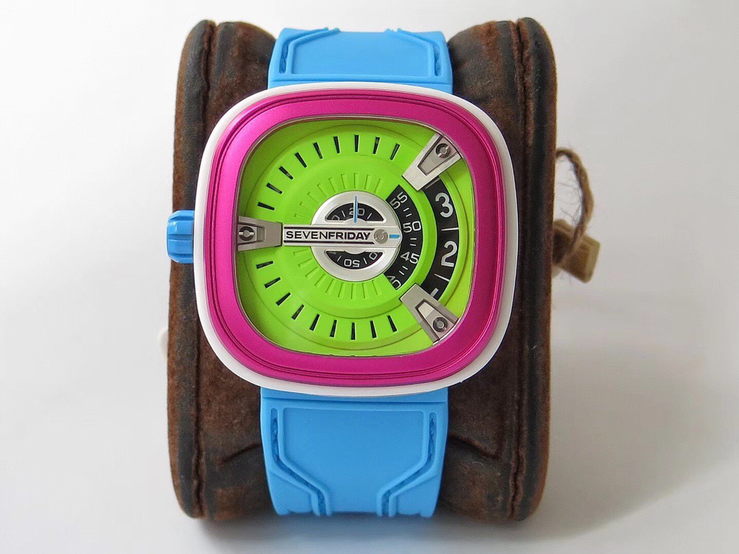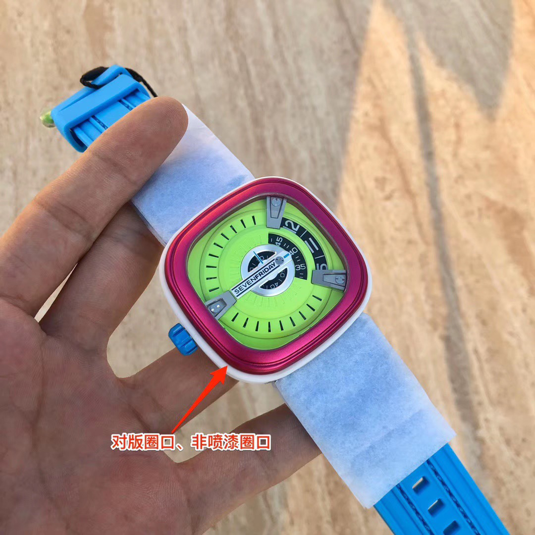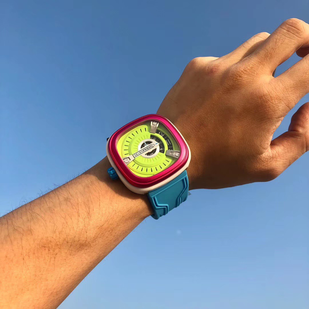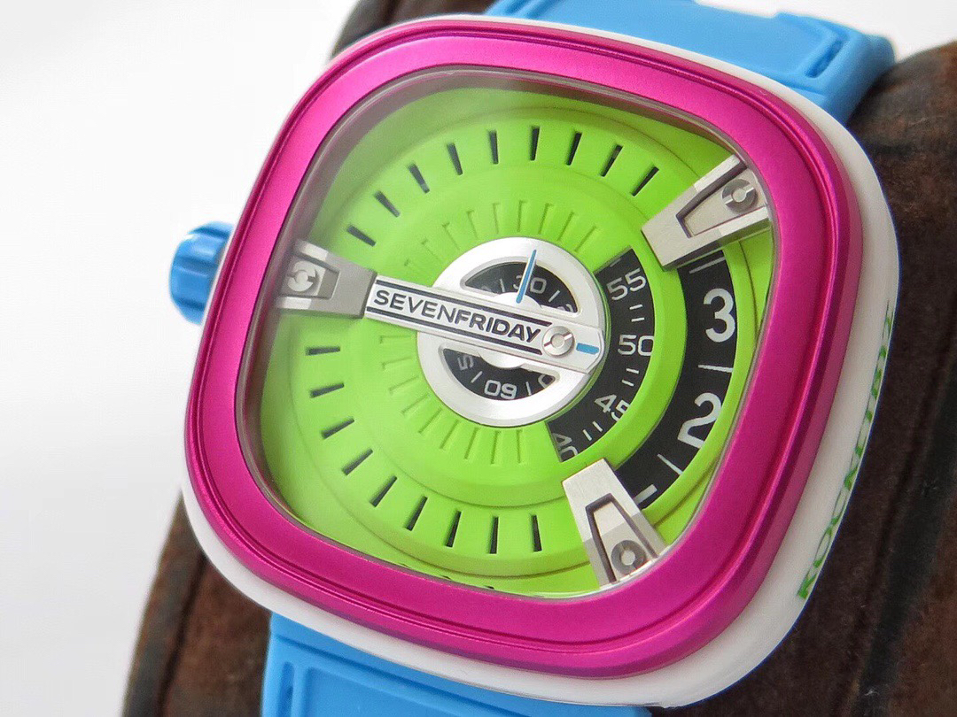 SevenFriday's "coolest guy" M2/03- Arrives on Seven Fridays SevenFridaySEVENFRIDAY collaborates with art master Tomyboy to bring a limited edition M2/03. The entire dial is full of night light, and the coolest and most dazzling Seven Fridays are coming. Expressing oneself with color, it is an absolute nightclub flirting tool with super fluorescent effect. Candy color matching is suitable for trendsetters and girls to wear. 30 meters waterproof and exclusive support for "SevenFridaySEVENFCAPTP" verification of the original Nishitetsu automatic mechanical movement. Please pay attention to the details of the workmanship!sevenFriday“最炫酷的仔”M2/03—七个星期五到货 SevenFridaySEVENFRIDAY携手艺术大师Tomyboy带来限量版M2/03、整个表盘全夜光最炫最酷的七个星期五来袭、用色彩来表达自我,绝对夜店撩妹神器,超强荧光效果,糖果色搭适合潮人和妹子佩戴 30米防水防 独家支持“sevenFriday”NFCAPP验证 原装西铁城自动机械机芯 请认准做工细节!