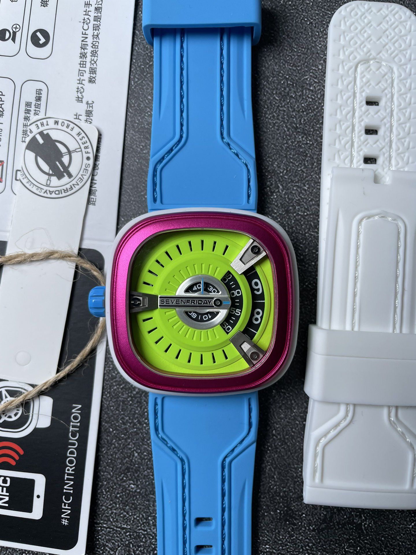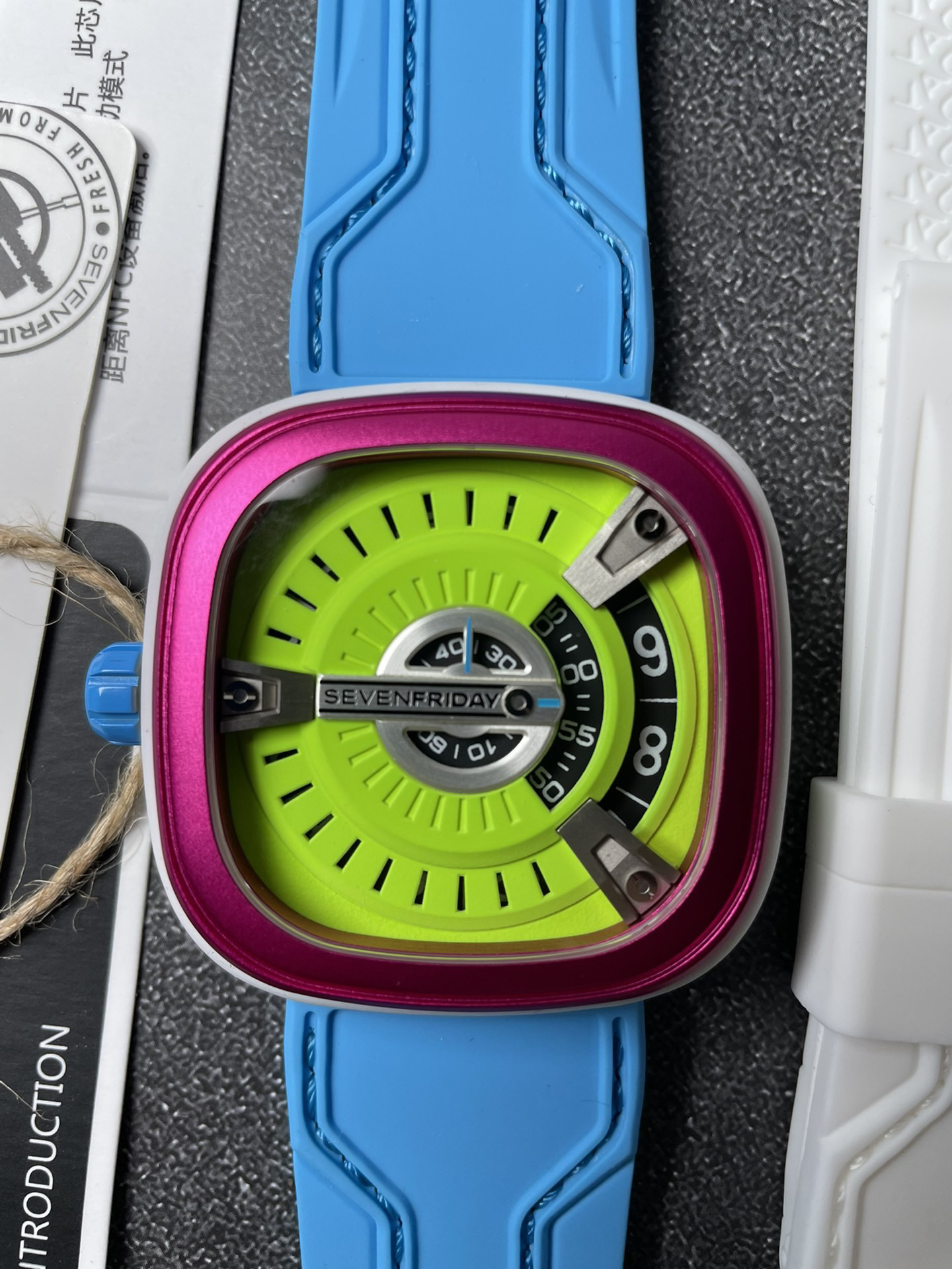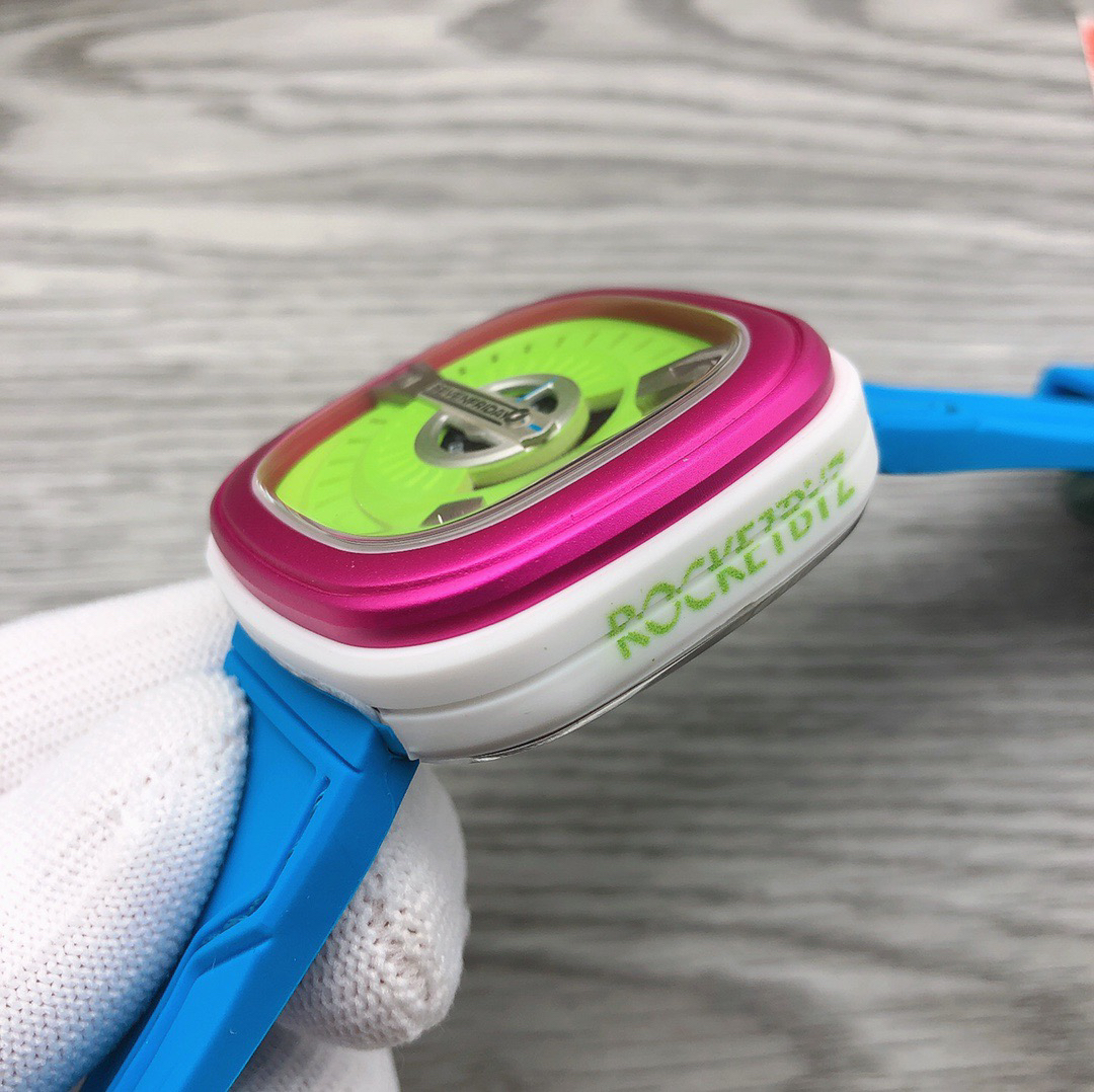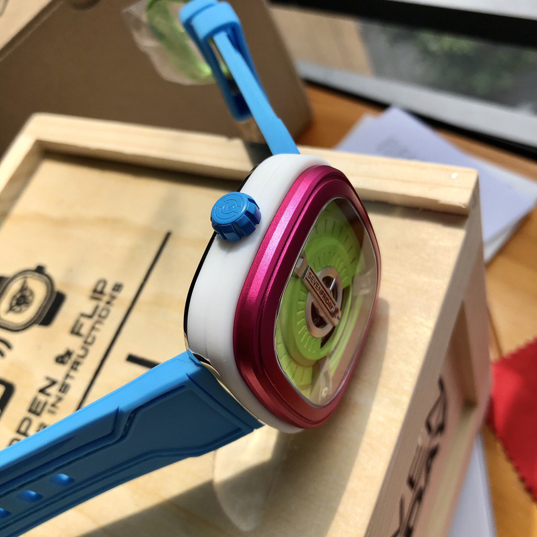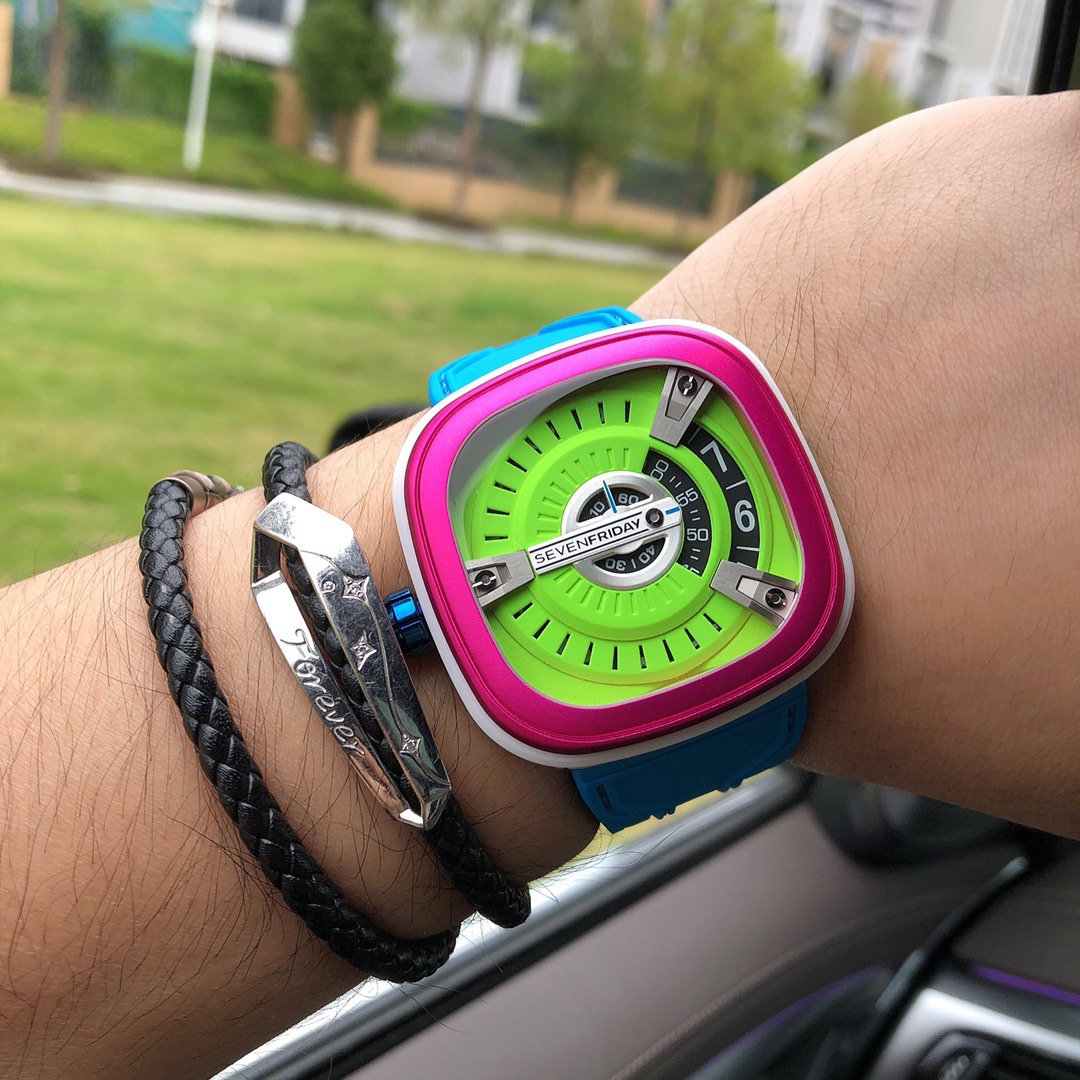 SevenFriday's "coolest guy" M2/03- Arrives on Seven Fridays SevenFridaySEVENFRIDAY collaborates with art master Tomyboy to bring a limited edition M2/03. The entire dial is full of night light, and the coolest and most dazzling Seven Fridays are coming. Expressing oneself with color, it is an absolute nightclub flirting tool with super fluorescent effect. Candy color matching is suitable for trendsetters and girls to wear. 30 meters waterproof and exclusive support for "SevenFridaySEVENFCAPTP" verification of the original Nishitetsu automatic mechanical movement. Please pay attention to the details of the workmanship!sevenFriday“最炫酷的仔”M2/03—七个星期五到货 SevenFridaySEVENFRIDAY携手艺术大师Tomyboy带来限量版M2/03、整个表盘全夜光最炫最酷的七个星期五来袭、用色彩来表达自我,绝对夜店撩妹神器,超强荧光效果,糖果色搭适合潮人和妹子佩戴 30米防水防 独家支持“sevenFriday”NFCAPP验证 原装西铁城自动机械机芯 请认准做工细节!