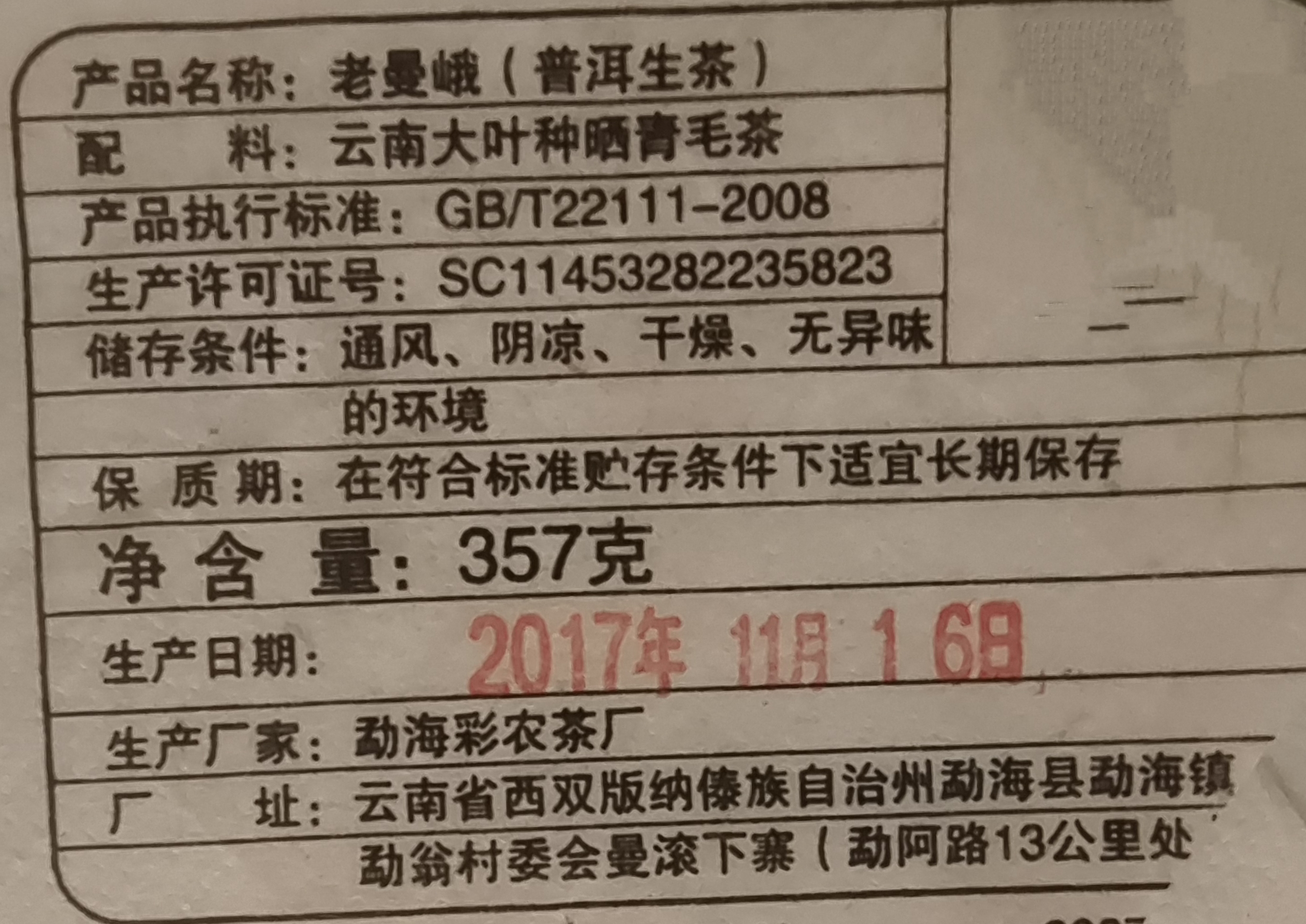 彩农茶|老曼峨2017年秋古树纯料青饼
