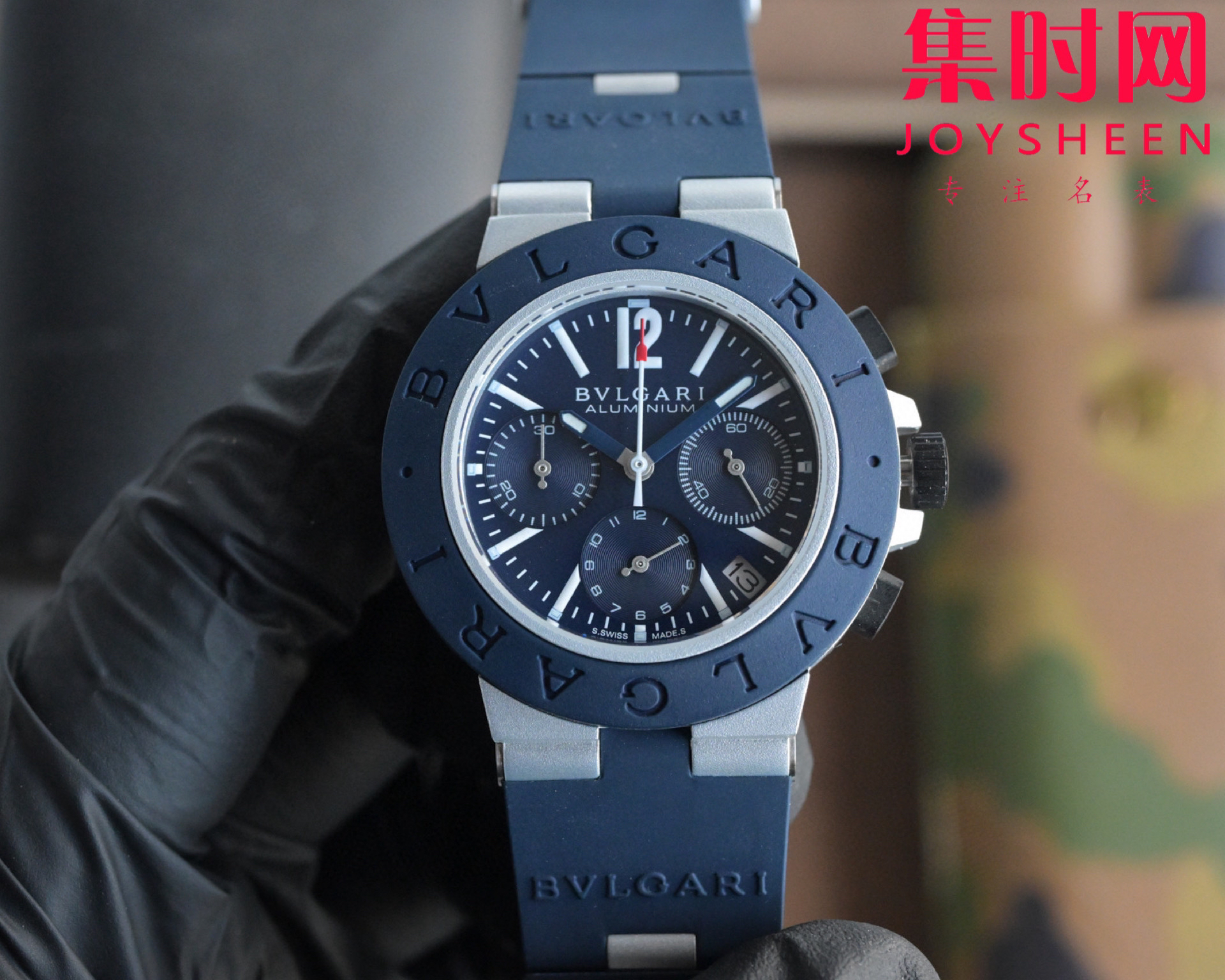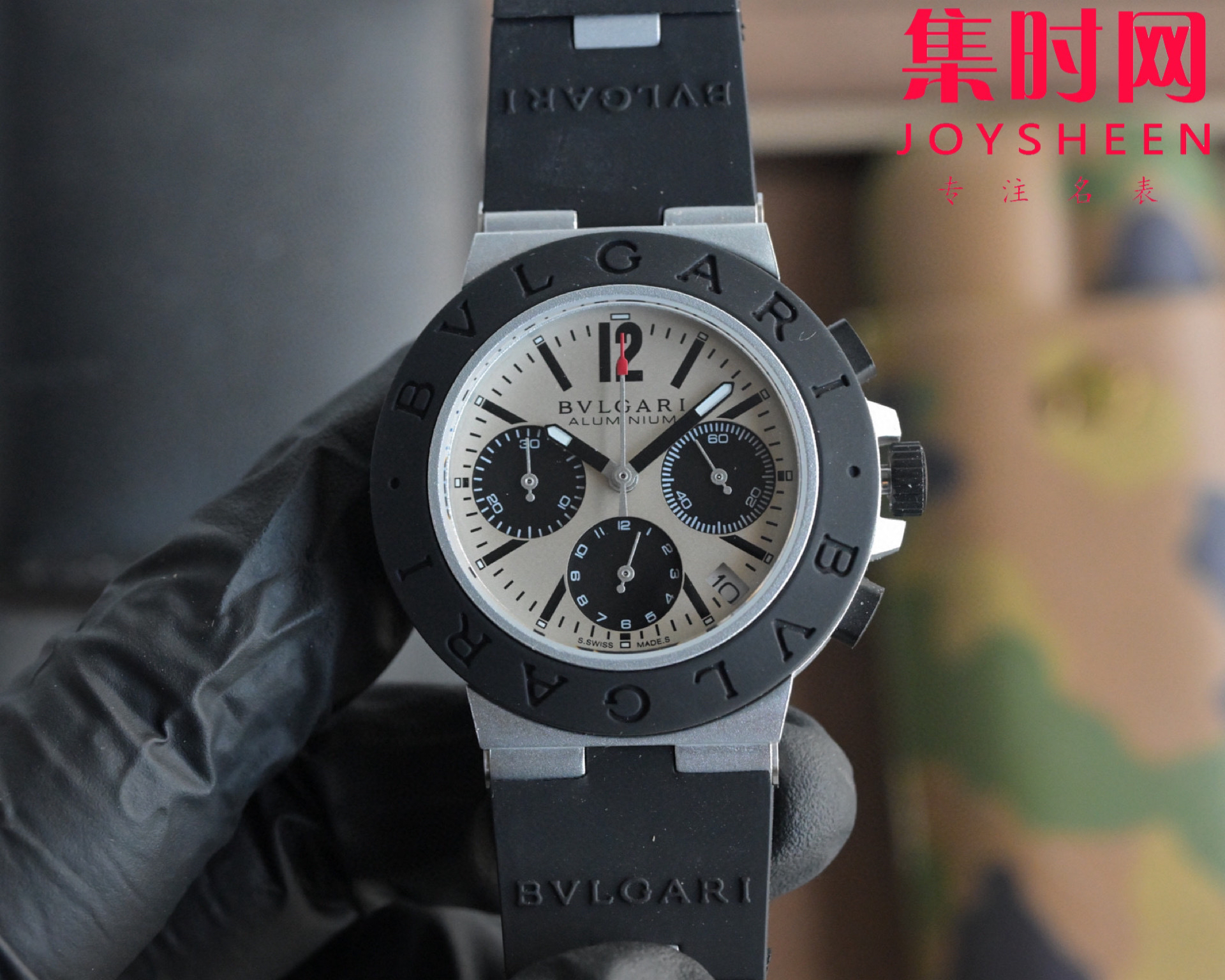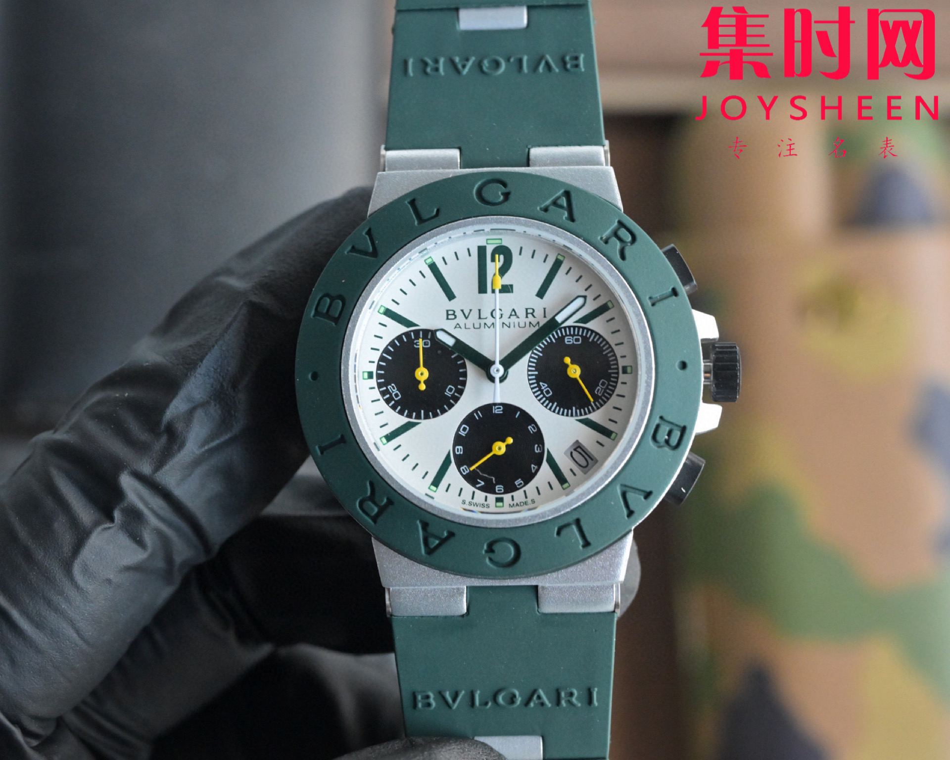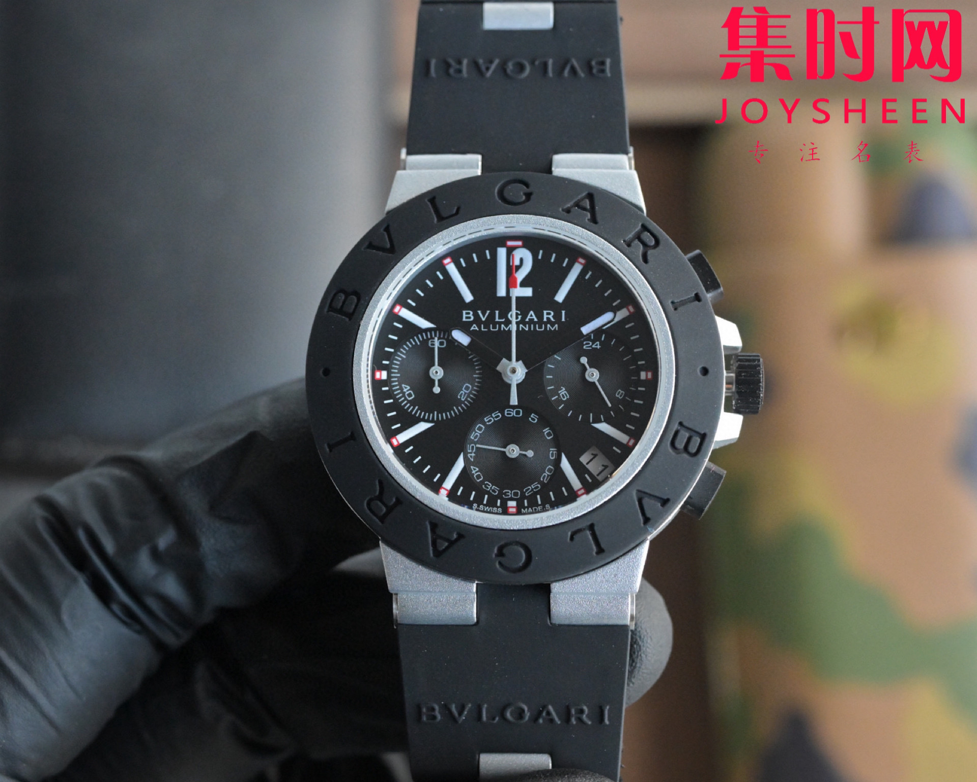 搭载进口VK计时石英机芯,表帶采用麾术貼,适配日常、休闲等多元场景。表壳为哑光喷砂铝合金(轻盈耐用),表圈与表带采用FKM橡胶(抗汗耐磨),表背为DLC涂层钛金属(提升抗划性)。3/6/9点位设蜗形纹计时副盘,指针与刻度覆有Super-LumiNova夜光涂层,中央计时秒针尖端饰红色细节,4点半位置设日期视窗,藍宝石玻璃鏡片,防水100米。延续系列标志性的"BVLGARI BVLGARI"表圈设计,兼具意式优雅与运动质感,是宝格丽创新材质与经典设计结合的代表作品之一,兼具佩戴实用性与收藏辨识度。