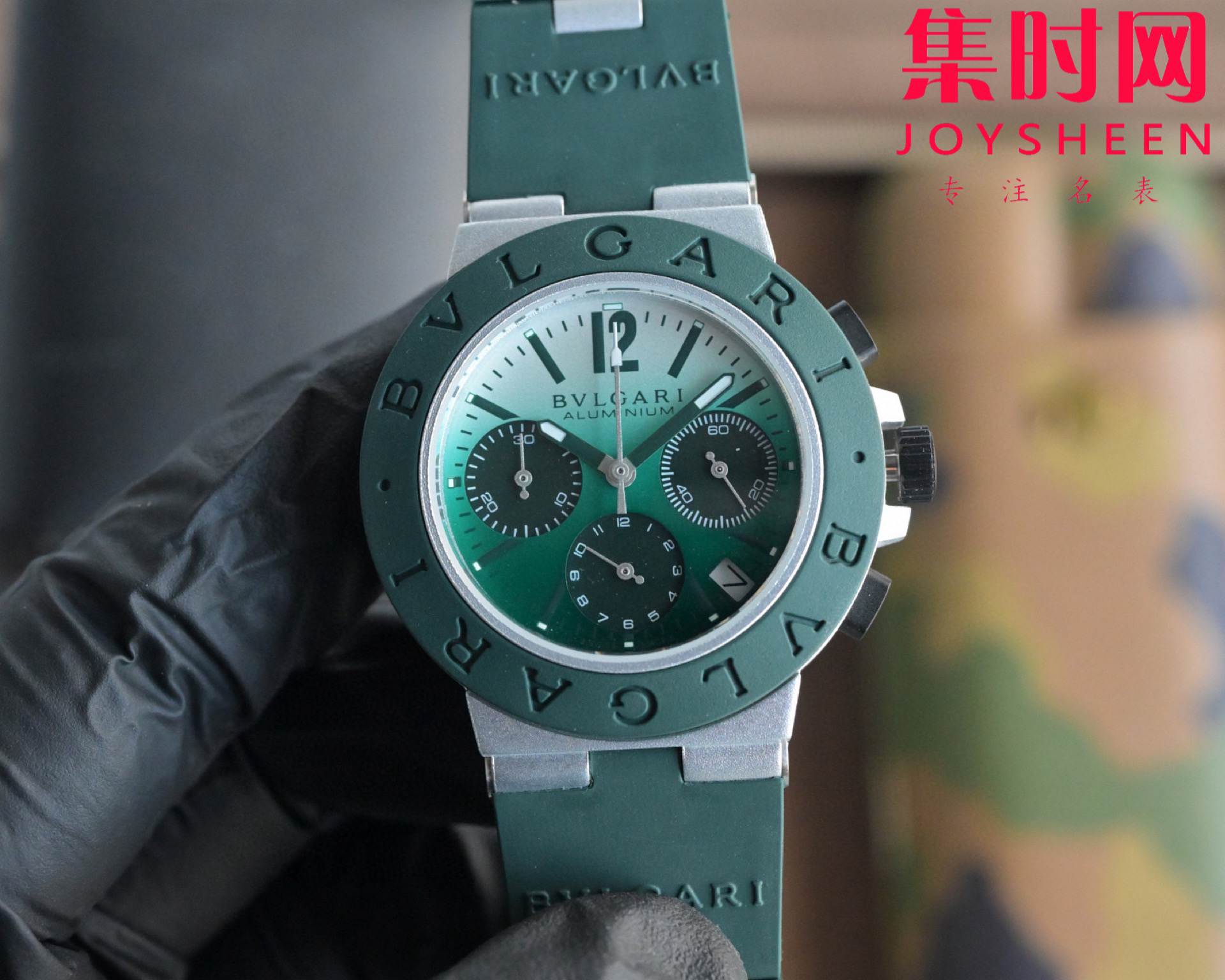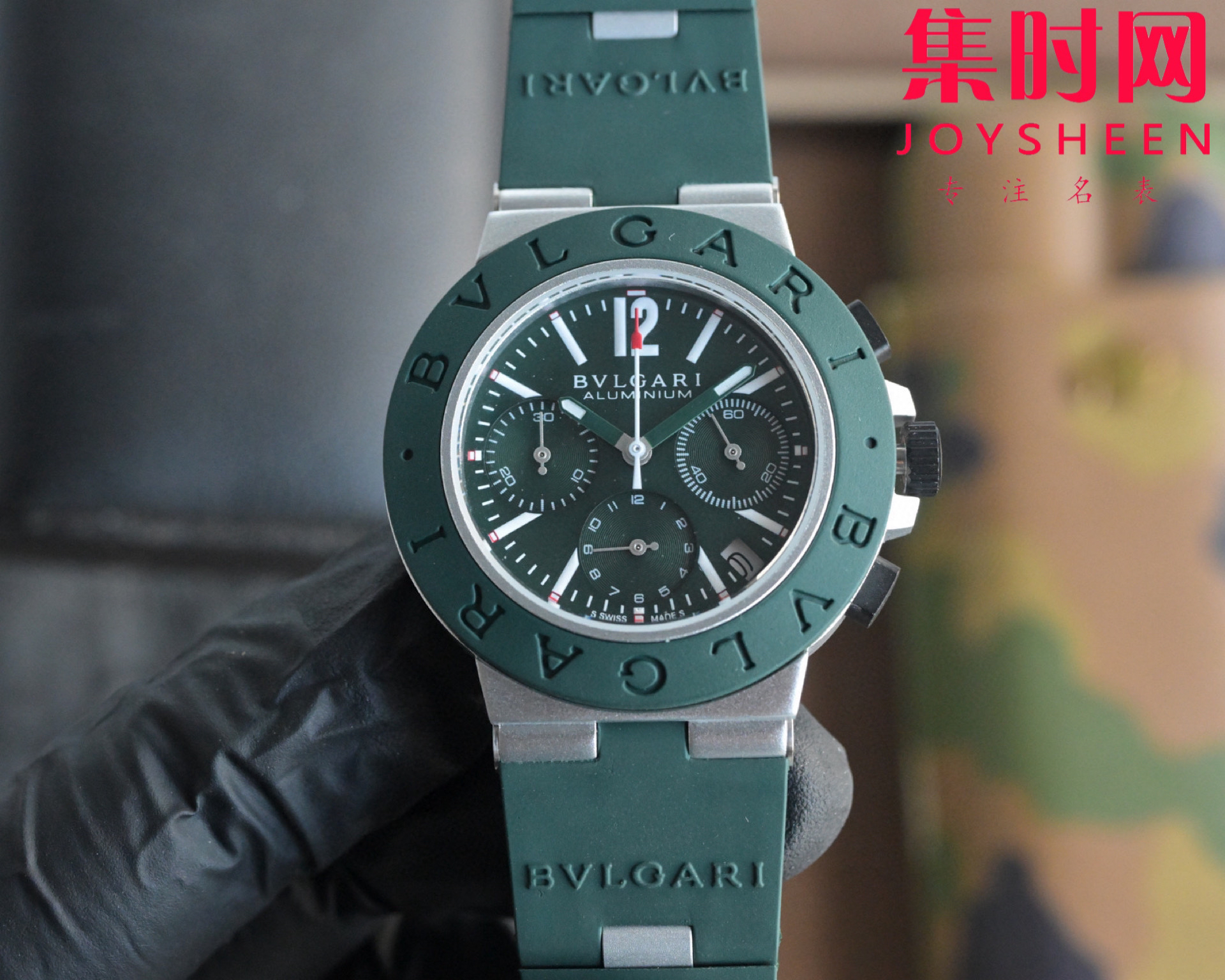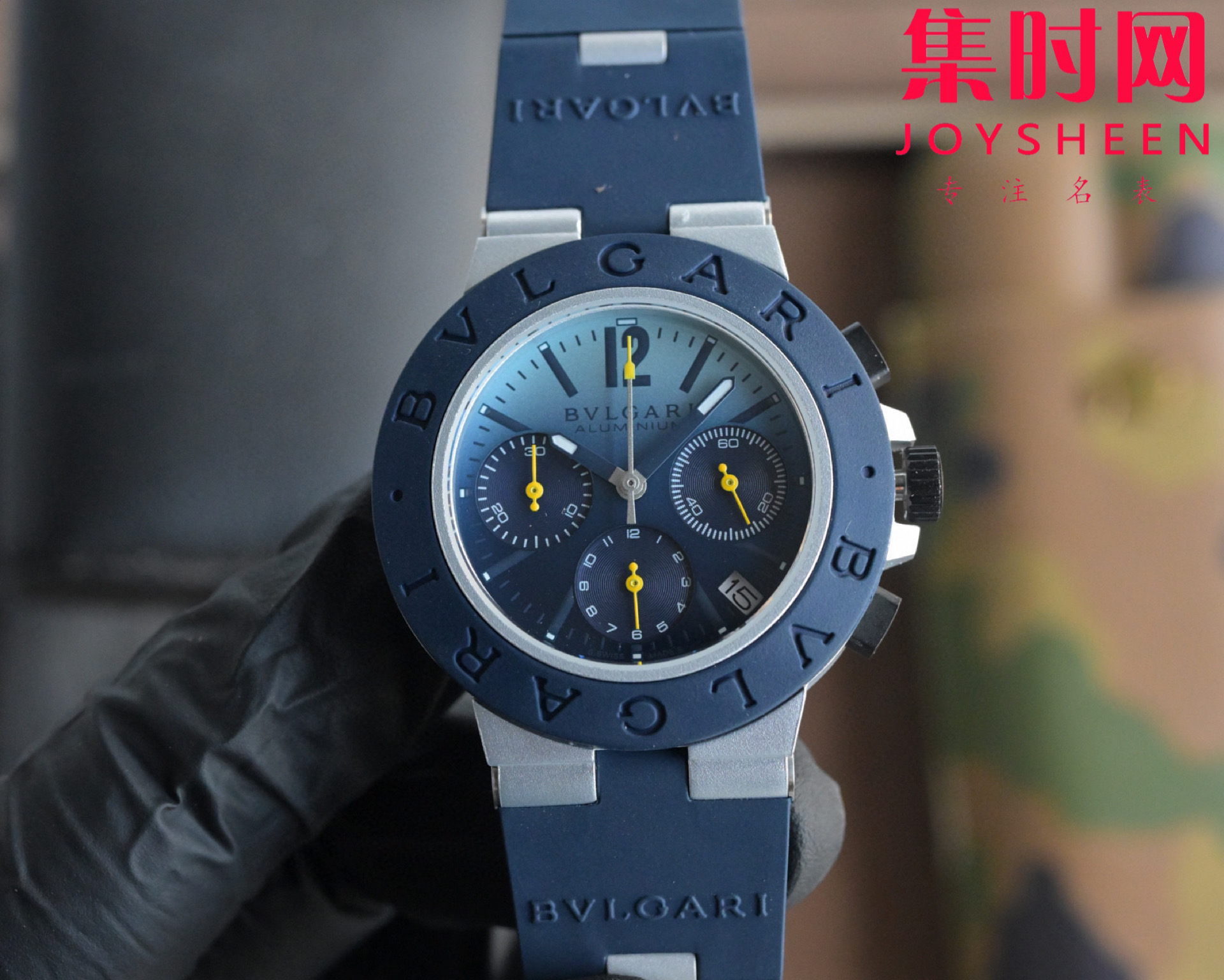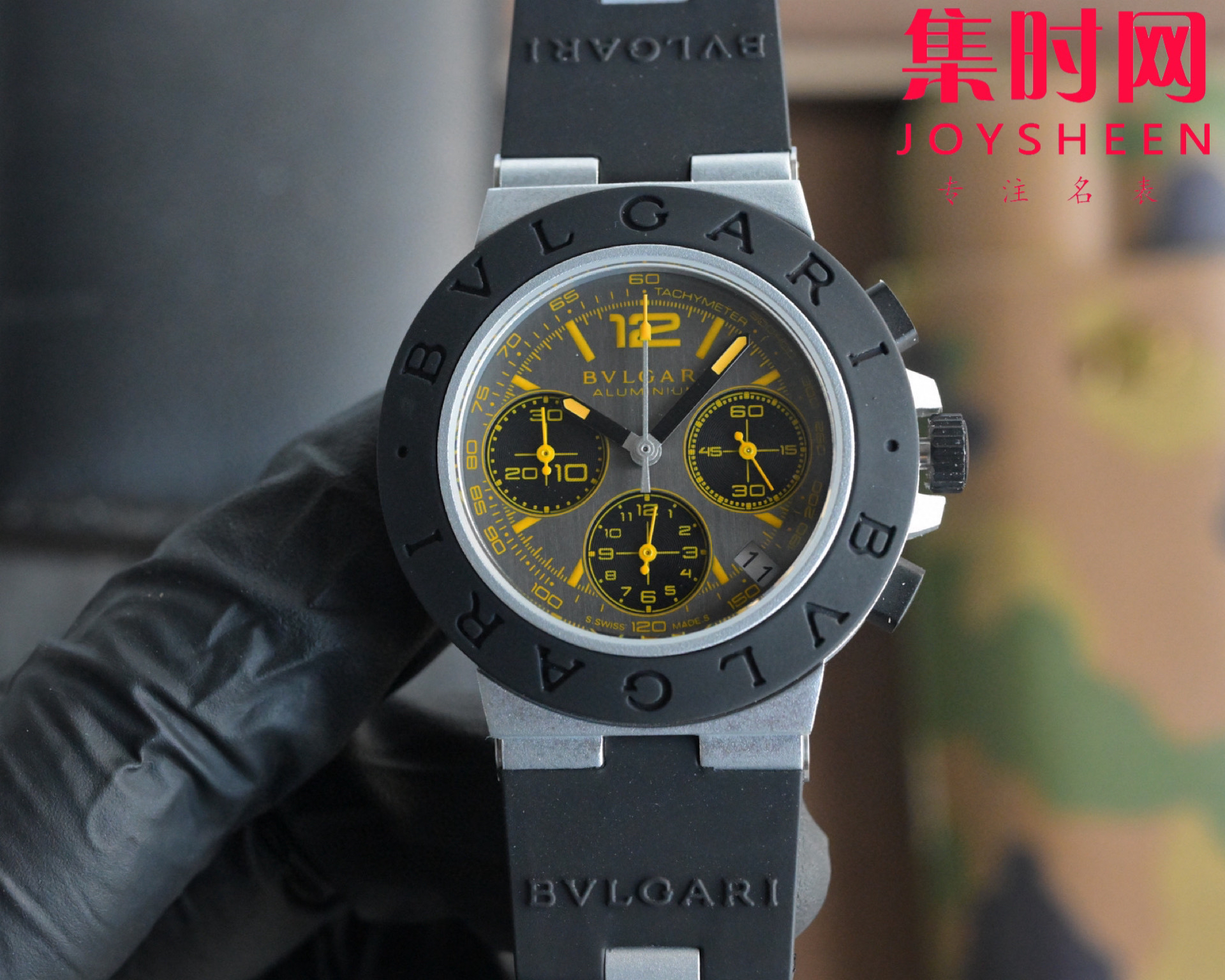 搭载进口VK计时石英机芯,表帶采用麾术貼,适配日常、休闲等多元场景。表壳为哑光喷砂铝合金(轻盈耐用),表圈与表带采用FKM橡胶(抗汗耐磨),表背为DLC涂层钛金属(提升抗划性)。3/6/9点位设蜗形纹计时副盘,指针与刻度覆有Super-LumiNova夜光涂层,中央计时秒针尖端饰红色细节,4点半位置设日期视窗,藍宝石玻璃鏡片,防水100米。延续系列标志性的"BVLGARI BVLGARI"表圈设计,兼具意式优雅与运动质感,是宝格丽创新材质与经典设计结合的代表作品之一,兼具佩戴实用性与收藏辨识度。