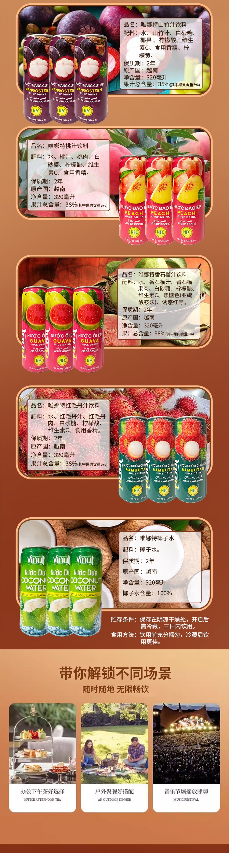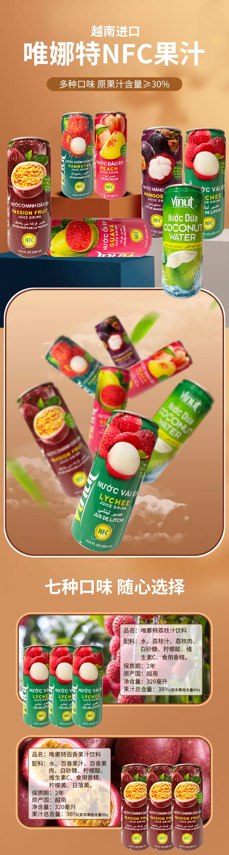 越南进口唯娜特椰子水丨百香果汁丨荔枝汁丨山竹汁丨番石榴汁丨红毛丹汁丨桃汁饮料320ml