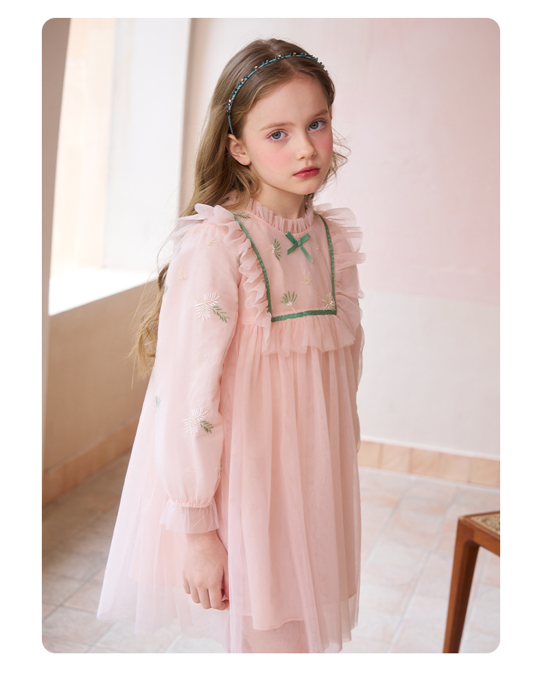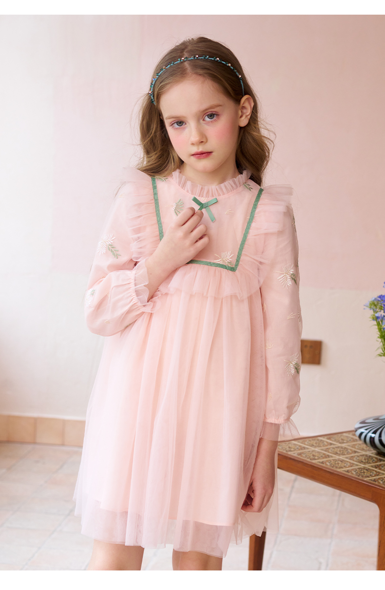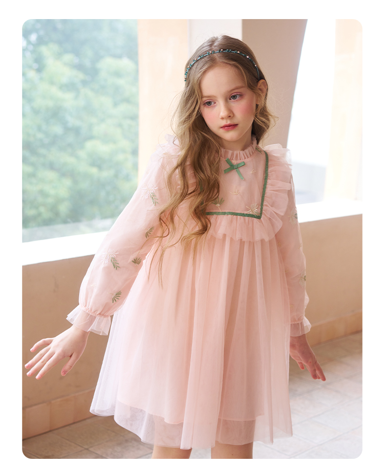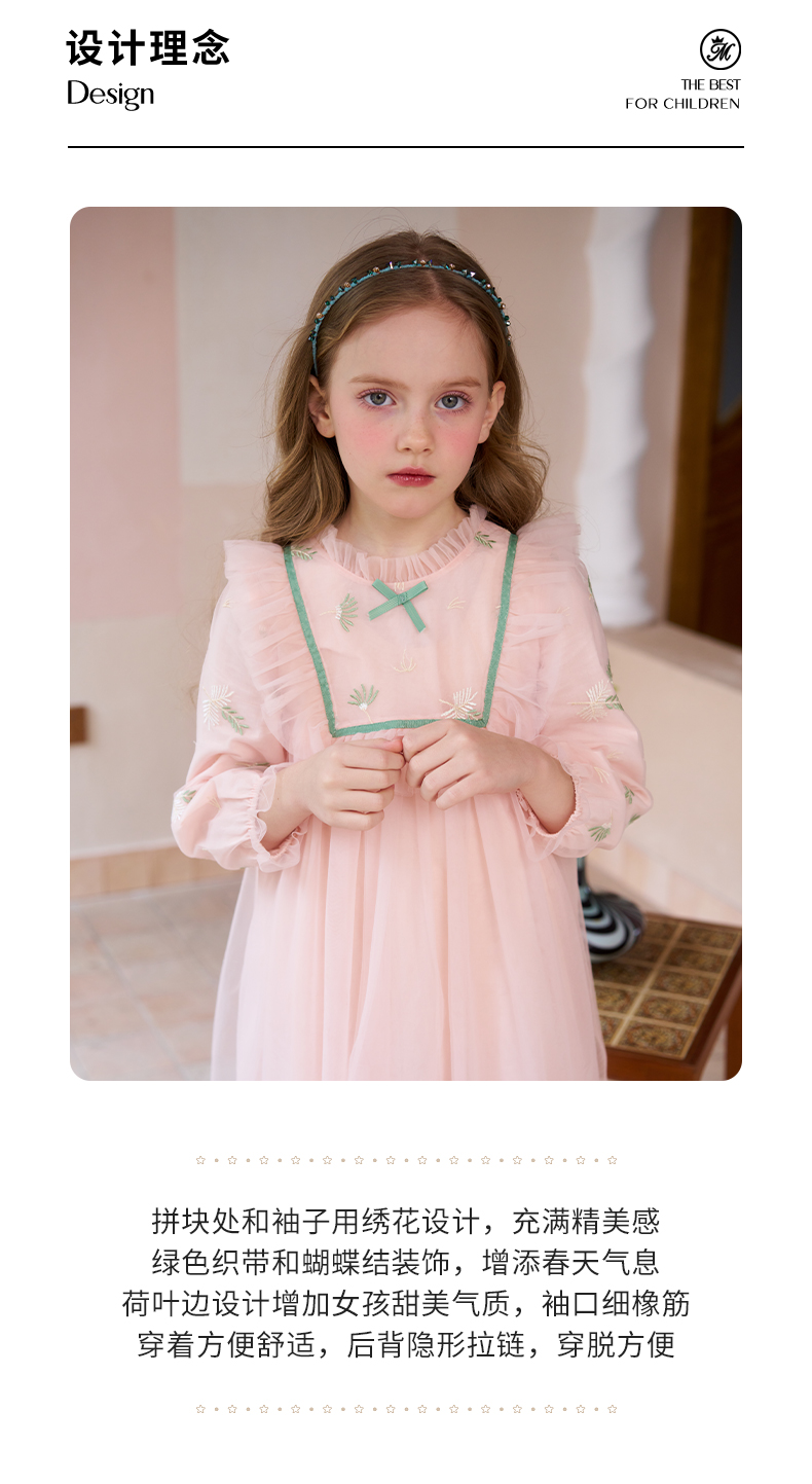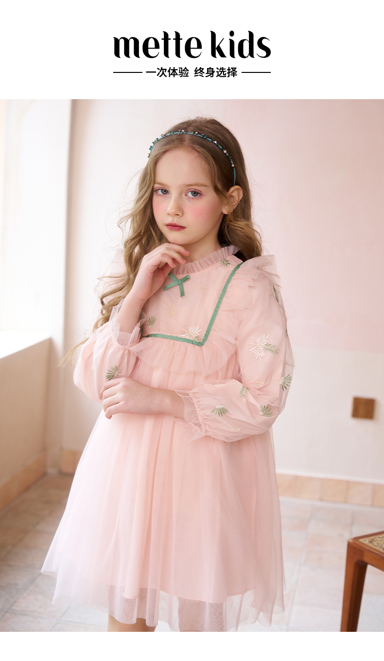 mettekids女童连衣裙春秋新款儿童粉色裙子中大童网纱公主裙童装