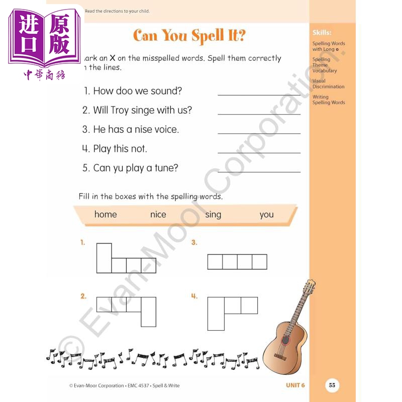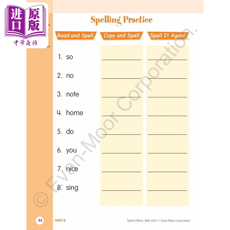 12 个彩色单元中的每一个都介绍了 8 个新的拼写单词,并包括引人入胜的写作、匹配和填空活动,以帮助儿童理解每个单词的含义和拼写。拼写单词列表识别特定的拼写模式和规则,以帮助儿童学习重要的词类。