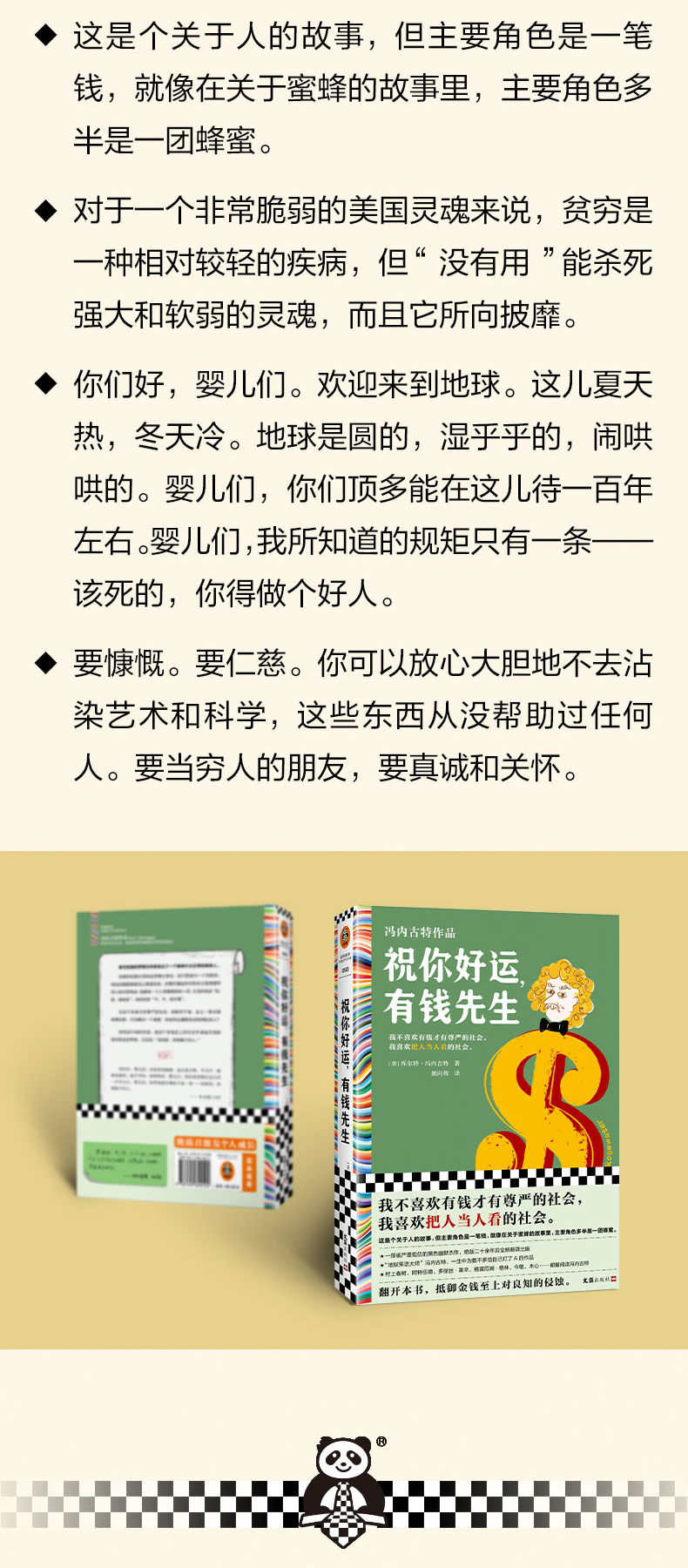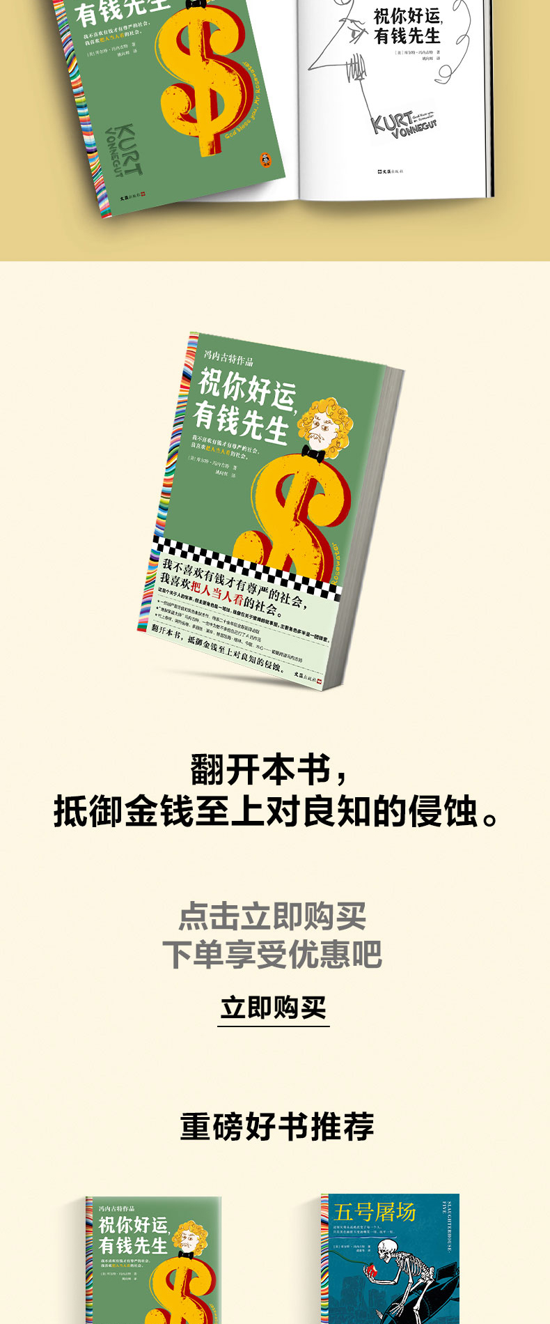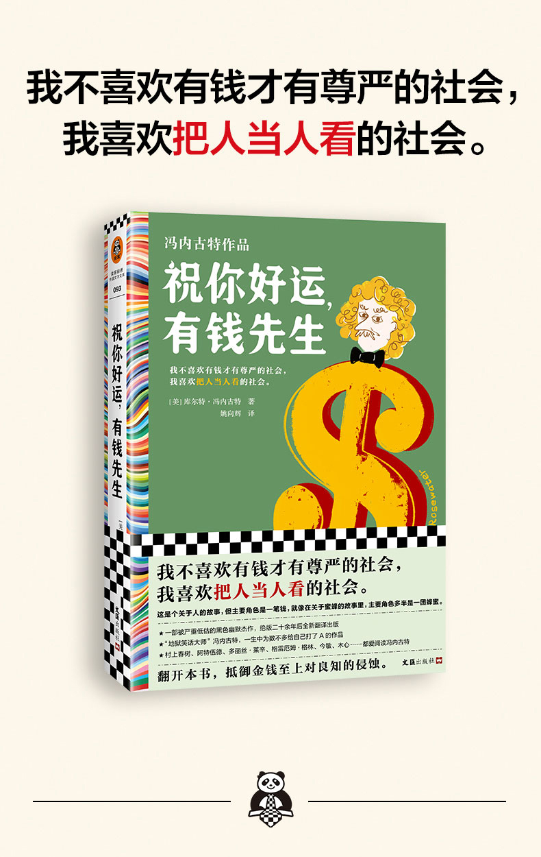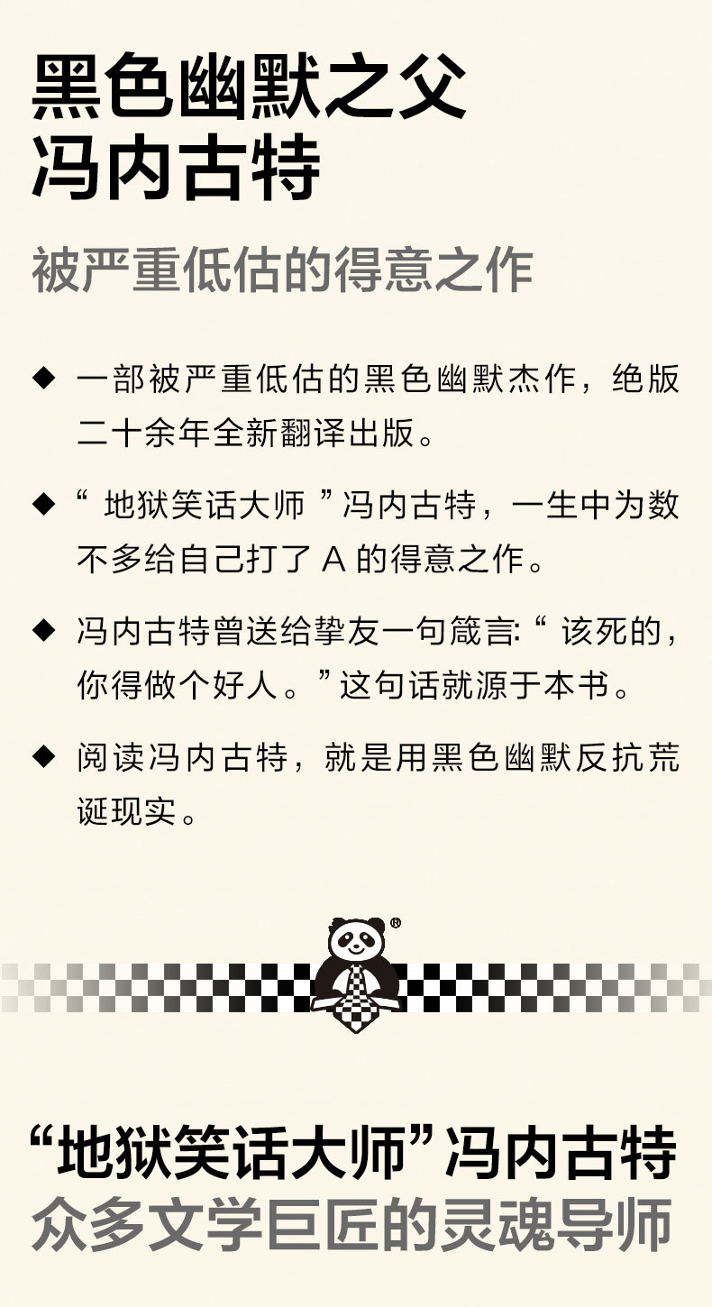 ◆ 我不喜欢有钱才有尊严的社会,我喜欢把人当人看的社会。 ◆ 黑色幽默之父冯内古特被严重低估的小说,少量20余年重新翻译出版! ◆ 村上春树、阿特伍德、波拉尼奥、格雷厄姆·格林、多丽丝·莱辛、今敏、朴赞郁、木心、麦家……都爱阅读冯内古特。 ◆ 作者冯内古特是美国几代青年人的灵魂导师,他的书在青年中几乎人手一本。 ◆ “冯内古特的小说既滑稽又悲伤,他的痛苦从不严肃,他是独特的。”——多丽丝•莱辛(诺贝尔文学奖得主) ◆ 冯内古特一生中为数不多给自己打了A的小说! ◆ 阅读冯内古特,就是用黑色幽默反抗荒诞现实。 ◆外国文学读彩条,大师经典任你挑。