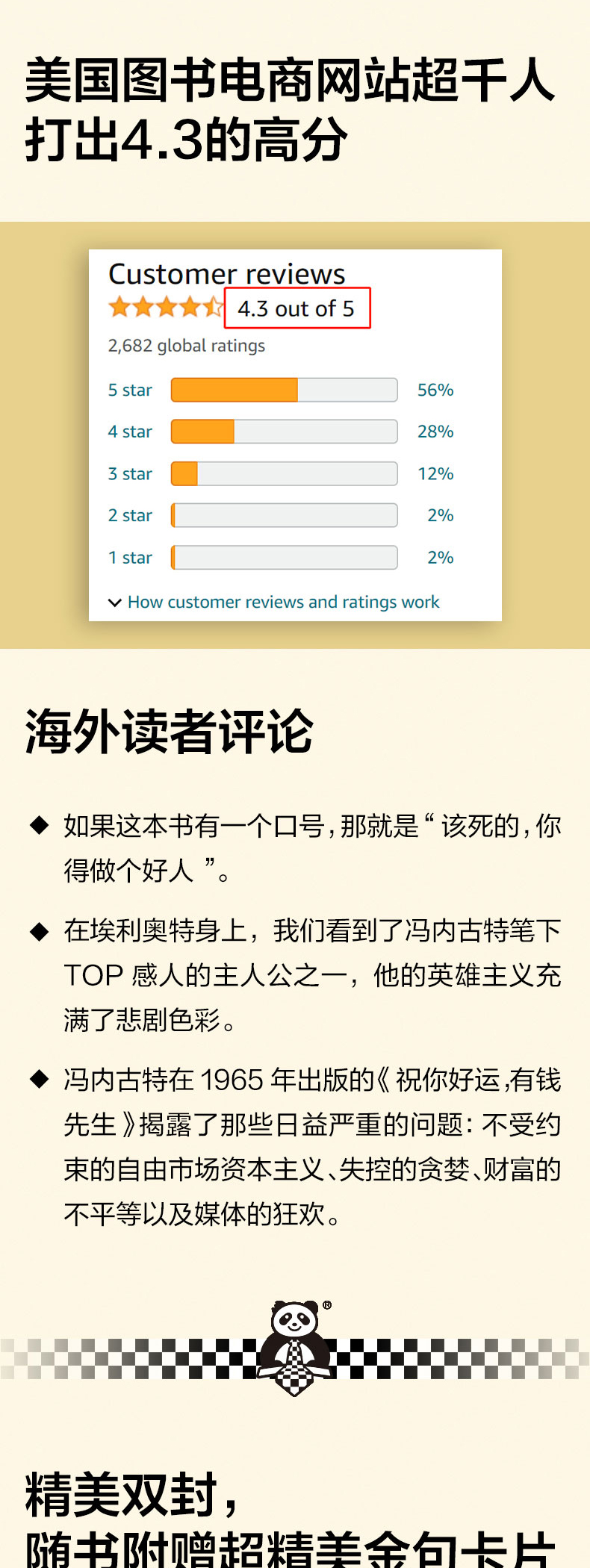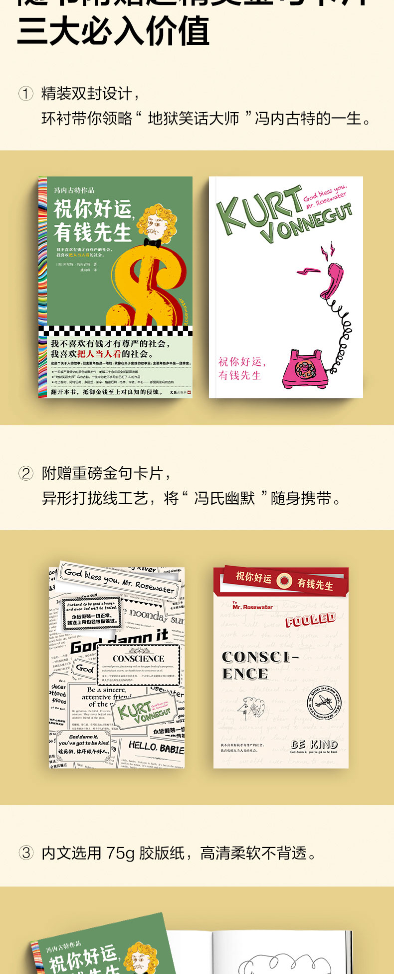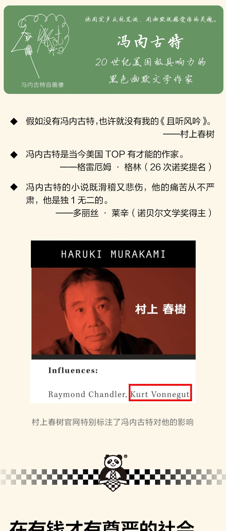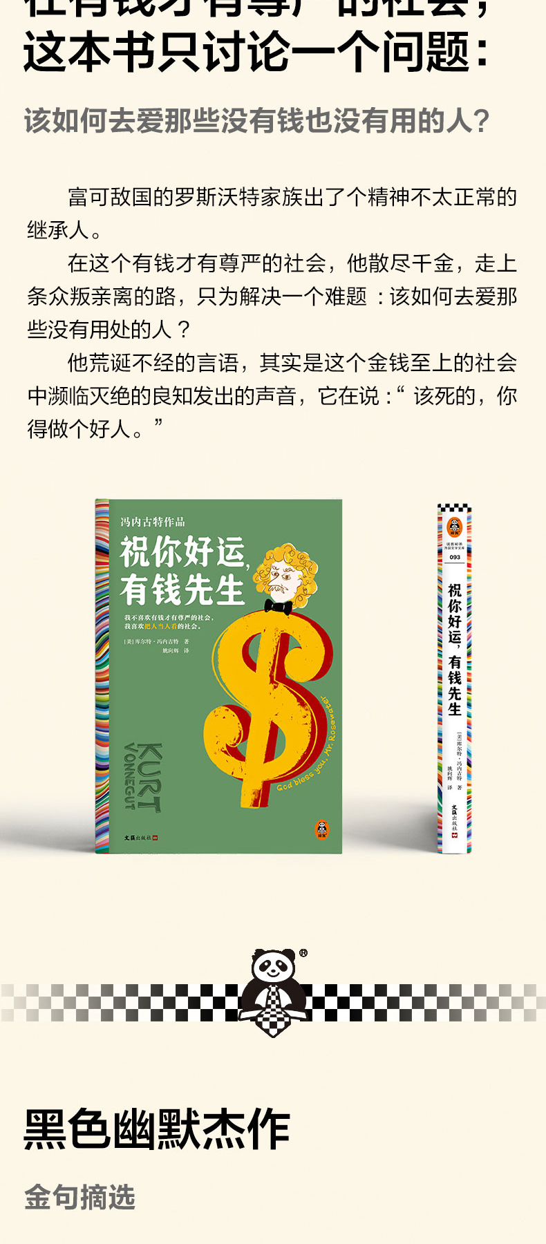 ◆ 我不喜欢有钱才有尊严的社会,我喜欢把人当人看的社会。 ◆ 黑色幽默之父冯内古特被严重低估的小说,少量20余年重新翻译出版! ◆ 村上春树、阿特伍德、波拉尼奥、格雷厄姆·格林、多丽丝·莱辛、今敏、朴赞郁、木心、麦家……都爱阅读冯内古特。 ◆ 作者冯内古特是美国几代青年人的灵魂导师,他的书在青年中几乎人手一本。 ◆ “冯内古特的小说既滑稽又悲伤,他的痛苦从不严肃,他是独特的。”——多丽丝•莱辛(诺贝尔文学奖得主) ◆ 冯内古特一生中为数不多给自己打了A的小说! ◆ 阅读冯内古特,就是用黑色幽默反抗荒诞现实。 ◆外国文学读彩条,大师经典任你挑。